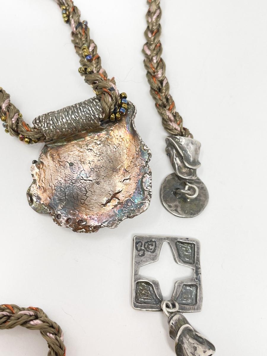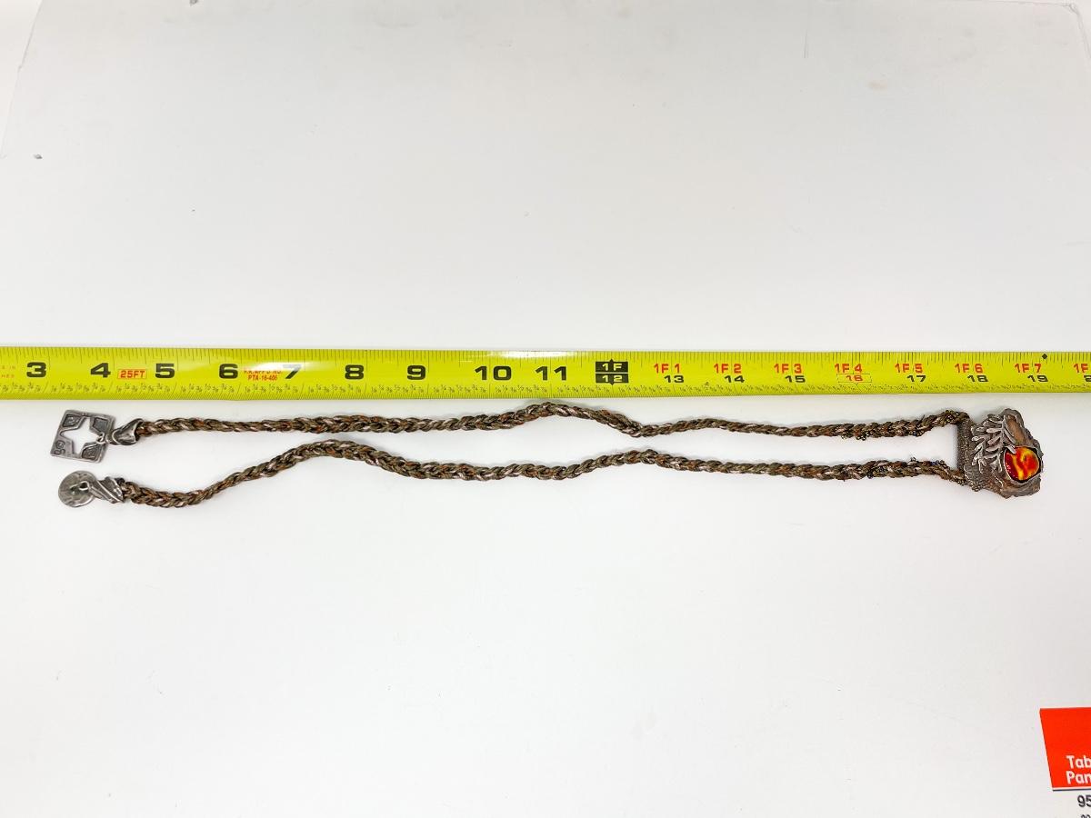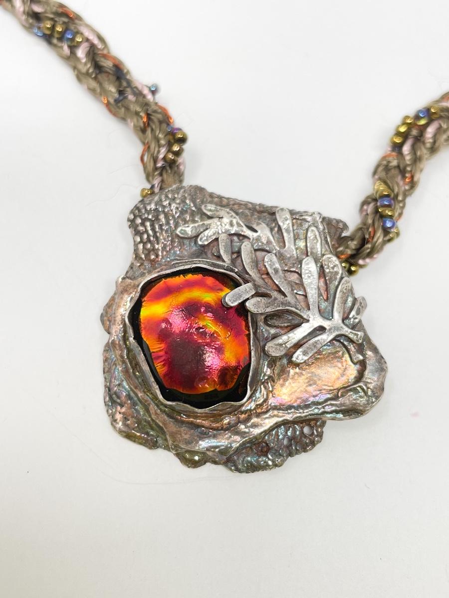 Very unique and cool piece. Colorful piece of stone? Set in silver on a beaded cord. Marked with “S©“ on the back.