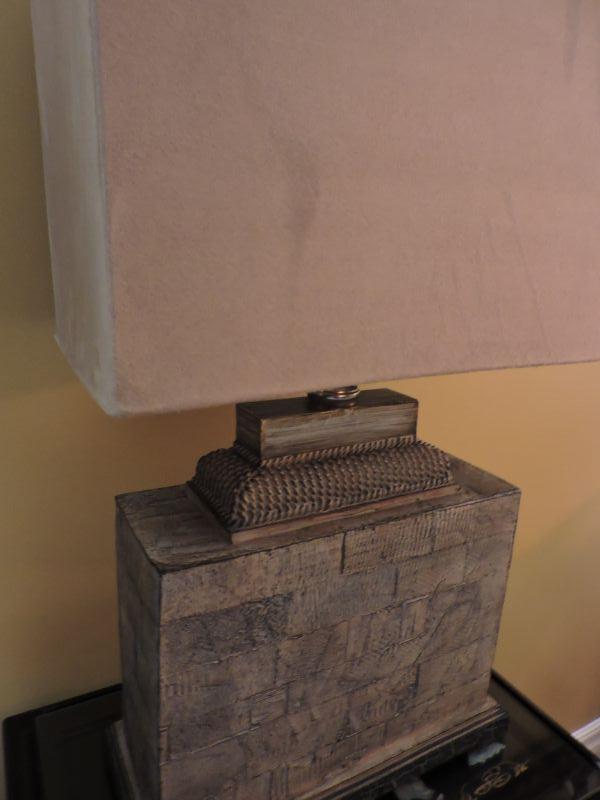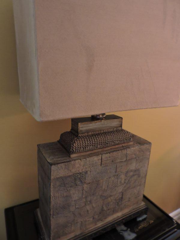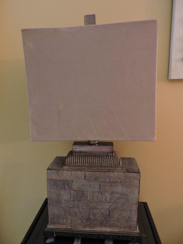 With a rectangle base and square shaped shade, this lamp stands out! It's quite heavy, although I'm unsure if it's plaster or resin. There is a break in one corner, but this could easily be fixed, and isn't visible when just put back in place. Lamp stands 31". **Please read Terms and Conditions before placing a bid. Pick up is Wednesday, September 25 from 4pm to 7pm and Saturday, September 28 from 9am to 1pm in Williamstown, NJ. All sales are final. All sales are as is, where is. Please review all photos. Any props included in photos are not included in listing. All measurements are approximate.