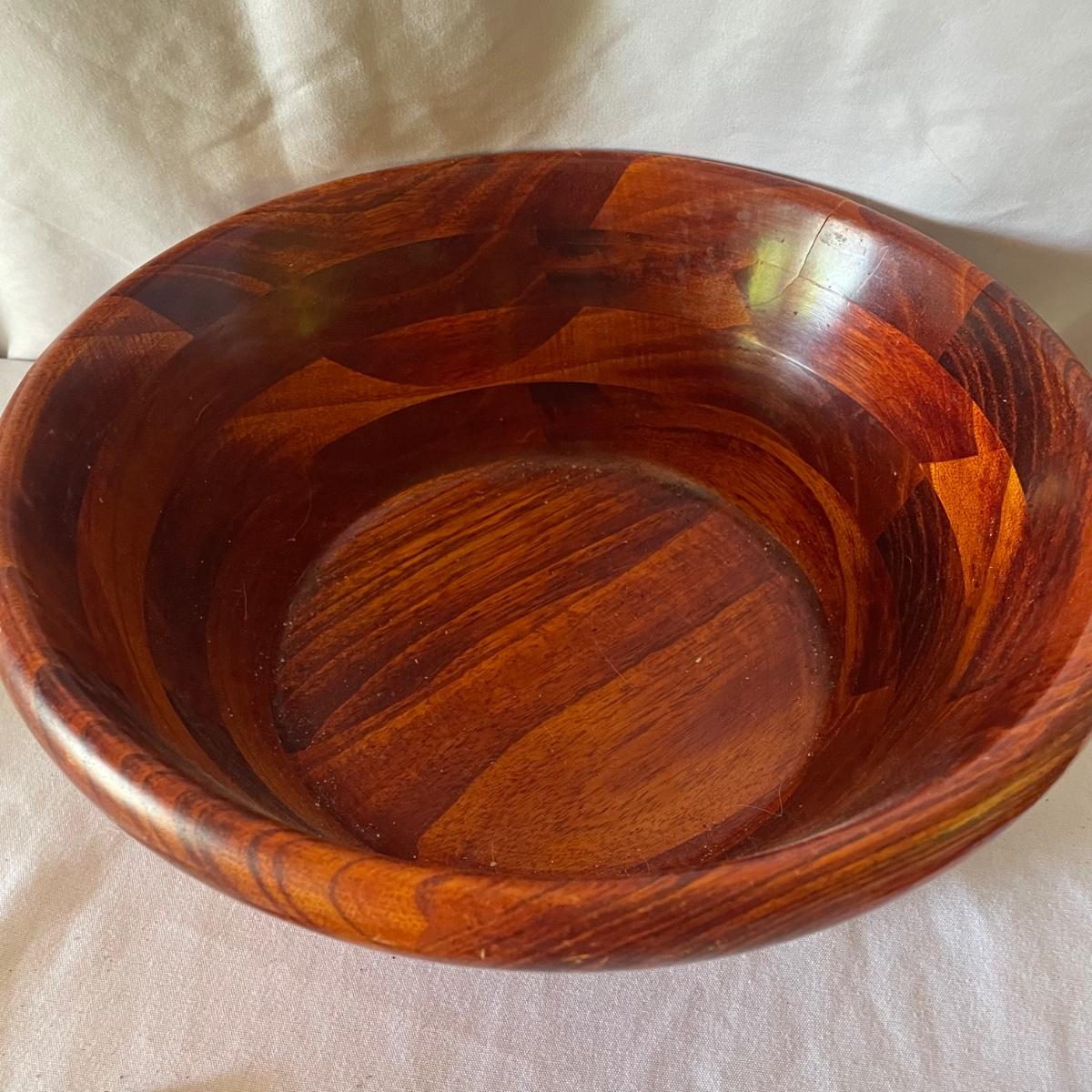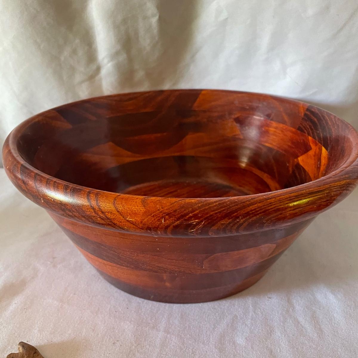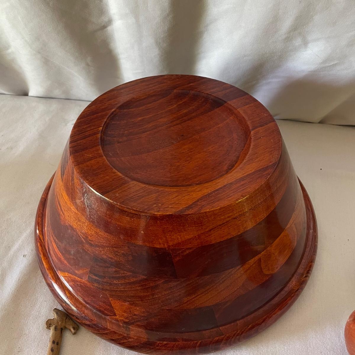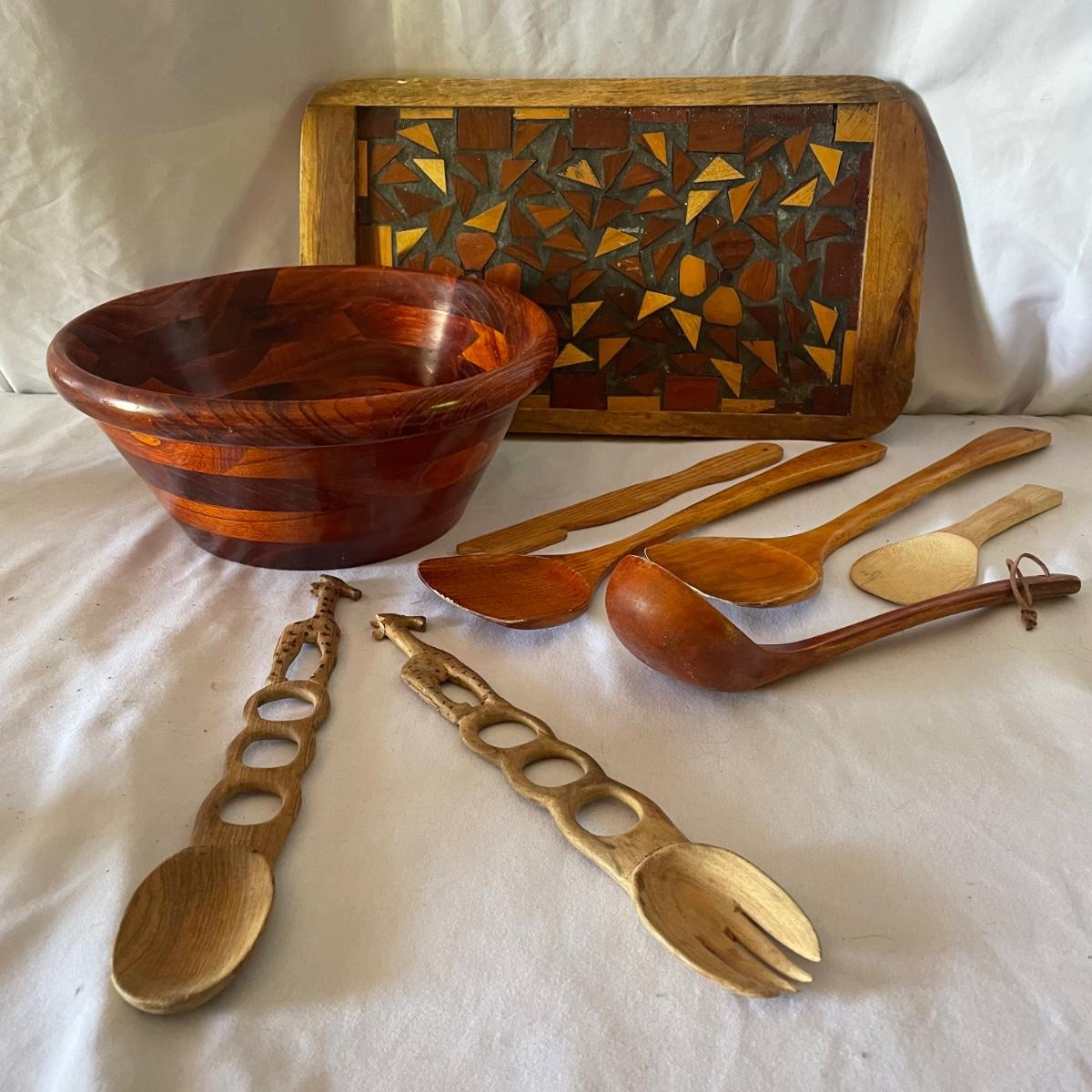 Nine wooden items in this lot that includes a large salad bowl, 7 serving utensils and a lovely tray that has wood pieces inlaid into the cork backed wood base. The tray measures 10” x 18” x 1”.