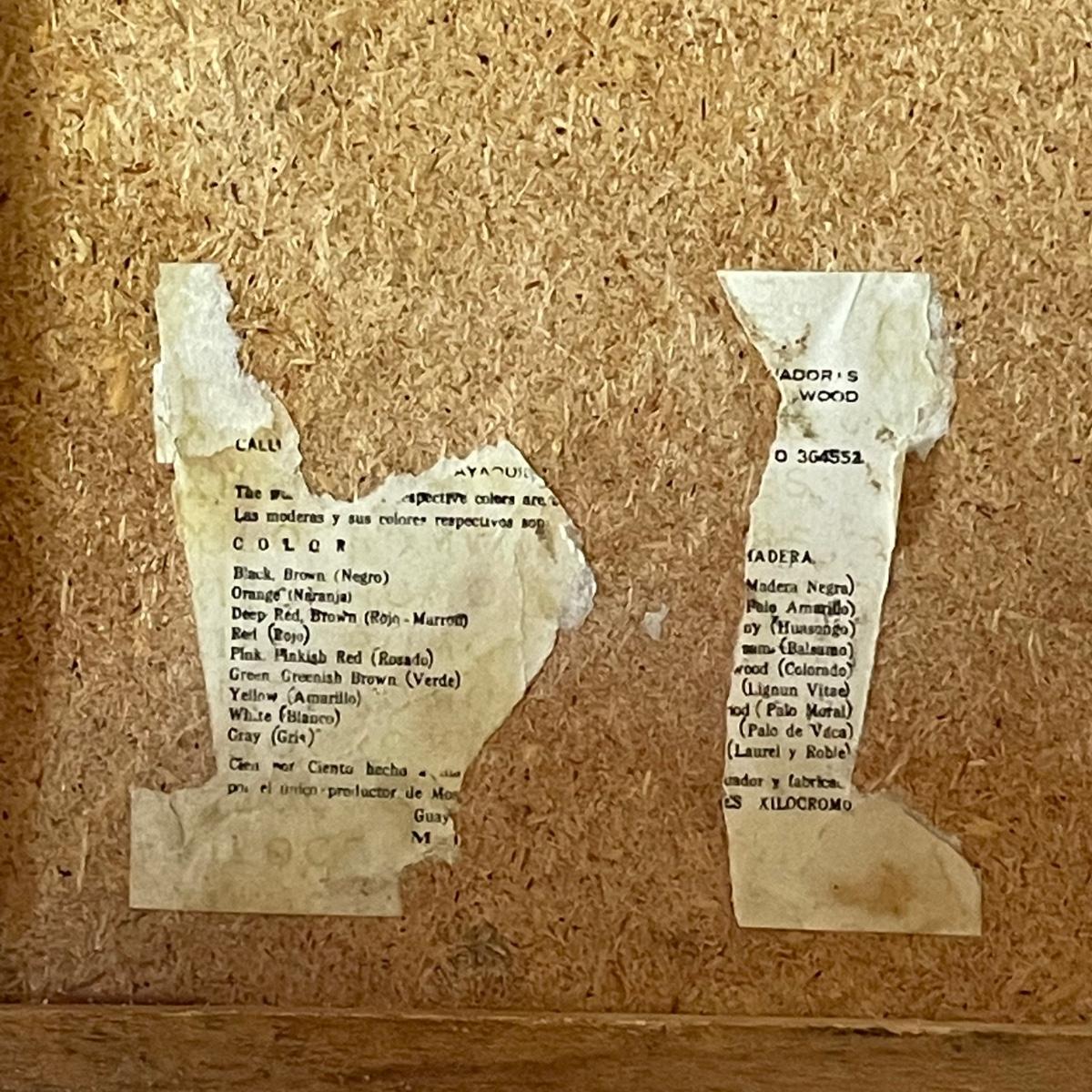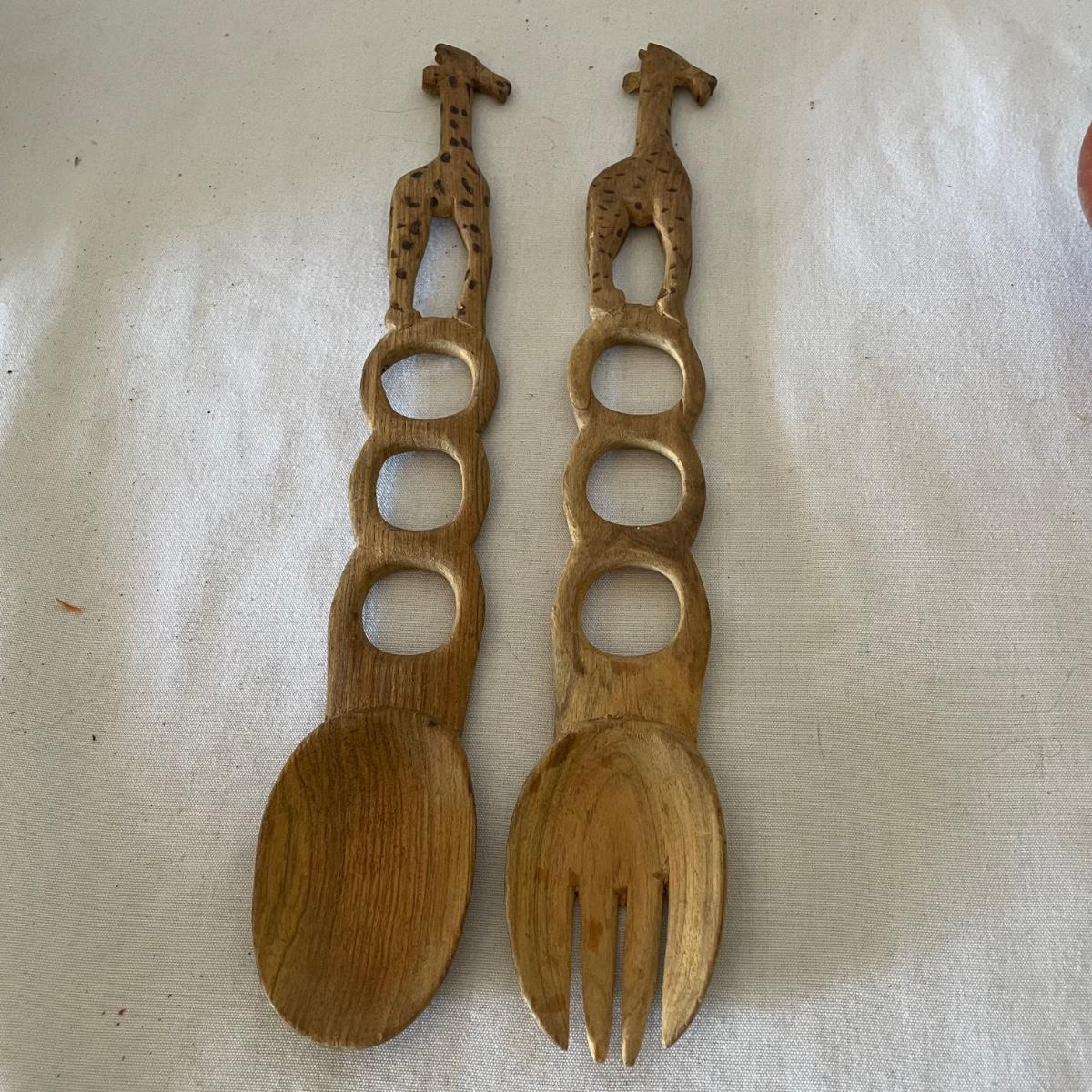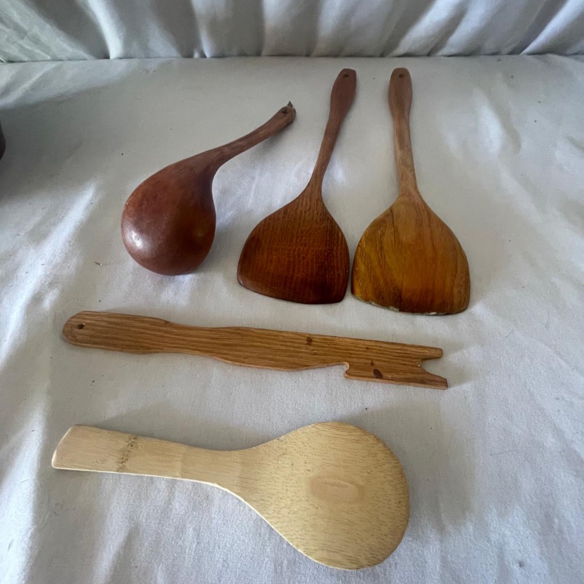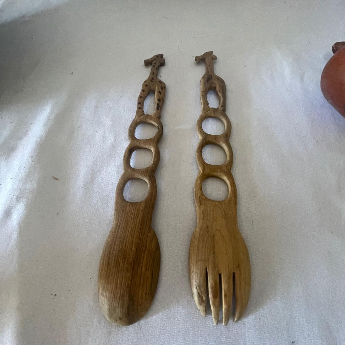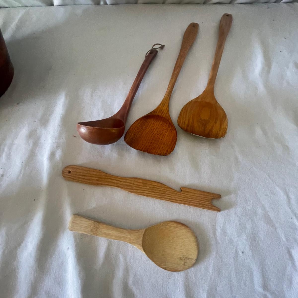Nine wooden items in this lot that includes a large salad bowl, 7 serving utensils and a lovely tray that has wood pieces inlaid into the cork backed wood base. The tray measures 10” x 18” x 1”.