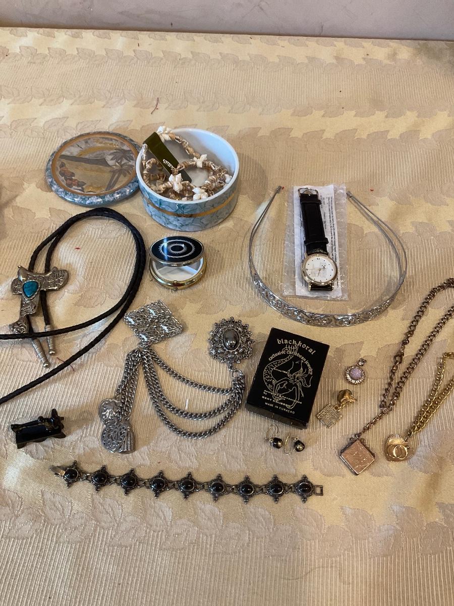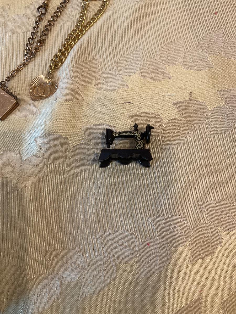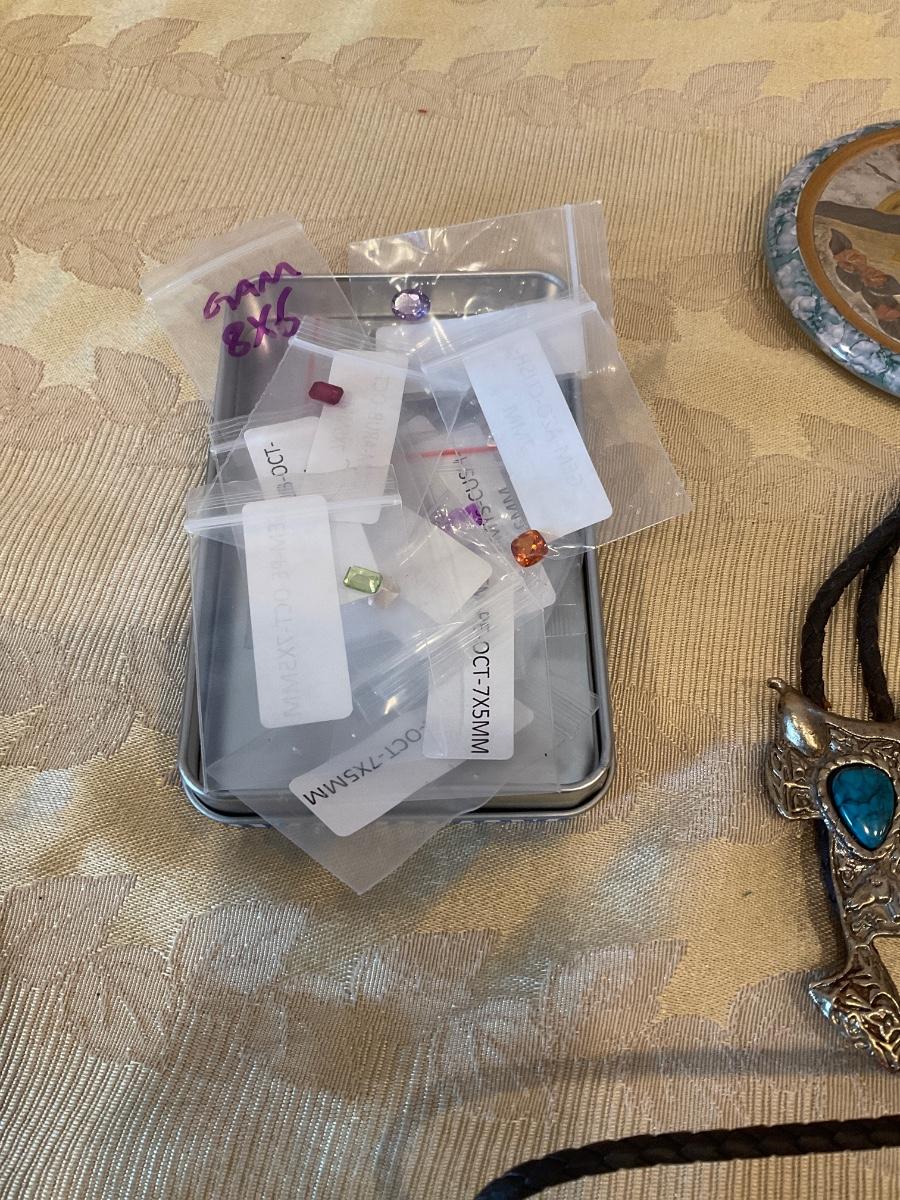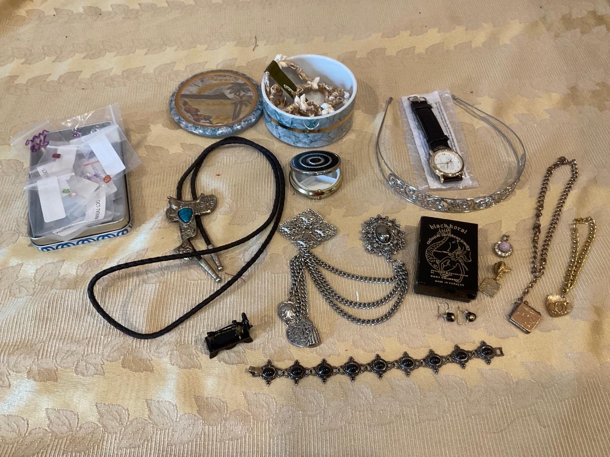 Some vintage pieces, cut gems, Hawaii jewelry holder, cute sewin machine figure