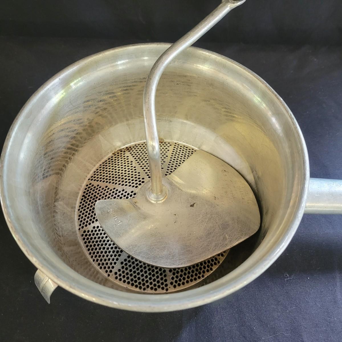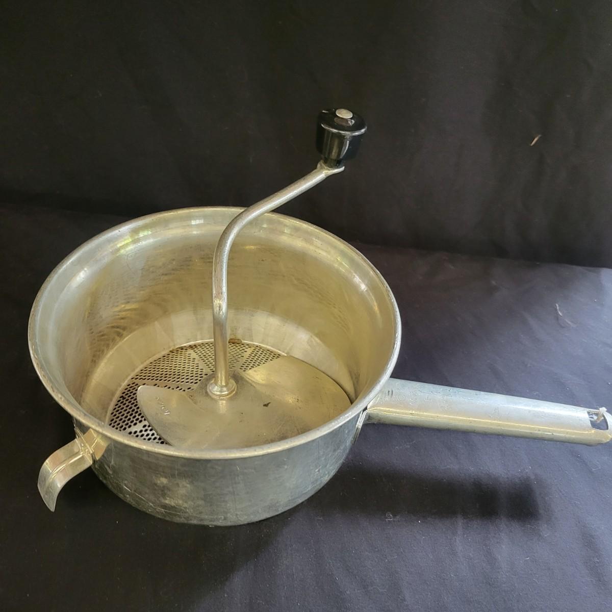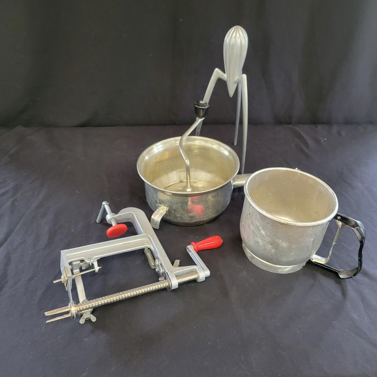 A Pampered Chef apple peeler, a flour sifter, a potato ricer, and a very unique juicer. Juicer measures approximately 5"W x 12"H. Local pickup only