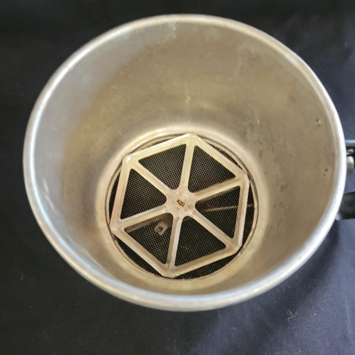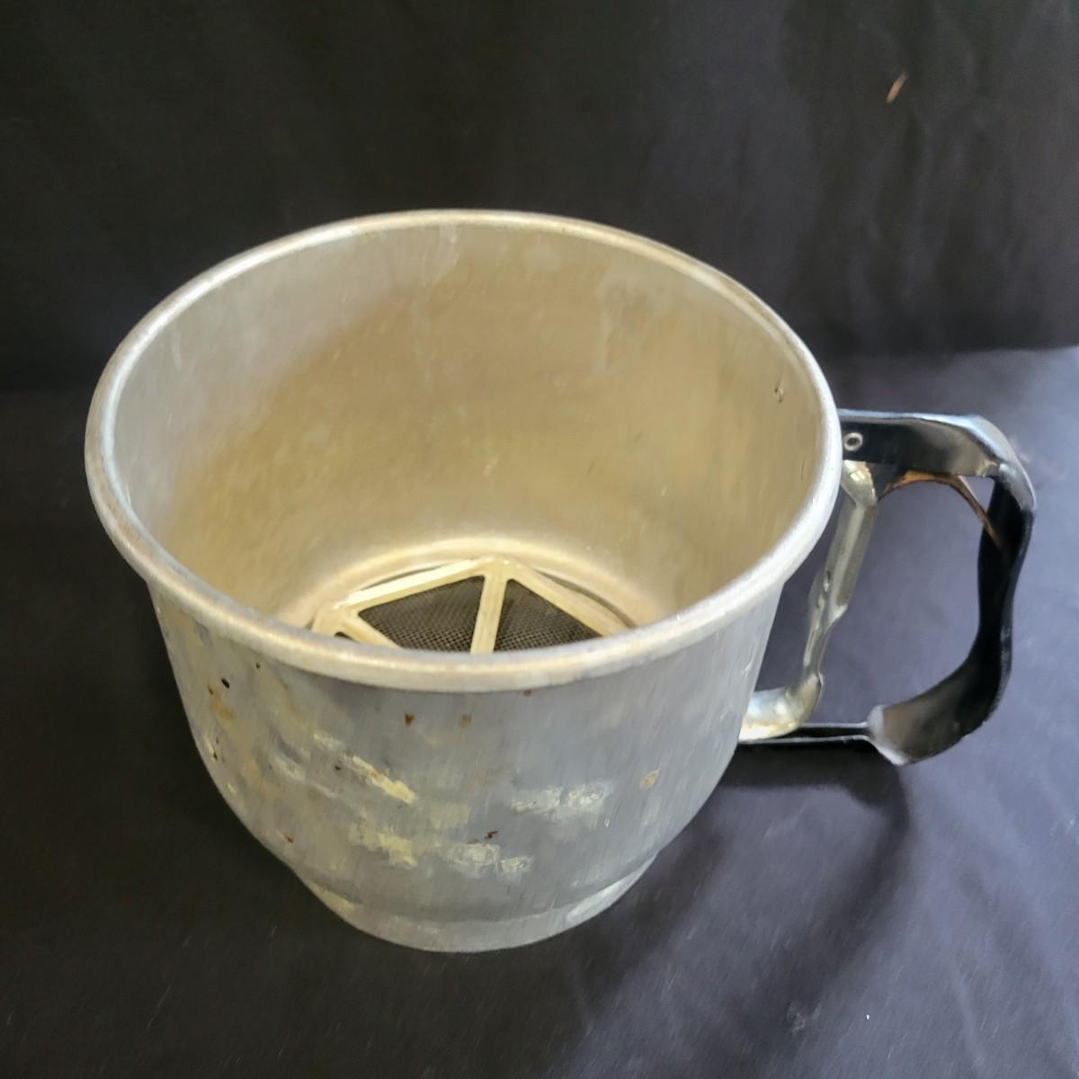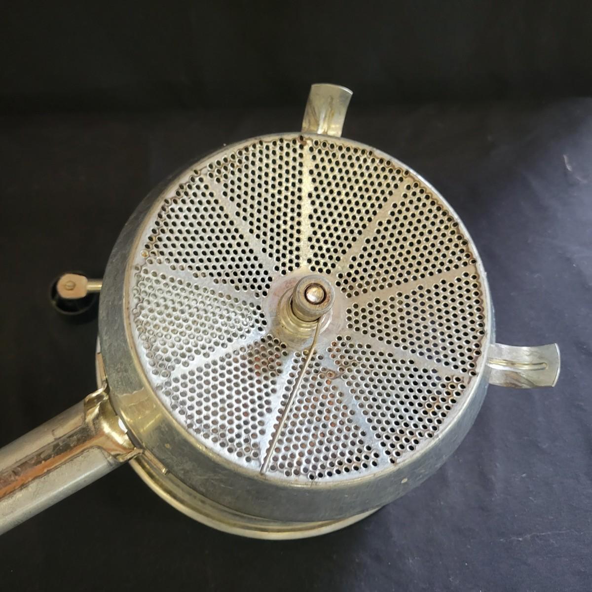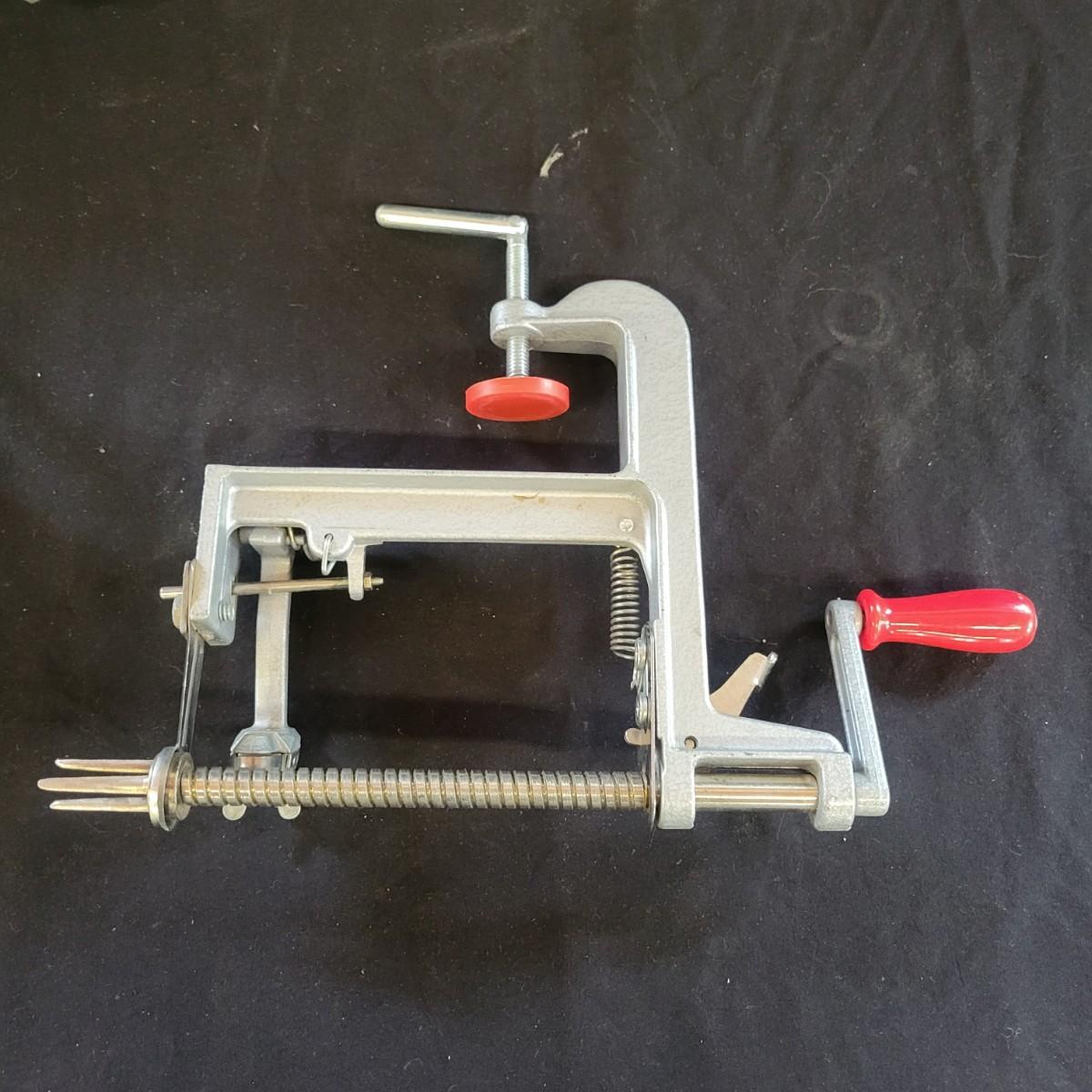 A Pampered Chef apple peeler, a flour sifter, a potato ricer, and a very unique juicer. Juicer measures approximately 5"W x 12"H. Local pickup only