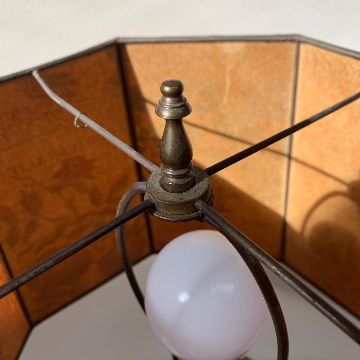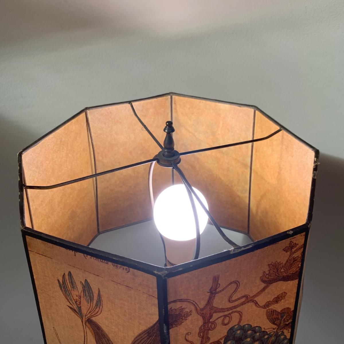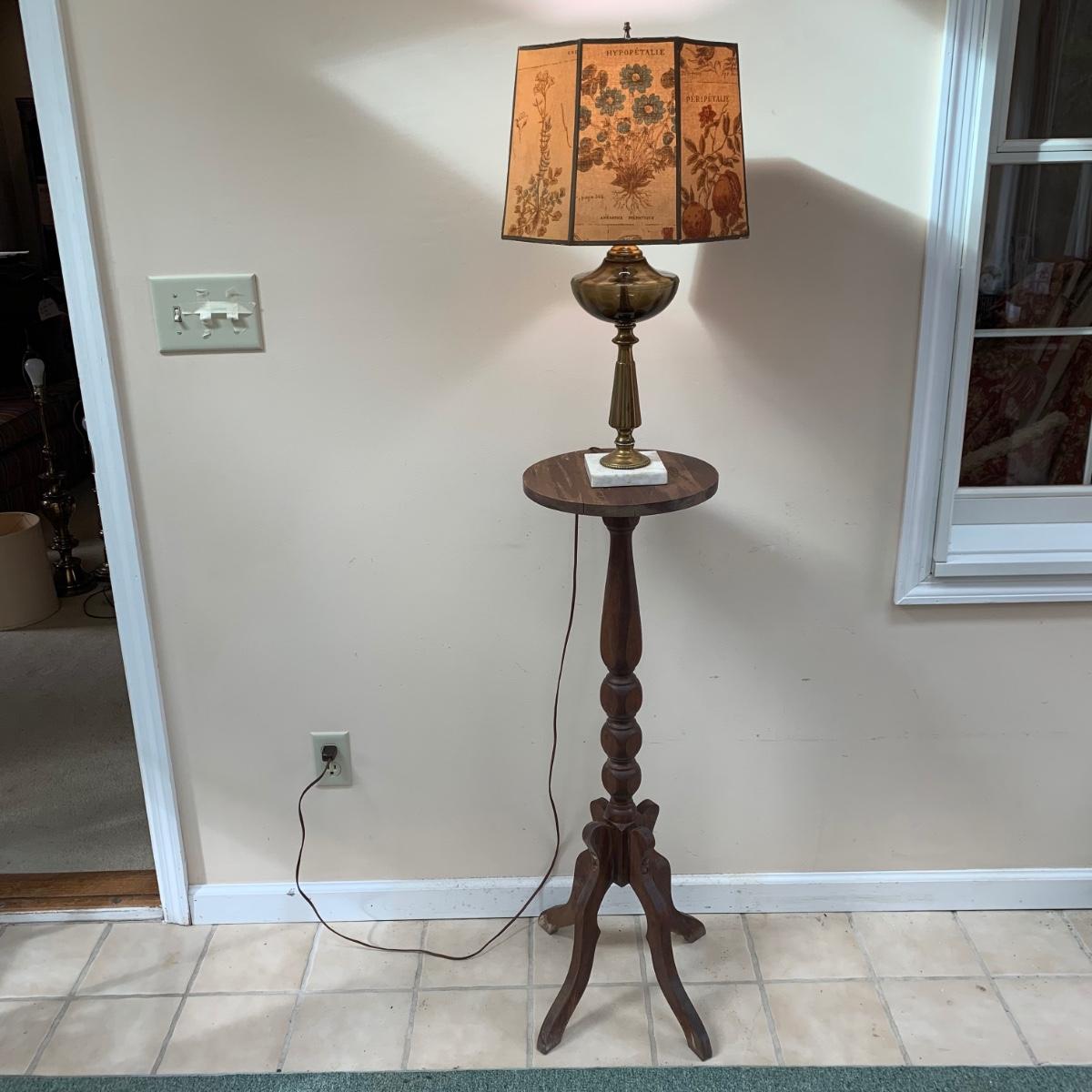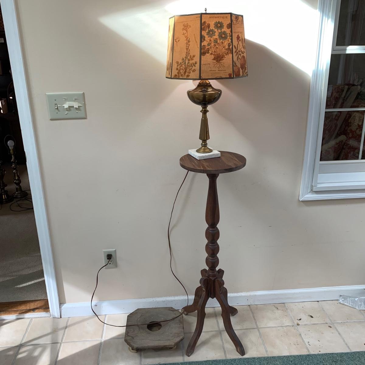 Unique lamp with a base made of marble and a metal and glass body. Lamp comes with a lampshade that features a variety of plants and animals. Lamp base is 4.5”sq. and lamp is 25” tall. Lamp functioned when tested. Two wood plant stands are also included. The tall one has a tabletop that is 12”d and the stand is 38” tall. Small stand is on wheels. All items are sturdy and functional, but do show some wear. See photos for details.