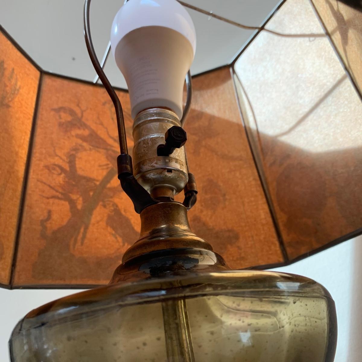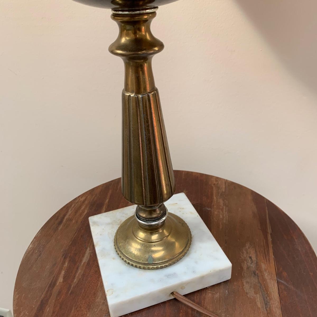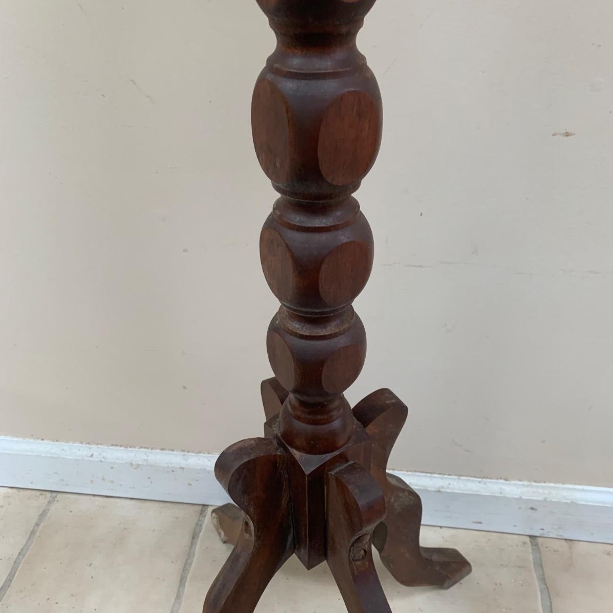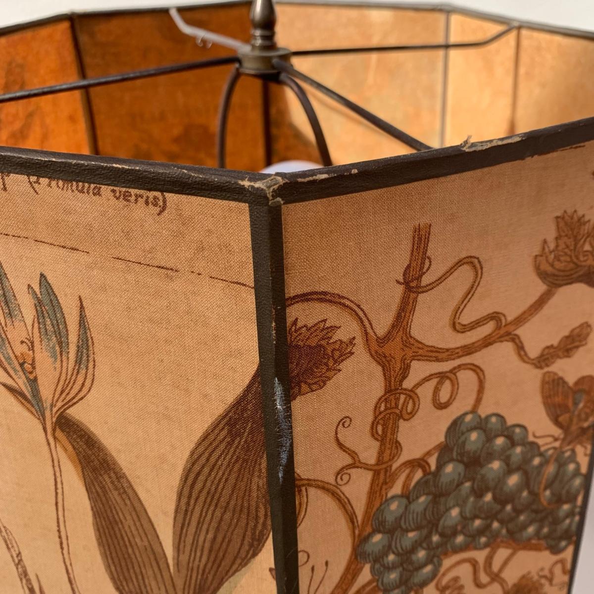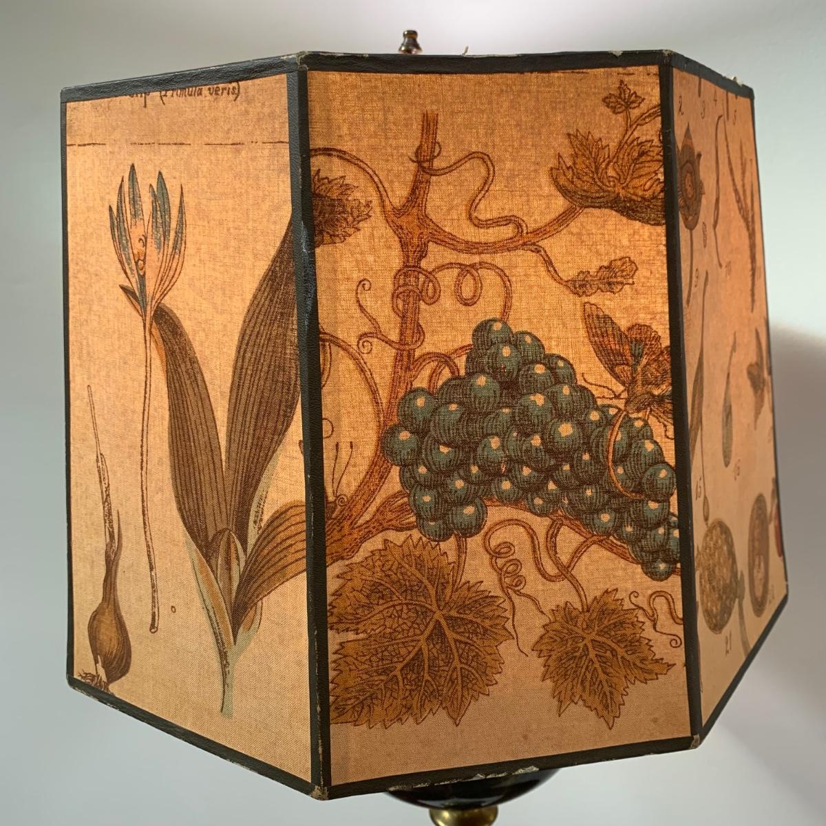 Unique lamp with a base made of marble and a metal and glass body. Lamp comes with a lampshade that features a variety of plants and animals. Lamp base is 4.5”sq. and lamp is 25” tall. Lamp functioned when tested. Two wood plant stands are also included. The tall one has a tabletop that is 12”d and the stand is 38” tall. Small stand is on wheels. All items are sturdy and functional, but do show some wear. See photos for details.