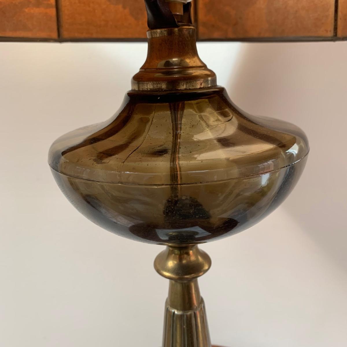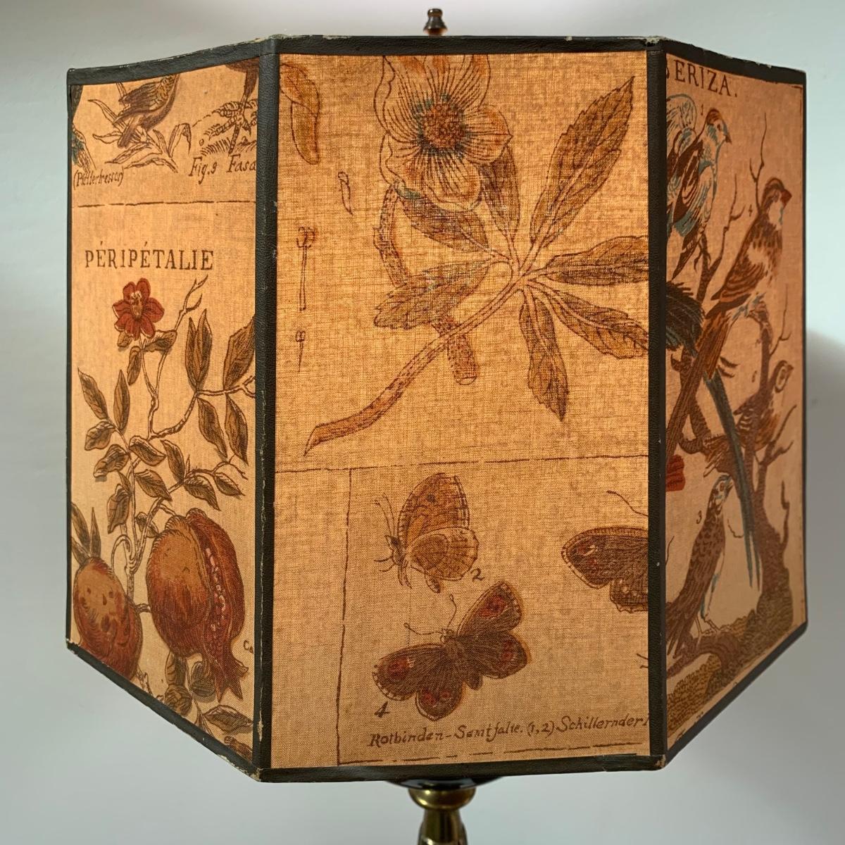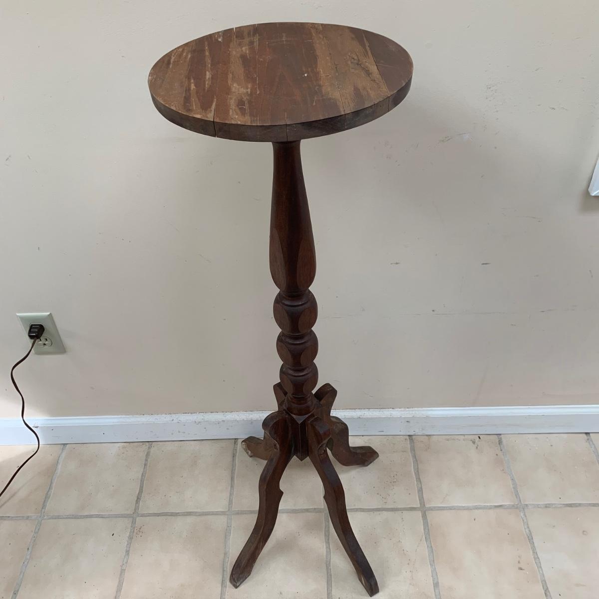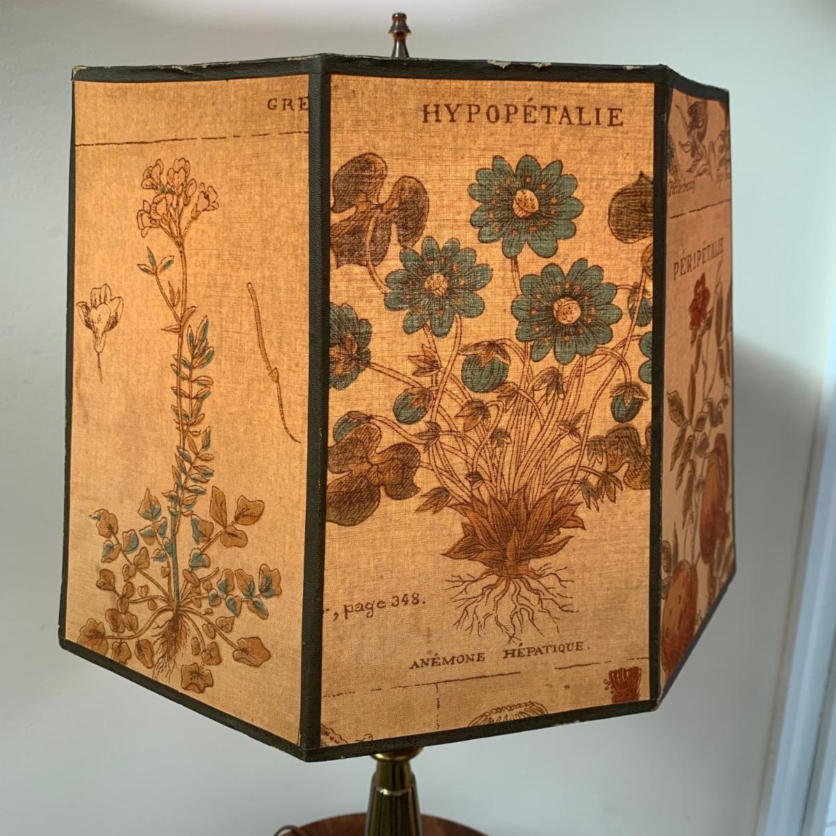 Unique lamp with a base made of marble and a metal and glass body. Lamp comes with a lampshade that features a variety of plants and animals. Lamp base is 4.5”sq. and lamp is 25” tall. Lamp functioned when tested. Two wood plant stands are also included. The tall one has a tabletop that is 12”d and the stand is 38” tall. Small stand is on wheels. All items are sturdy and functional, but do show some wear. See photos for details.