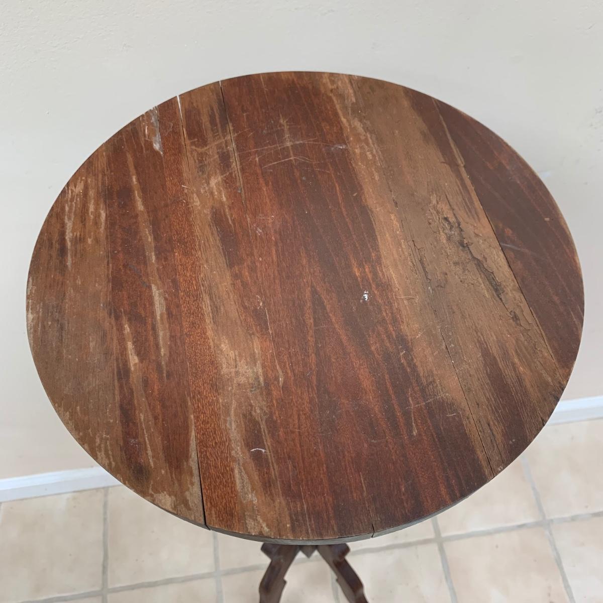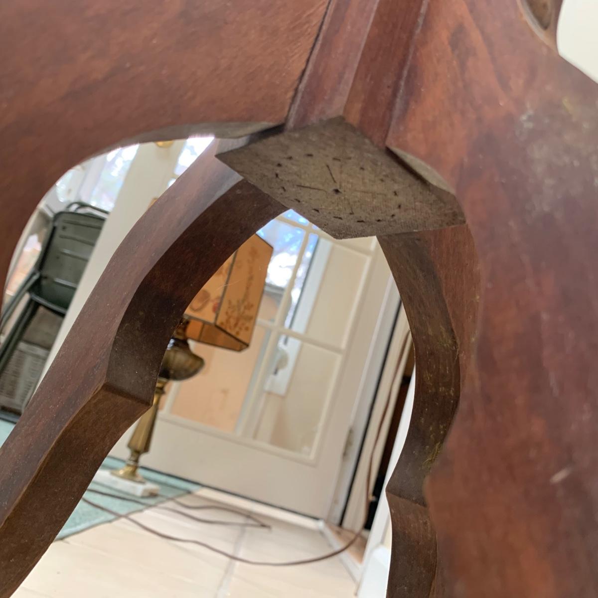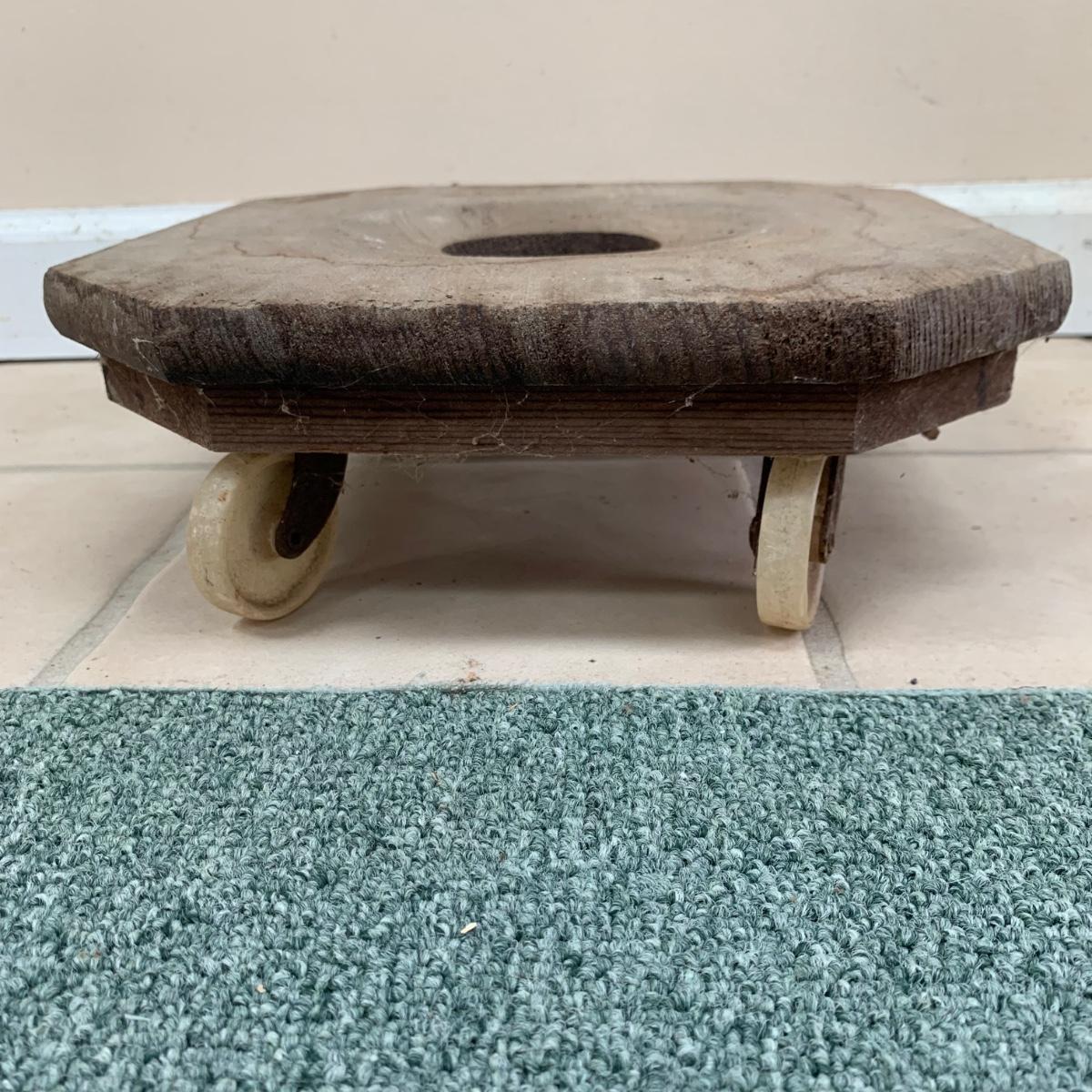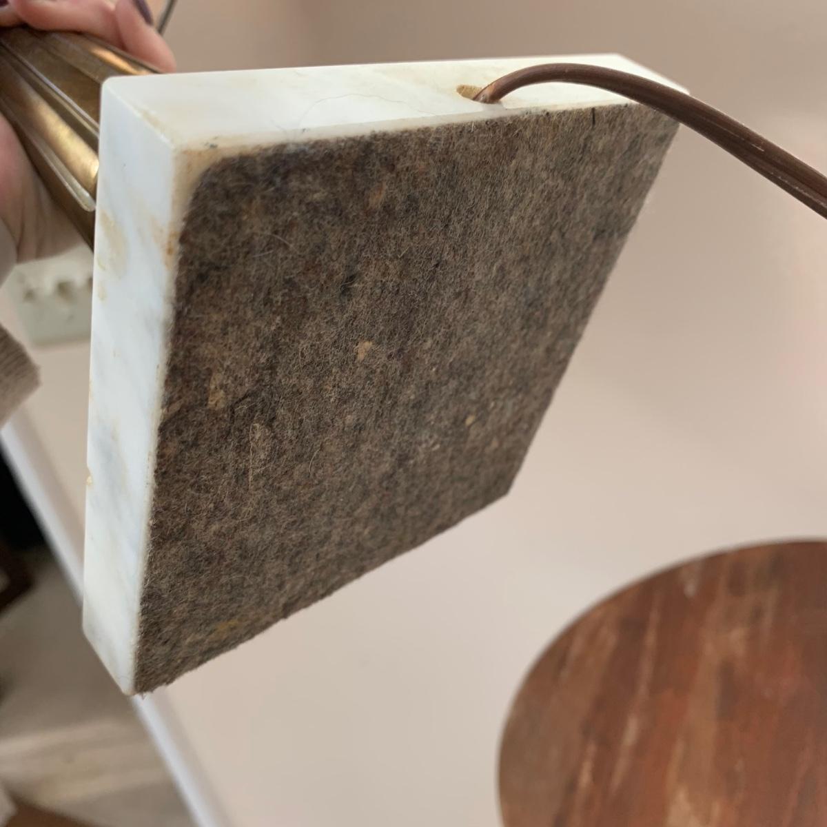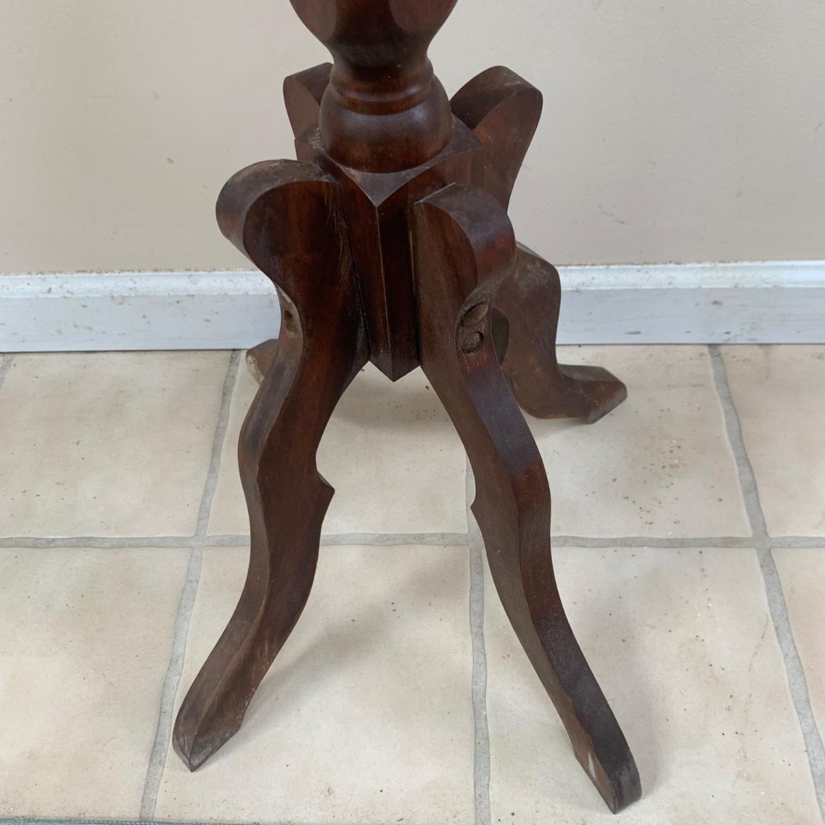 Unique lamp with a base made of marble and a metal and glass body. Lamp comes with a lampshade that features a variety of plants and animals. Lamp base is 4.5”sq. and lamp is 25” tall. Lamp functioned when tested. Two wood plant stands are also included. The tall one has a tabletop that is 12”d and the stand is 38” tall. Small stand is on wheels. All items are sturdy and functional, but do show some wear. See photos for details.