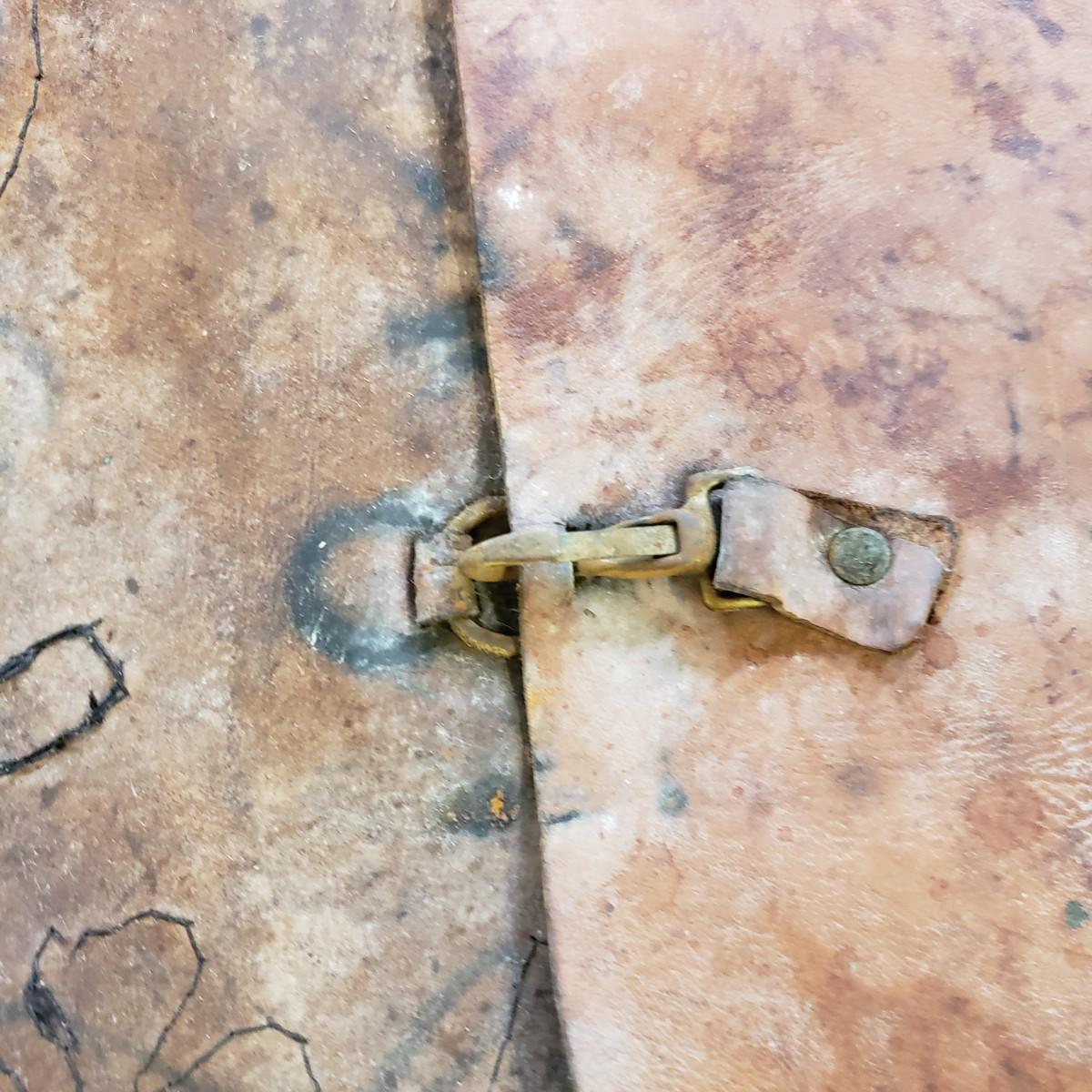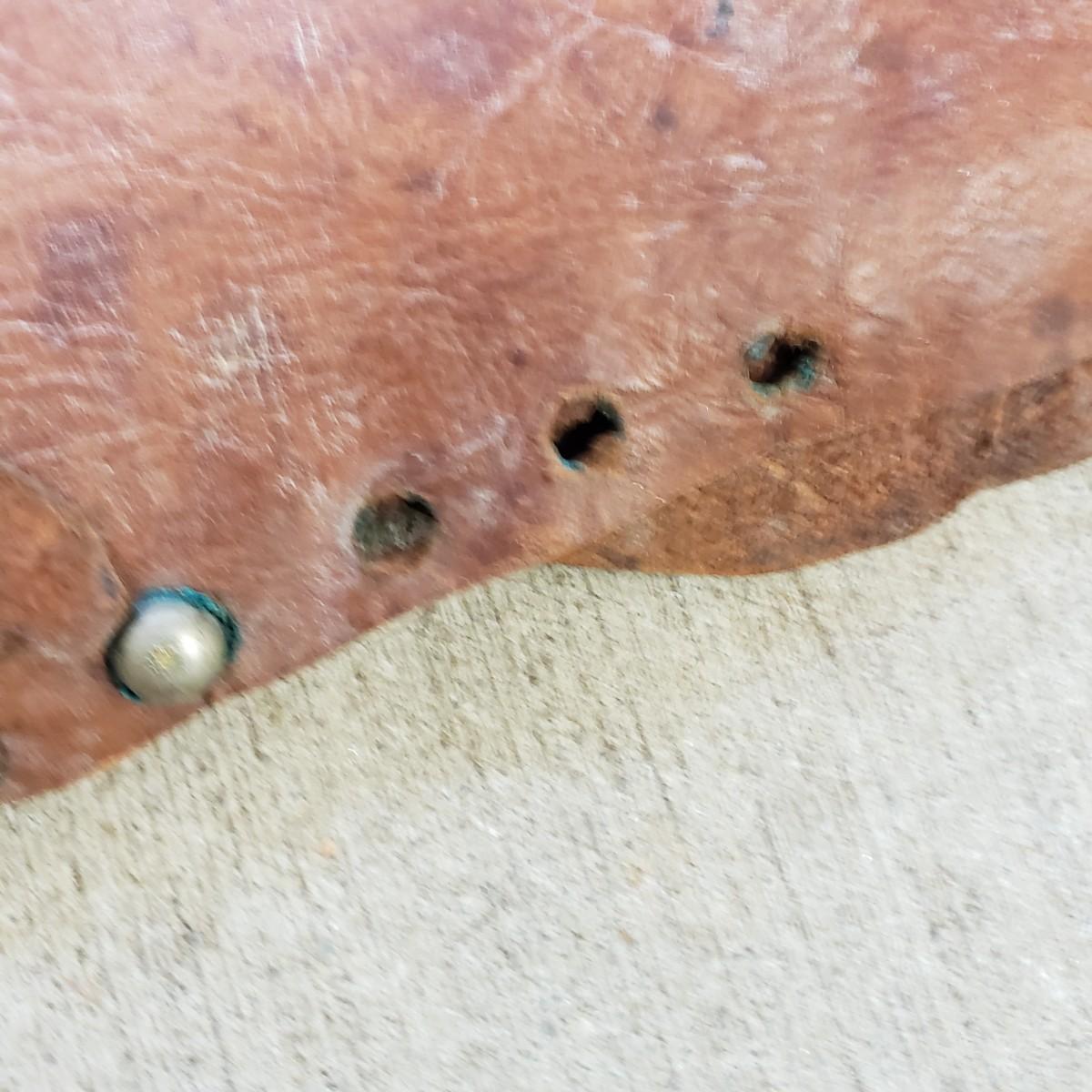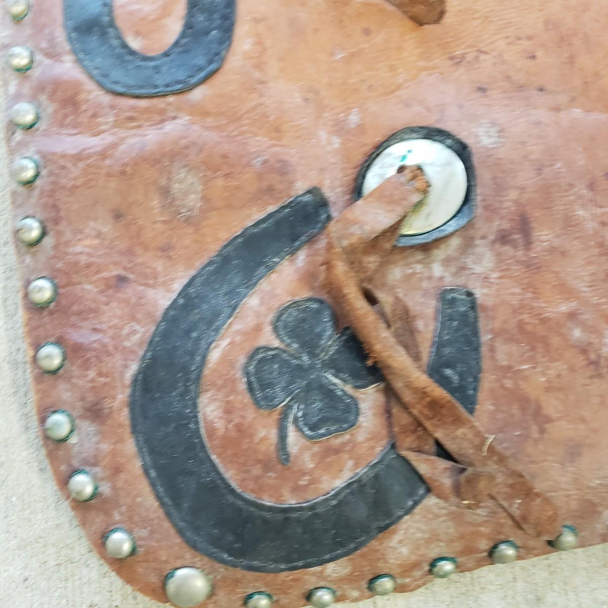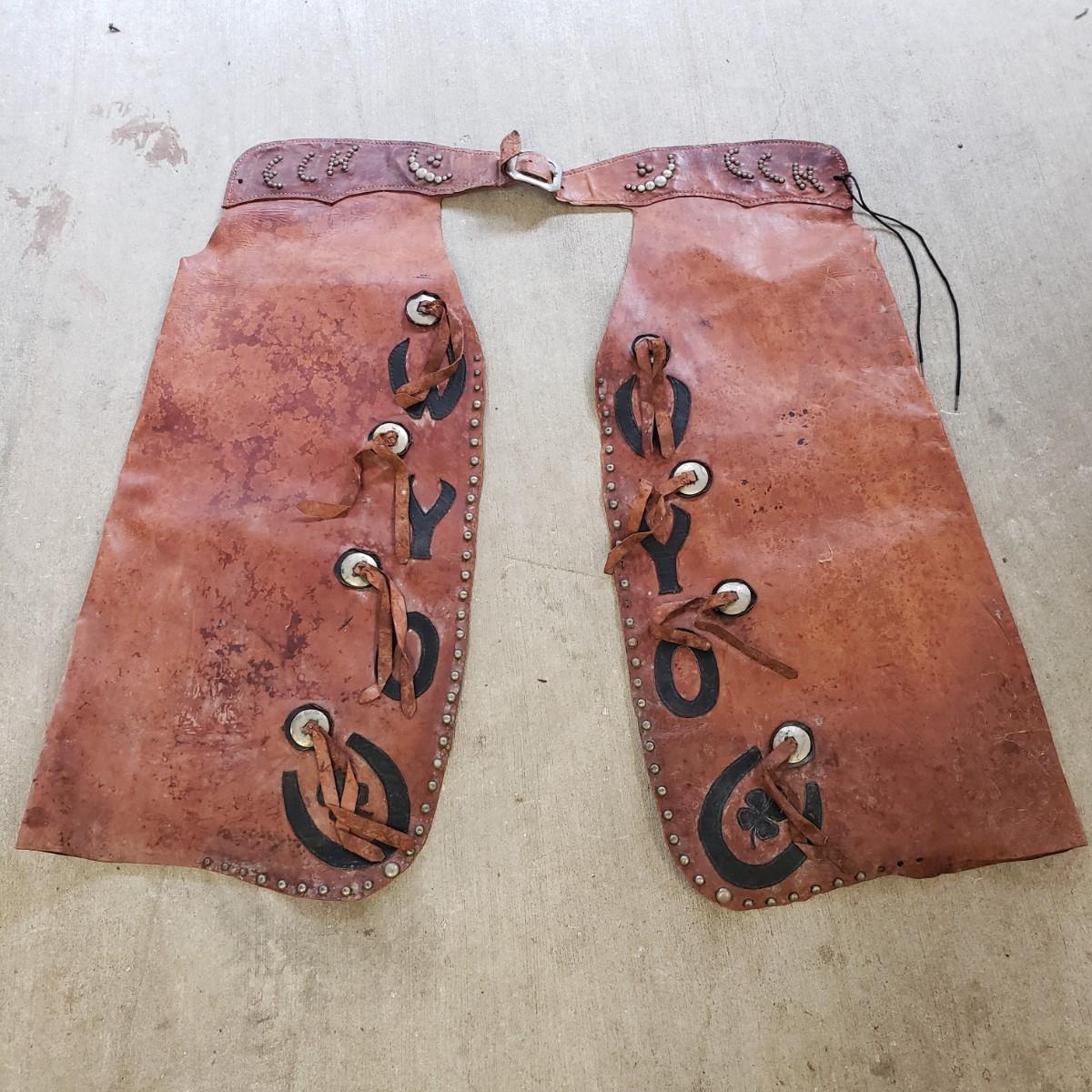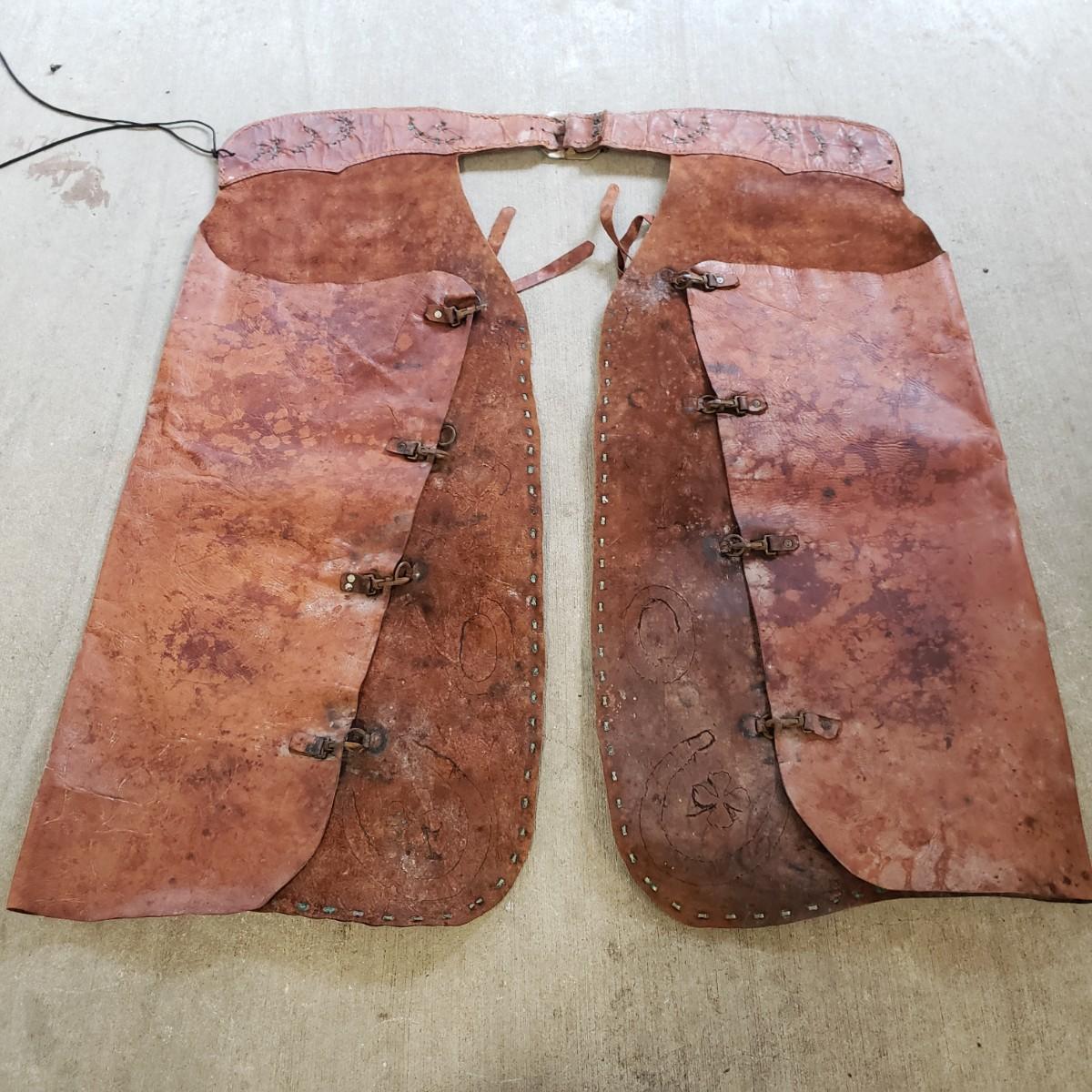 Unique leather chaps with concho details. One leg measures 16" x 35"H. The waist piece measures 30". They have some condition issues due to age like mildew and rust, but they still have life left!