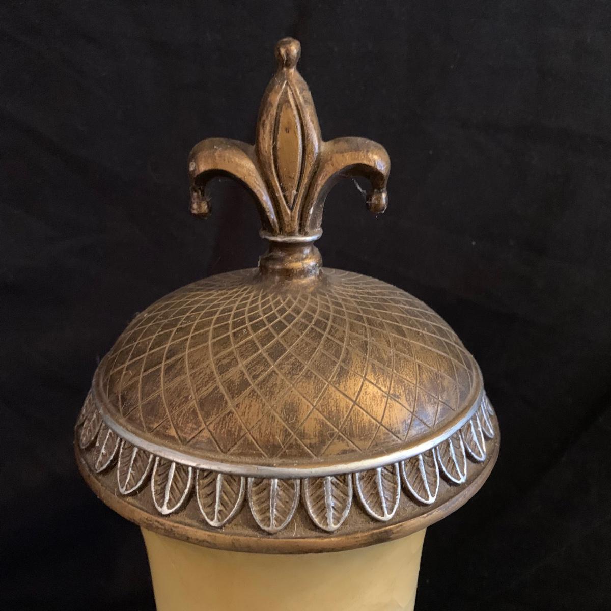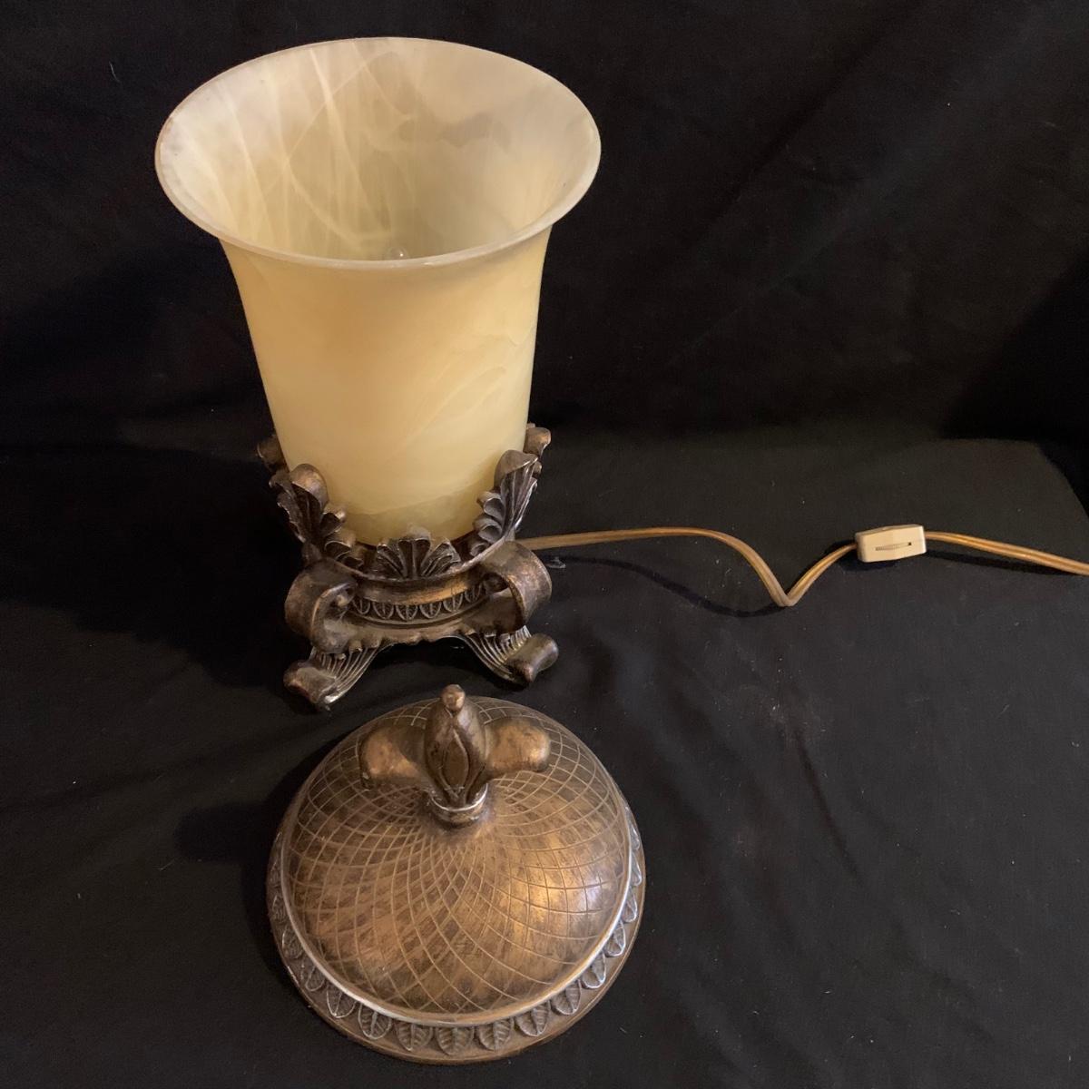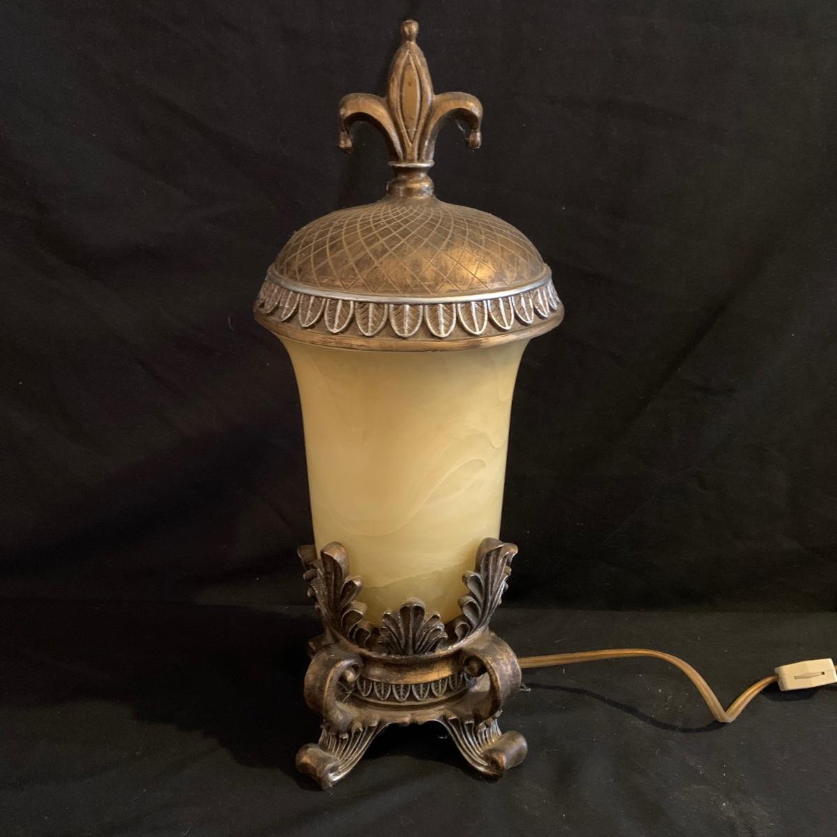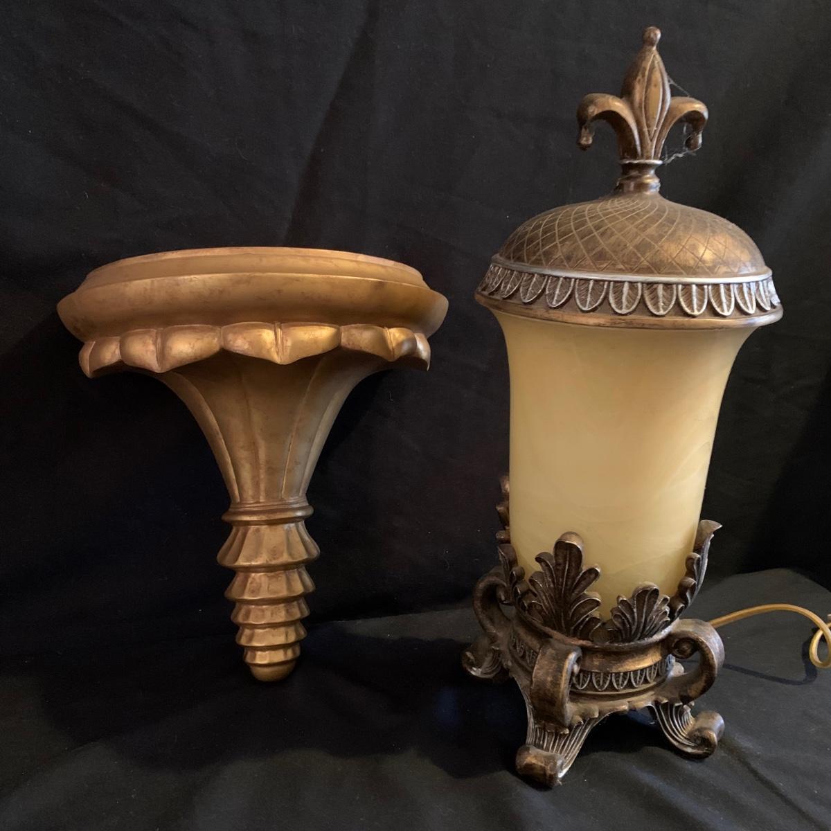 This unique table lamp has a marbled cream colored glass body that sits atop an ornate distressed brass colored base. The lid is removable. The lid and base feel like they are resin. The finial on top of the lid once broke off and was glued back on. It is loose now and needs more glue. It is a one way lamp. The lamp with the lid measures 17” tall. The other item in this lot is a distressed golden colored wall shelf. It feels like it is made of resin. The shelf surface is 9” wide and 4.5” deep. It is 11” tall. The shelf has hanging hardware on the back. Shipping available.
