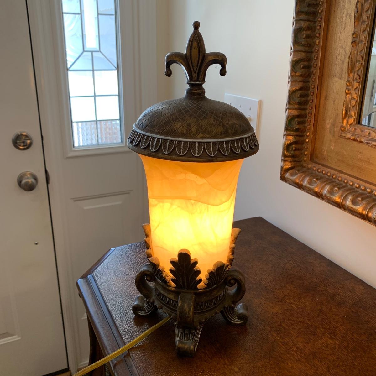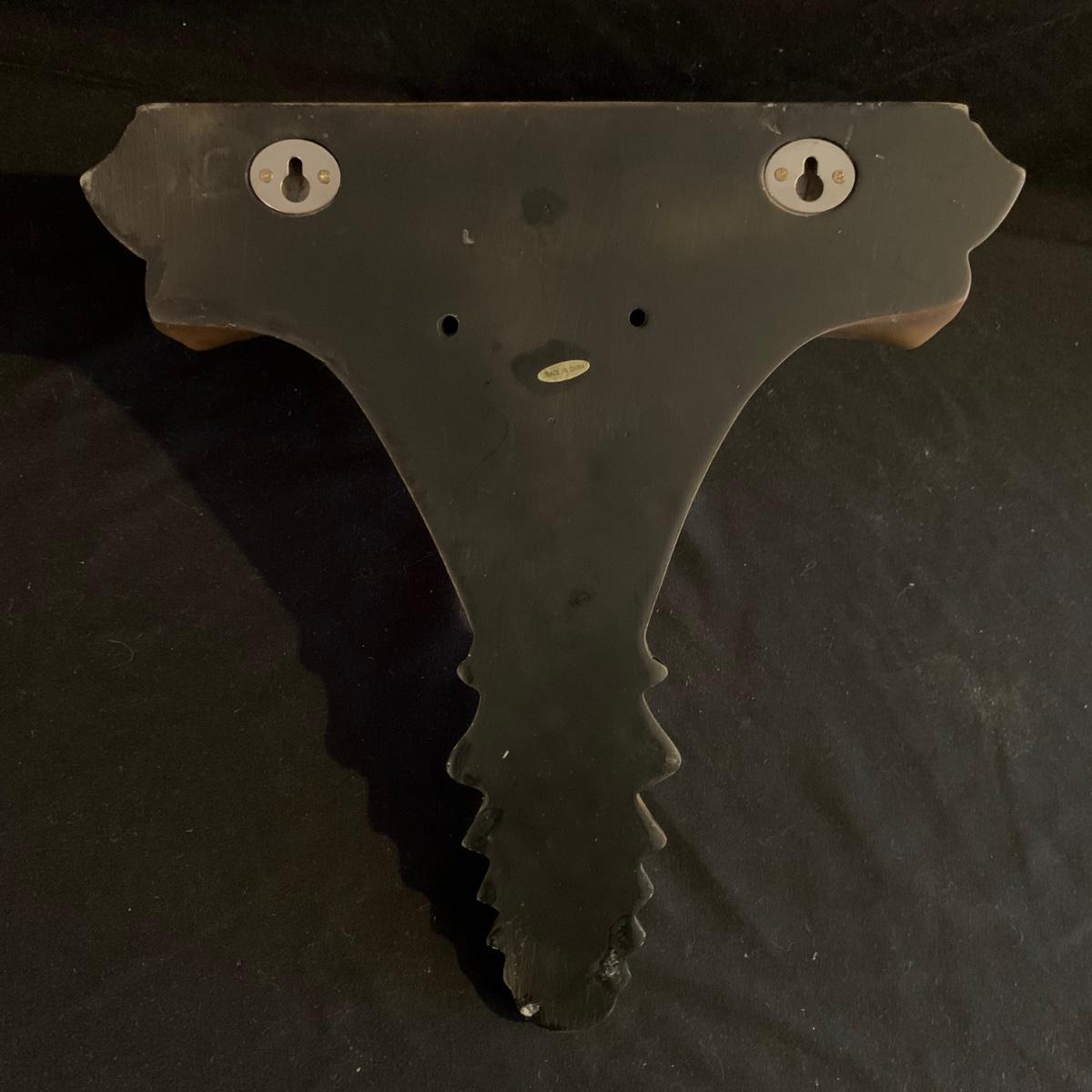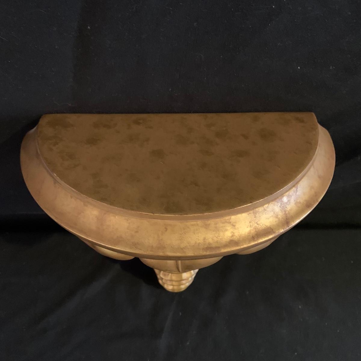 This unique table lamp has a marbled cream colored glass body that sits atop an ornate distressed brass colored base. The lid is removable. The lid and base feel like they are resin. The finial on top of the lid once broke off and was glued back on. It is loose now and needs more glue. It is a one way lamp. The lamp with the lid measures 17” tall. The other item in this lot is a distressed golden colored wall shelf. It feels like it is made of resin. The shelf surface is 9” wide and 4.5” deep. It is 11” tall. The shelf has hanging hardware on the back. Shipping available.