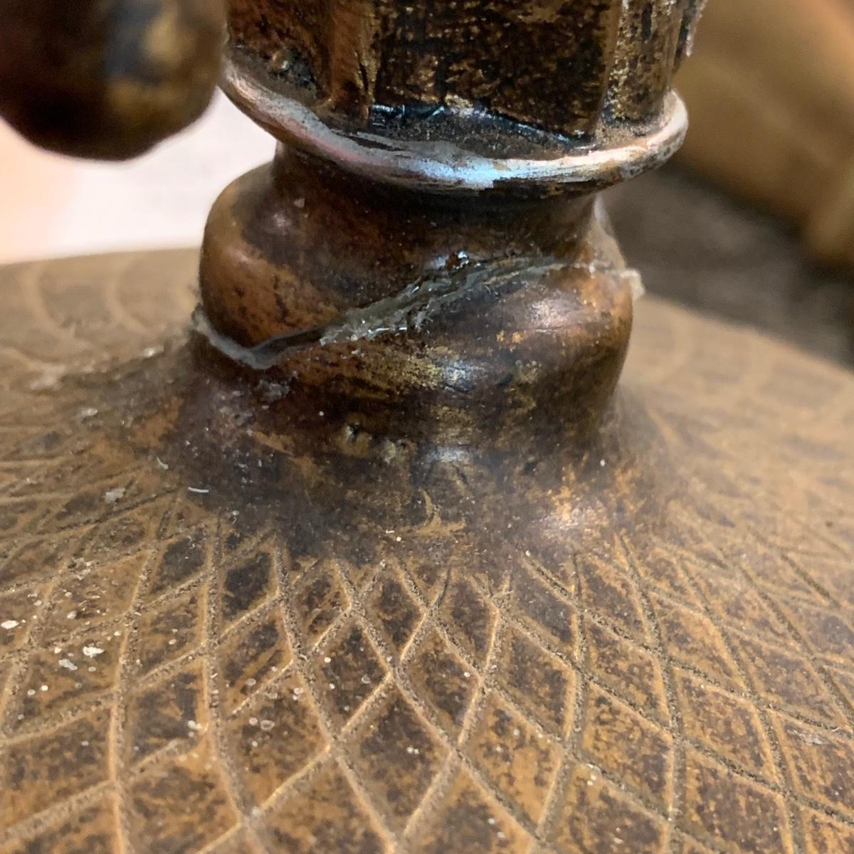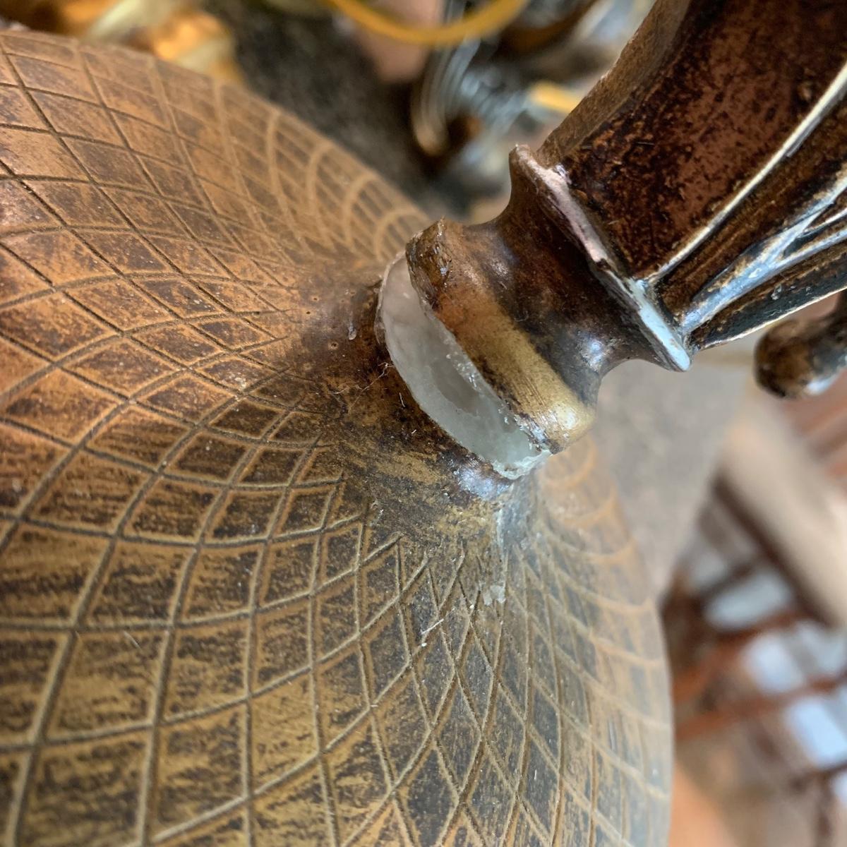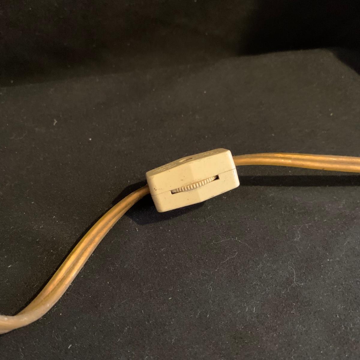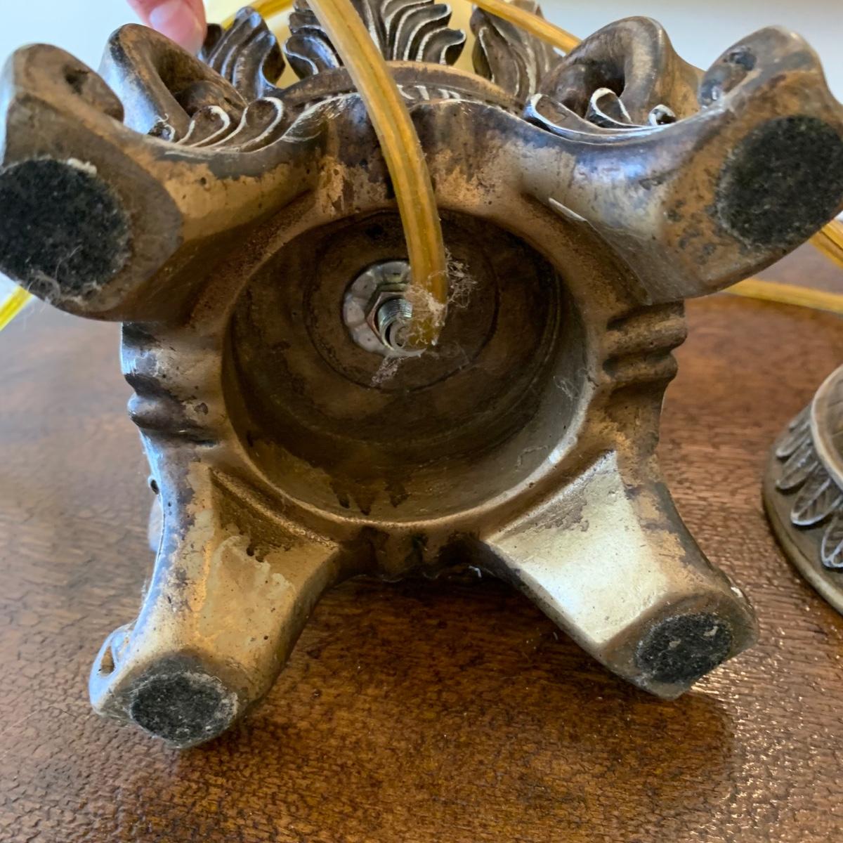 This unique table lamp has a marbled cream colored glass body that sits atop an ornate distressed brass colored base. The lid is removable. The lid and base feel like they are resin. The finial on top of the lid once broke off and was glued back on. It is loose now and needs more glue. It is a one way lamp. The lamp with the lid measures 17” tall. The other item in this lot is a distressed golden colored wall shelf. It feels like it is made of resin. The shelf surface is 9” wide and 4.5” deep. It is 11” tall. The shelf has hanging hardware on the back. Shipping available.