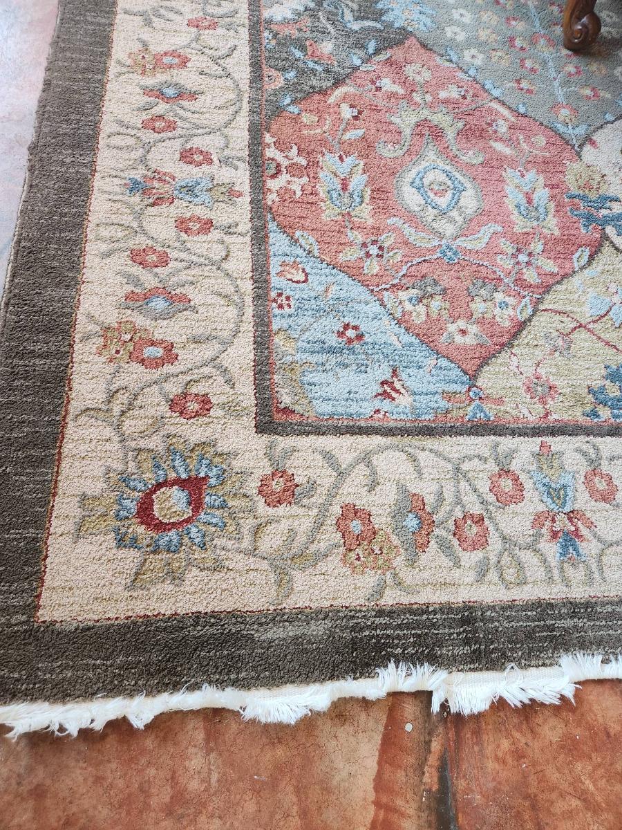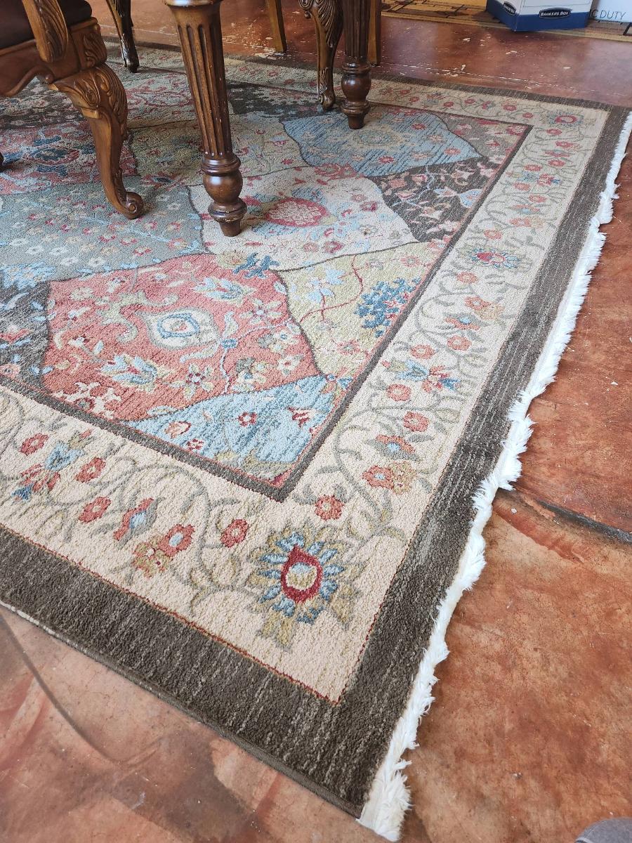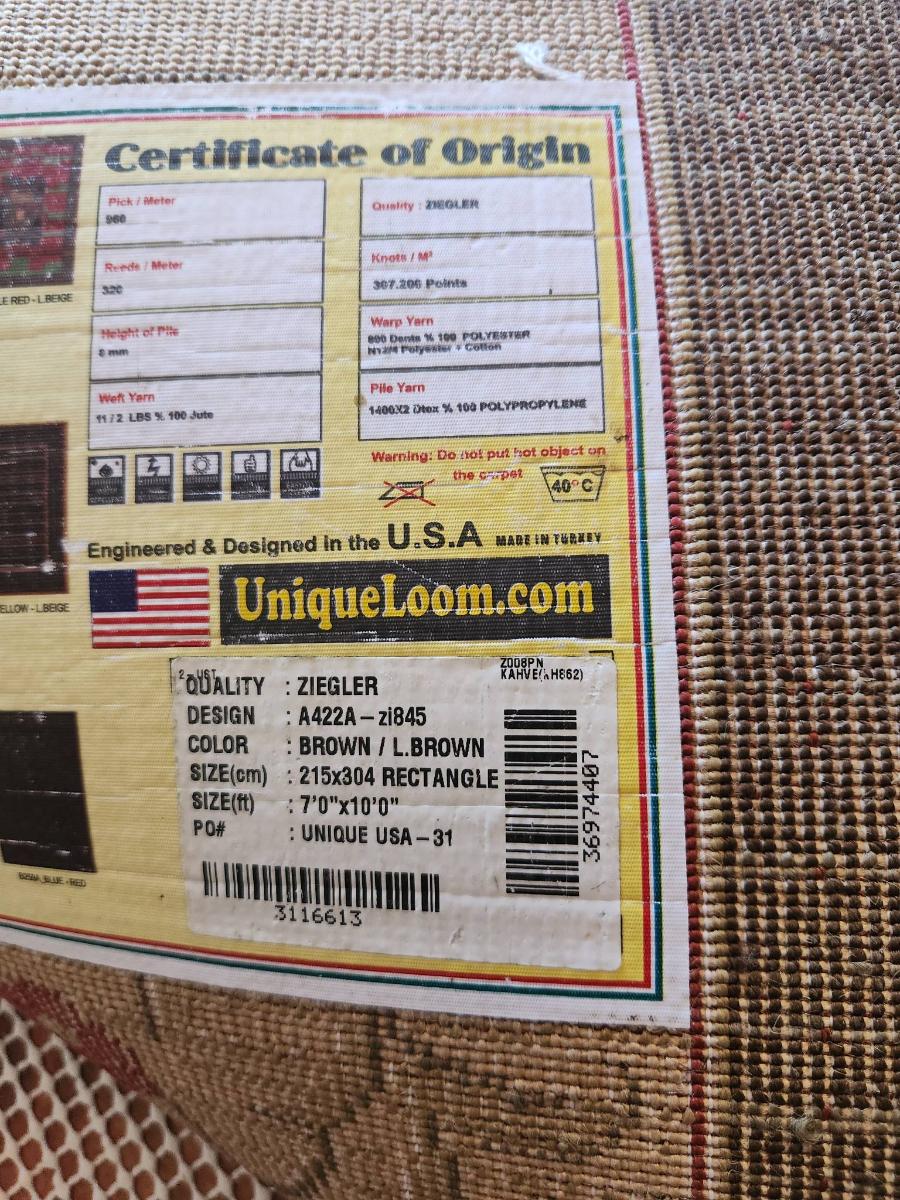Unique Loom Ziegler area rug in a 7’0 x 10’0 rectangular size. Features brown and light brown tones with intricate floral and geometric patterns. Made in Turkey and engineered and designed in the USA. Crafted using a blend of 300D polyester and 100% polypropylene for durability. Includes fringed edges as part of the design. Slight signs of wear appear on the fringe but no major damage noted.