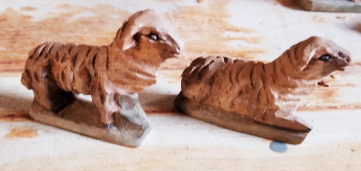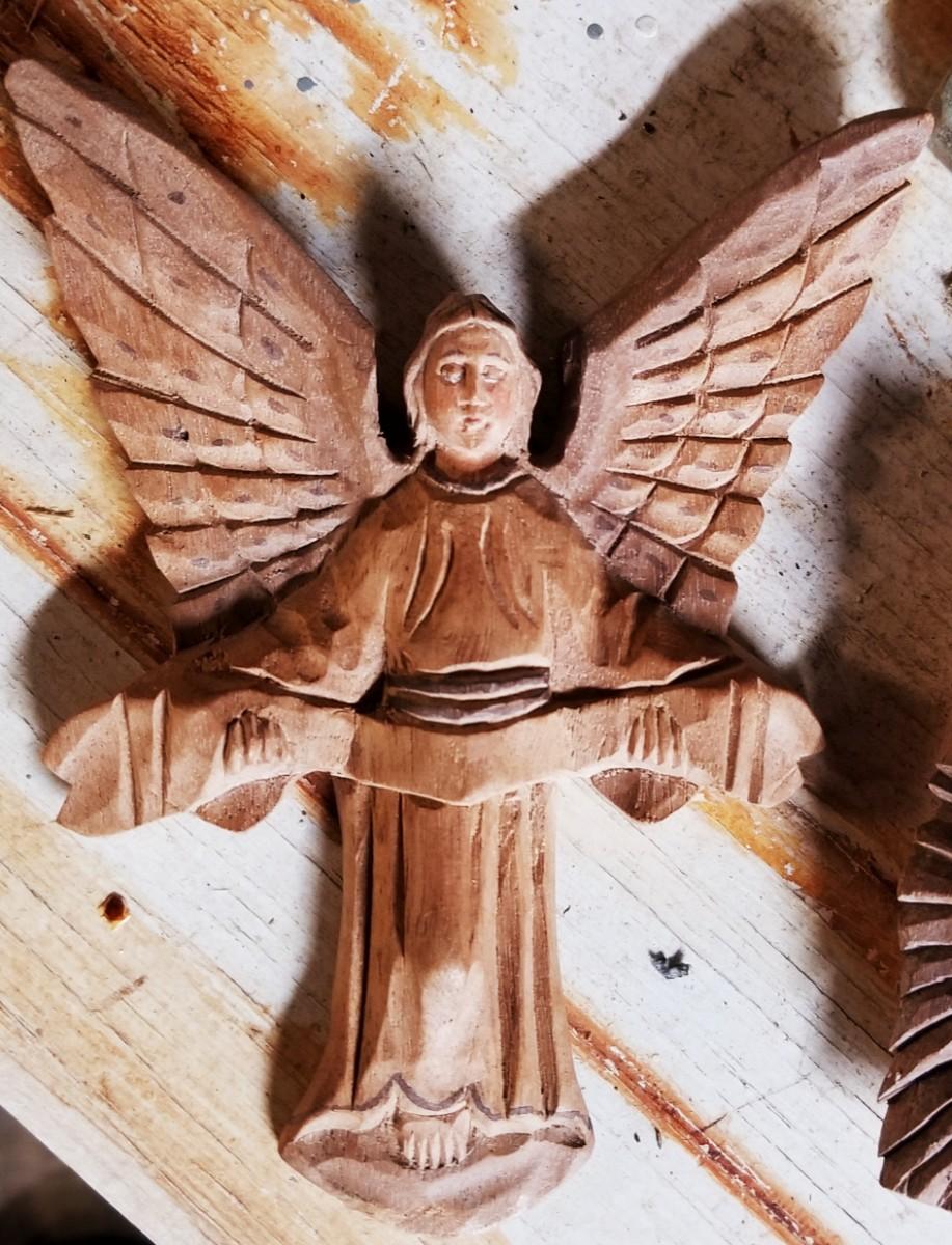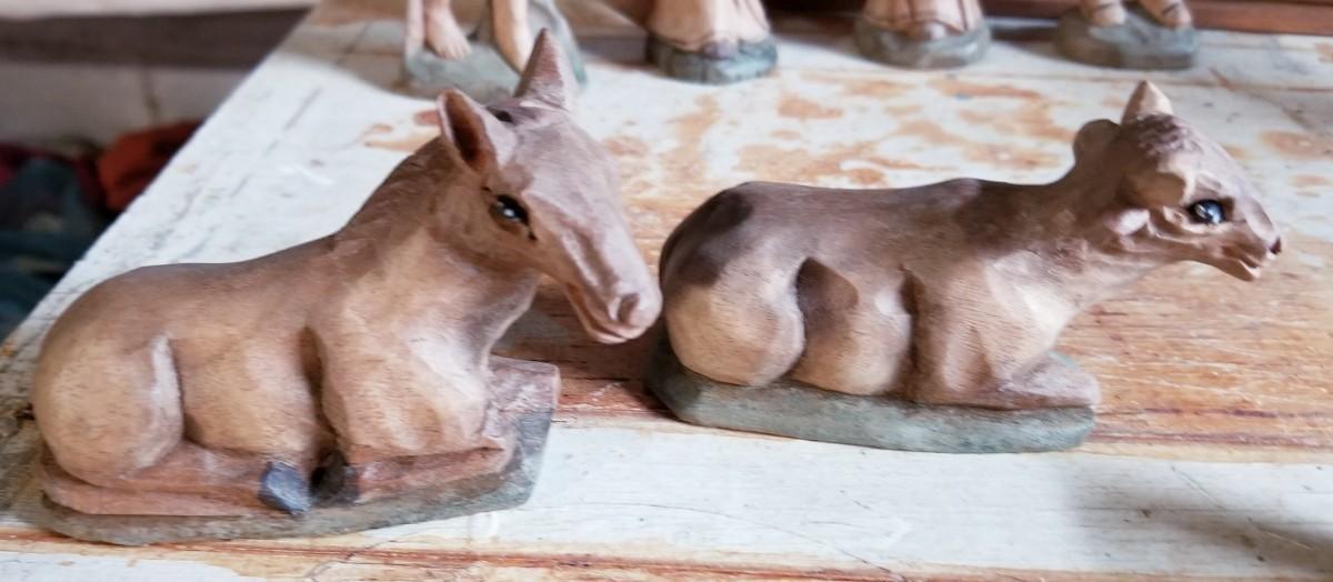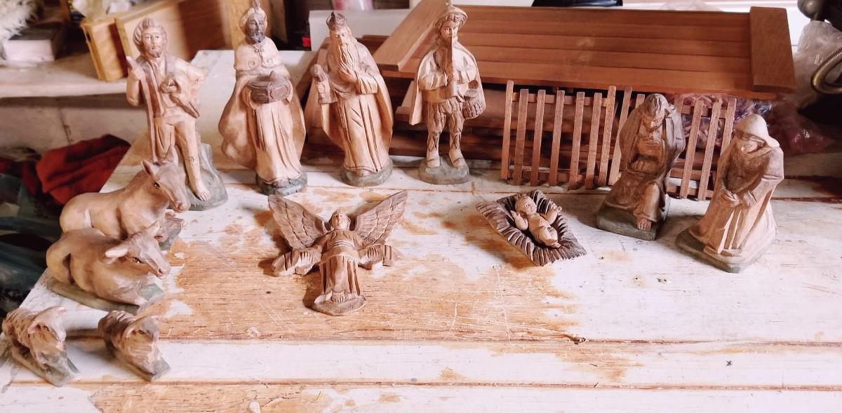 Unique wood hand carved manger scene complete with stable not assembled in the background.