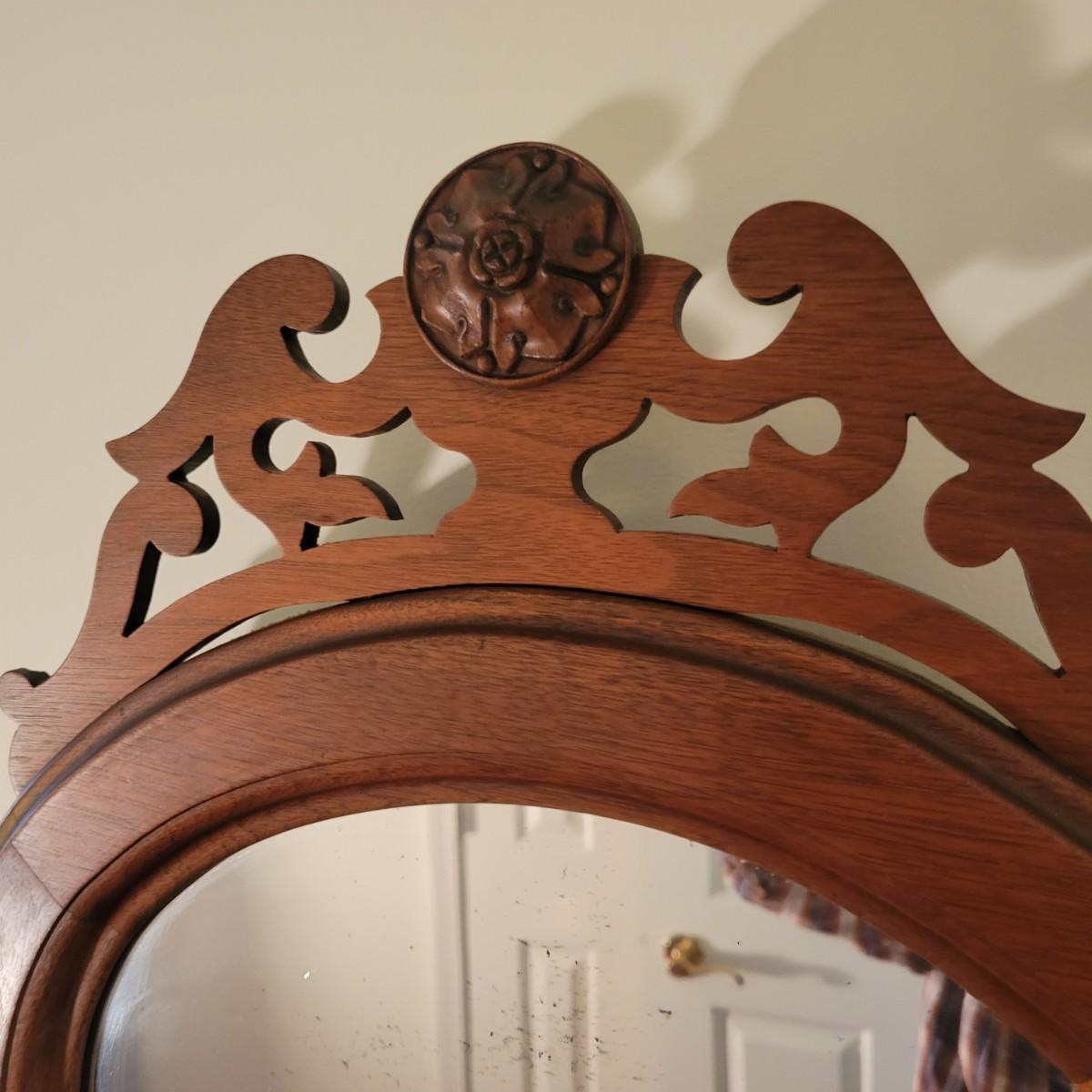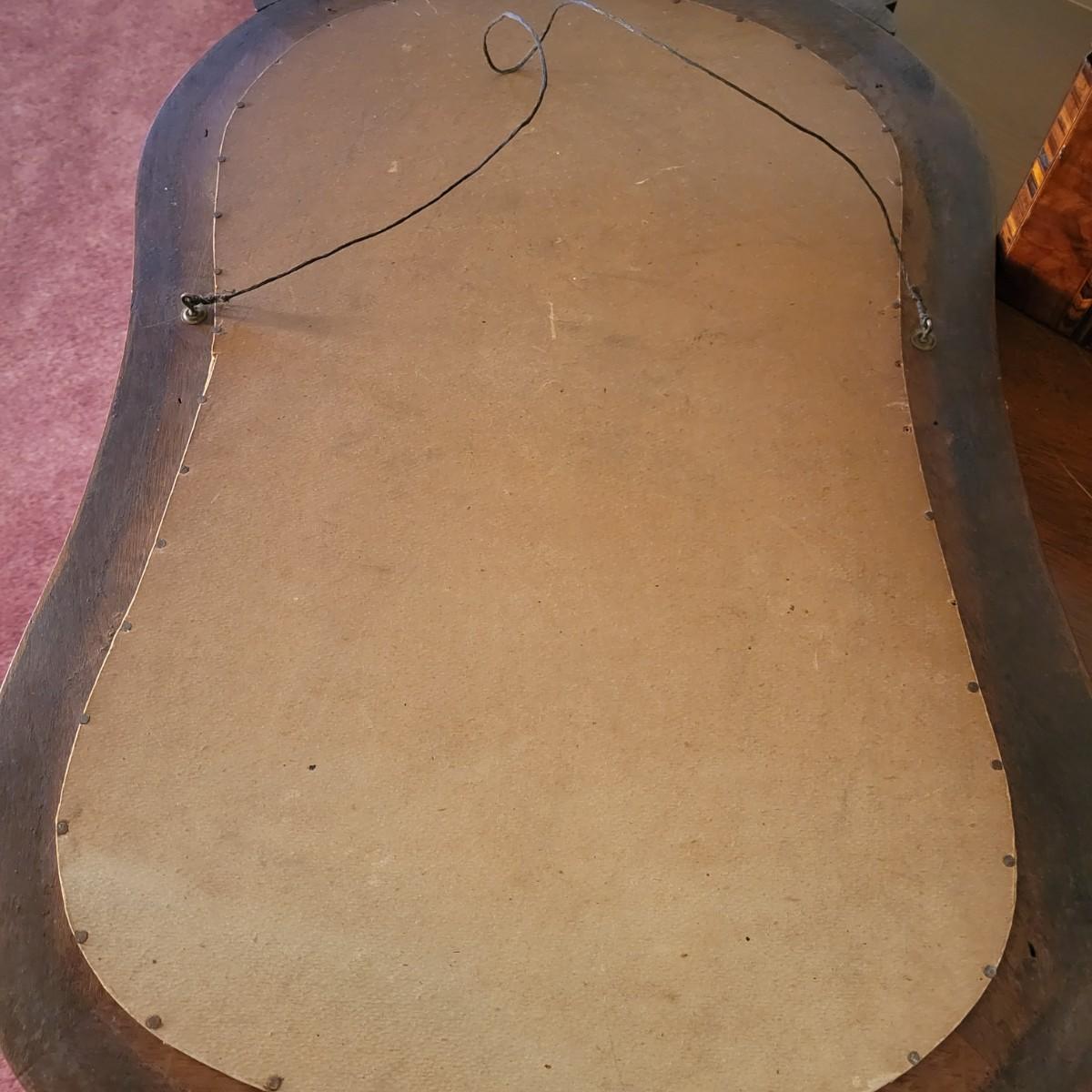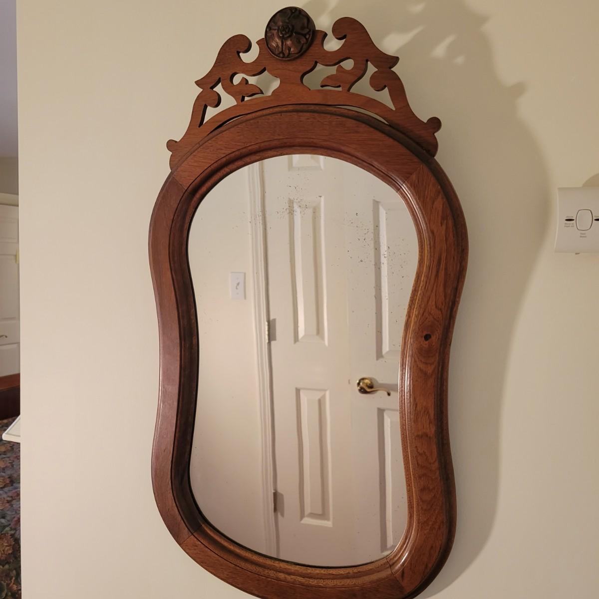 A unique mirror in an oak frame in good condition, but the mirror does have some spotting likely from damage to the silvering. This mirror features a unique design with an oak frame, scroll cut detail on top, with a carved rosette. Measures approximately 17" x 30.5" x 1". Local pickup only