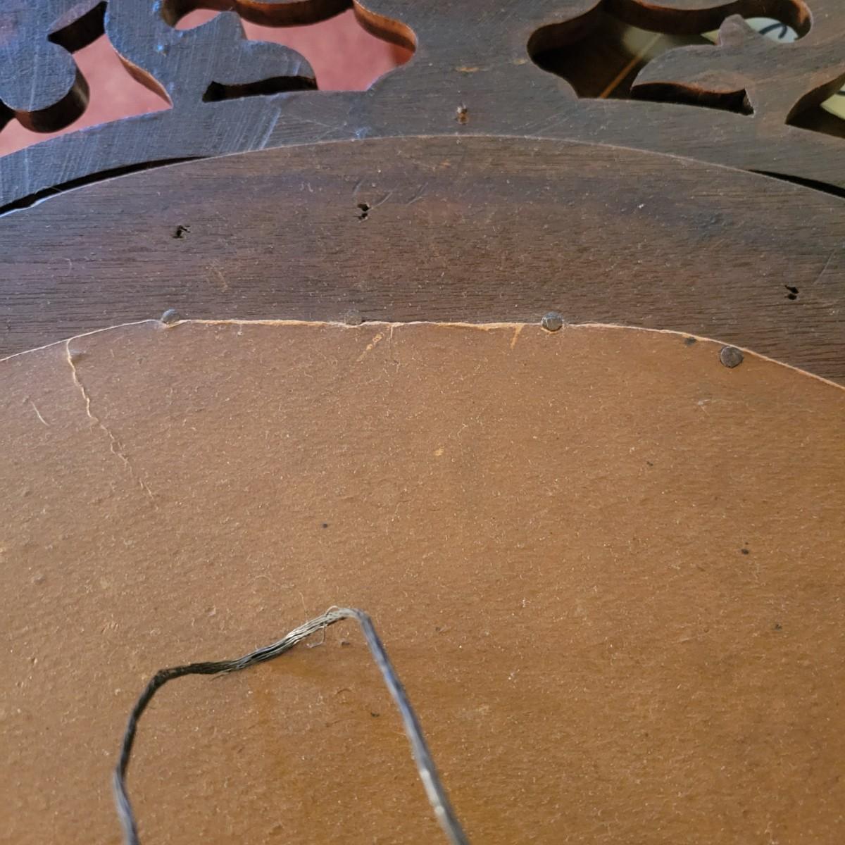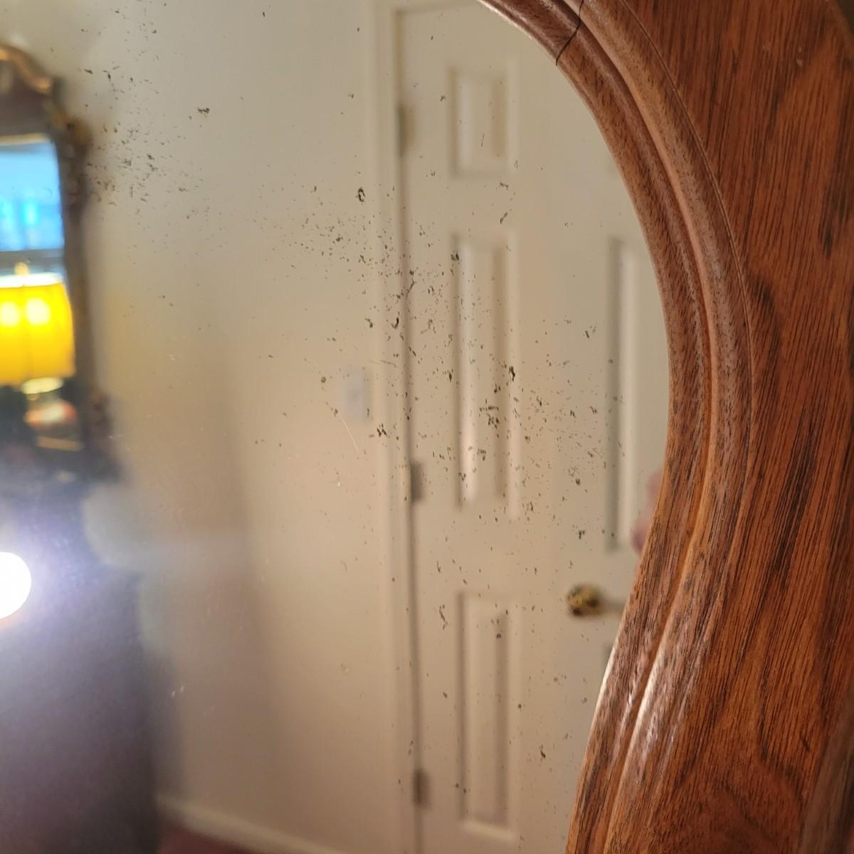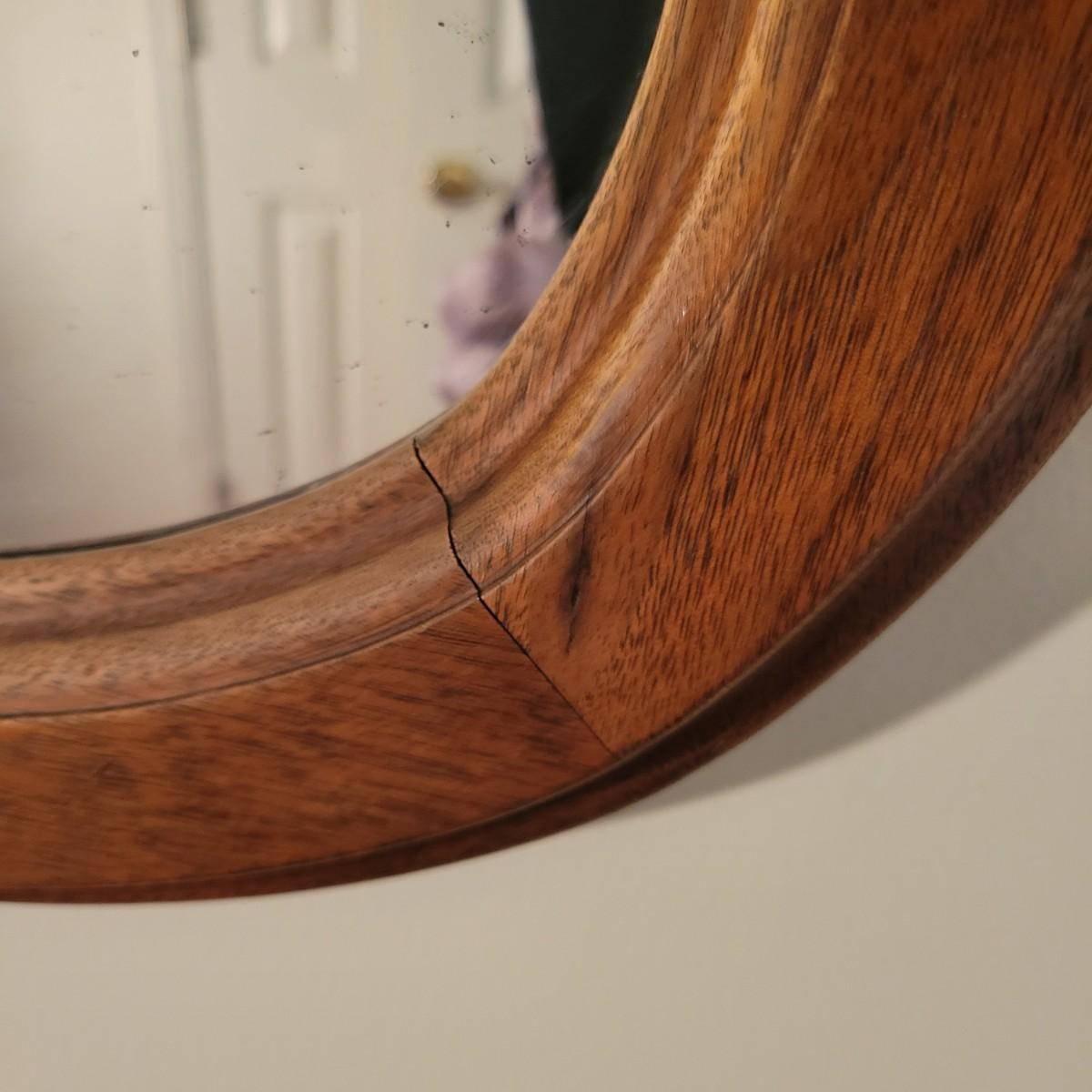 A unique mirror in an oak frame in good condition, but the mirror does have some spotting likely from damage to the silvering. This mirror features a unique design with an oak frame, scroll cut detail on top, with a carved rosette. Measures approximately 17" x 30.5" x 1". Local pickup only