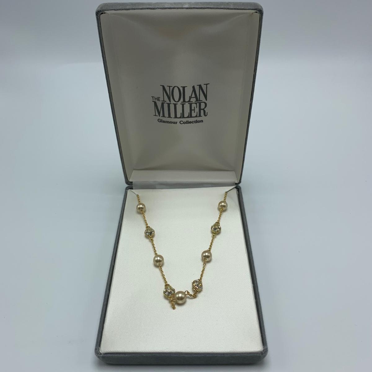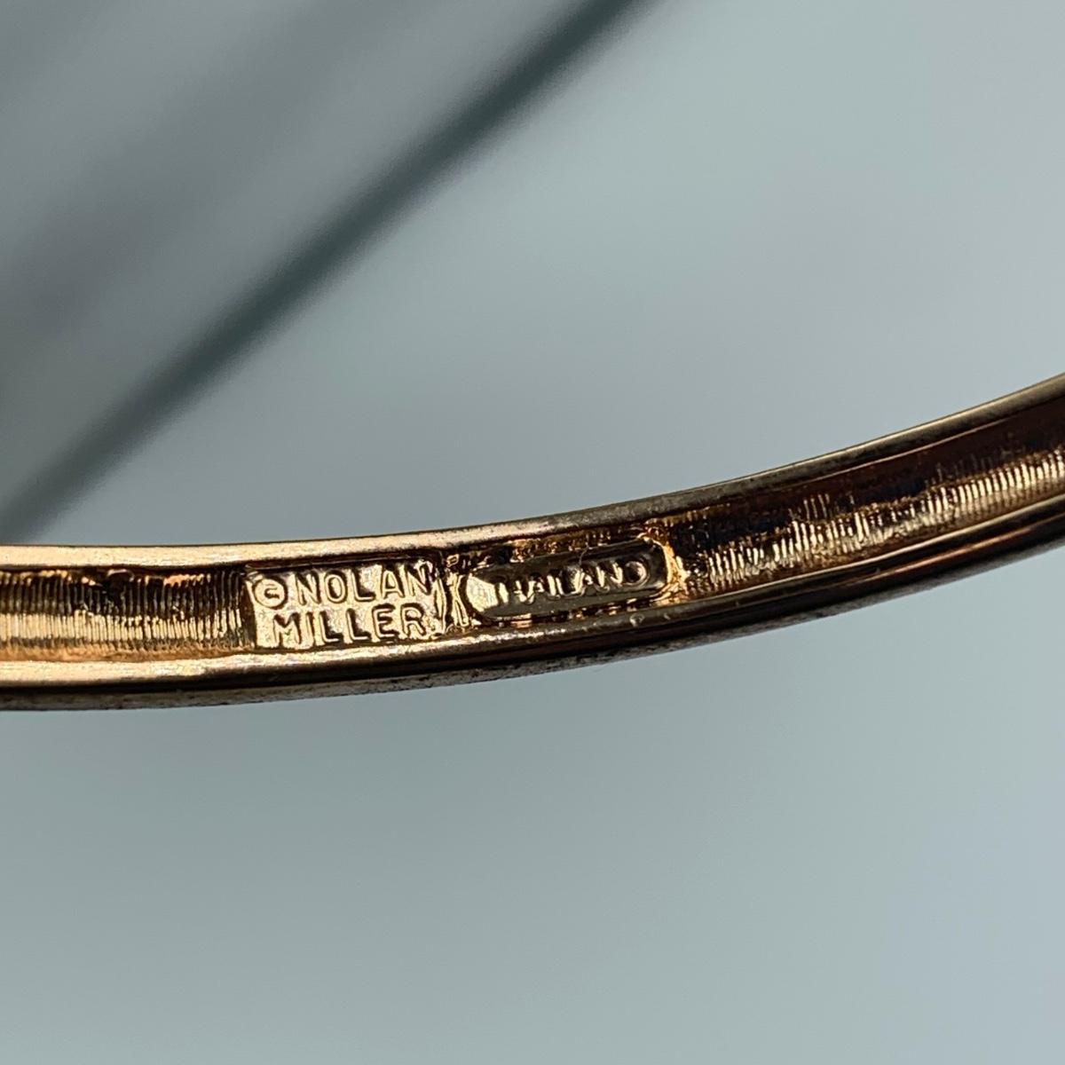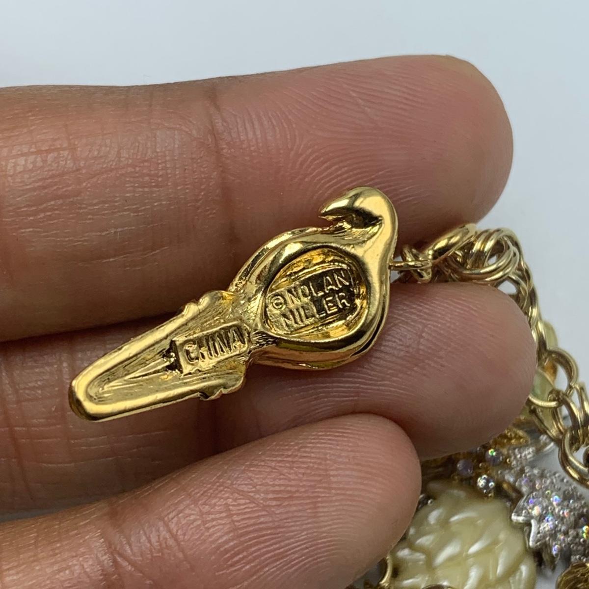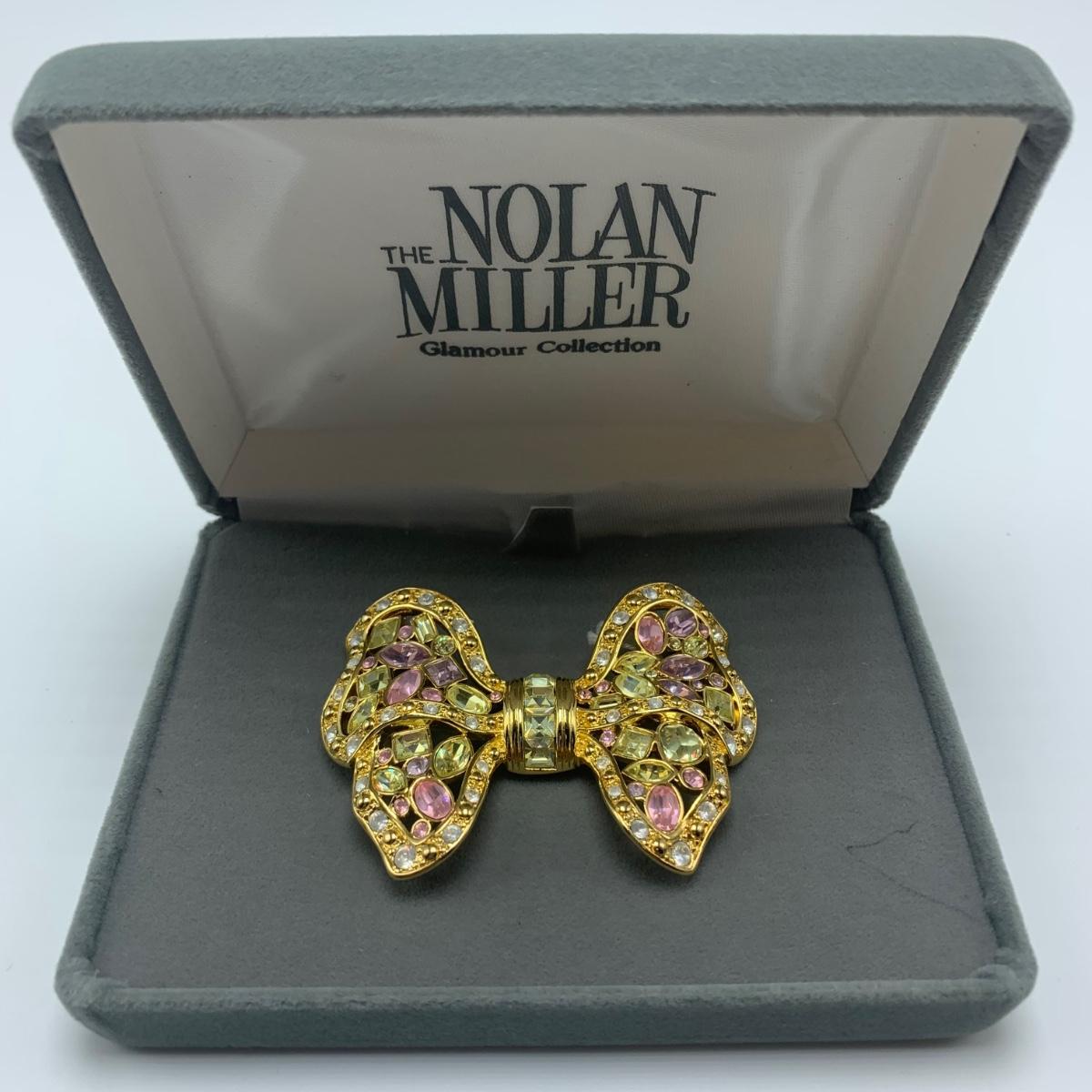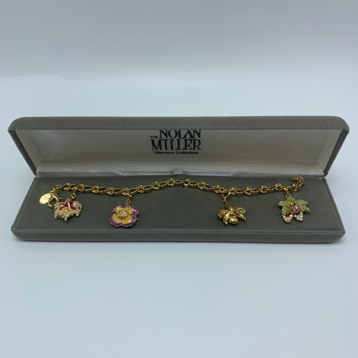 Unique selection of Nolan Miller pins and jewelry. Lot includes stamped 925 gold style chain with single pink pearl pendant and matching size nine ring, Soho pansy pin, two Nolan Miller flower pins, Nolan Miller Cathedral Butterfly pin, Nolan Miller jeweled blue bird pin in box, Nolan Miller pink stone bangle bracelet, Nolan Miller Pearl and jeweled bead necklace, stamped 14K 7.75” Nolan Miller charm bracelet with nine charms (the "c" charm is the only charm with a 14K marking and all charms are removable), Nolan Miller jeweled butterfly in box, two Nolan Miller Buttercup flower pins, and 7.5” Nolan Miller Orchid charm bracelet with four removeable charms. Please see photos for more details and markings. All sales are final. No returns or refunds. Please bid accordingly.