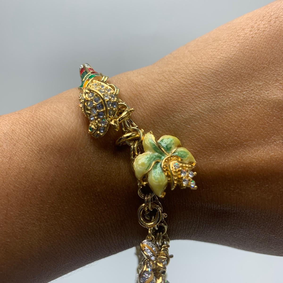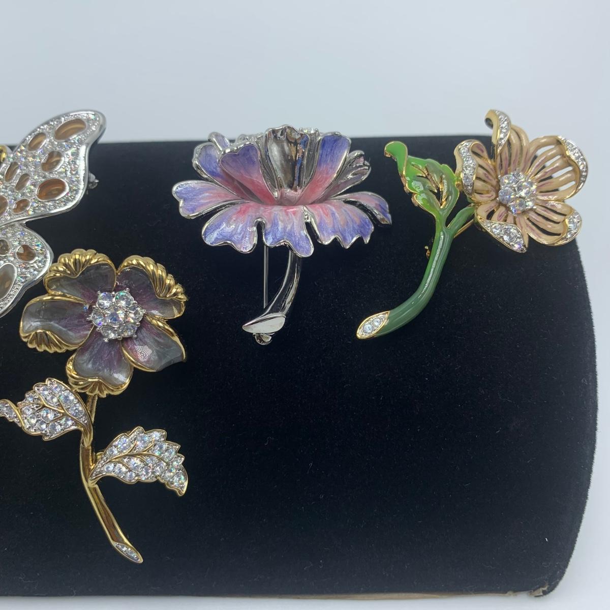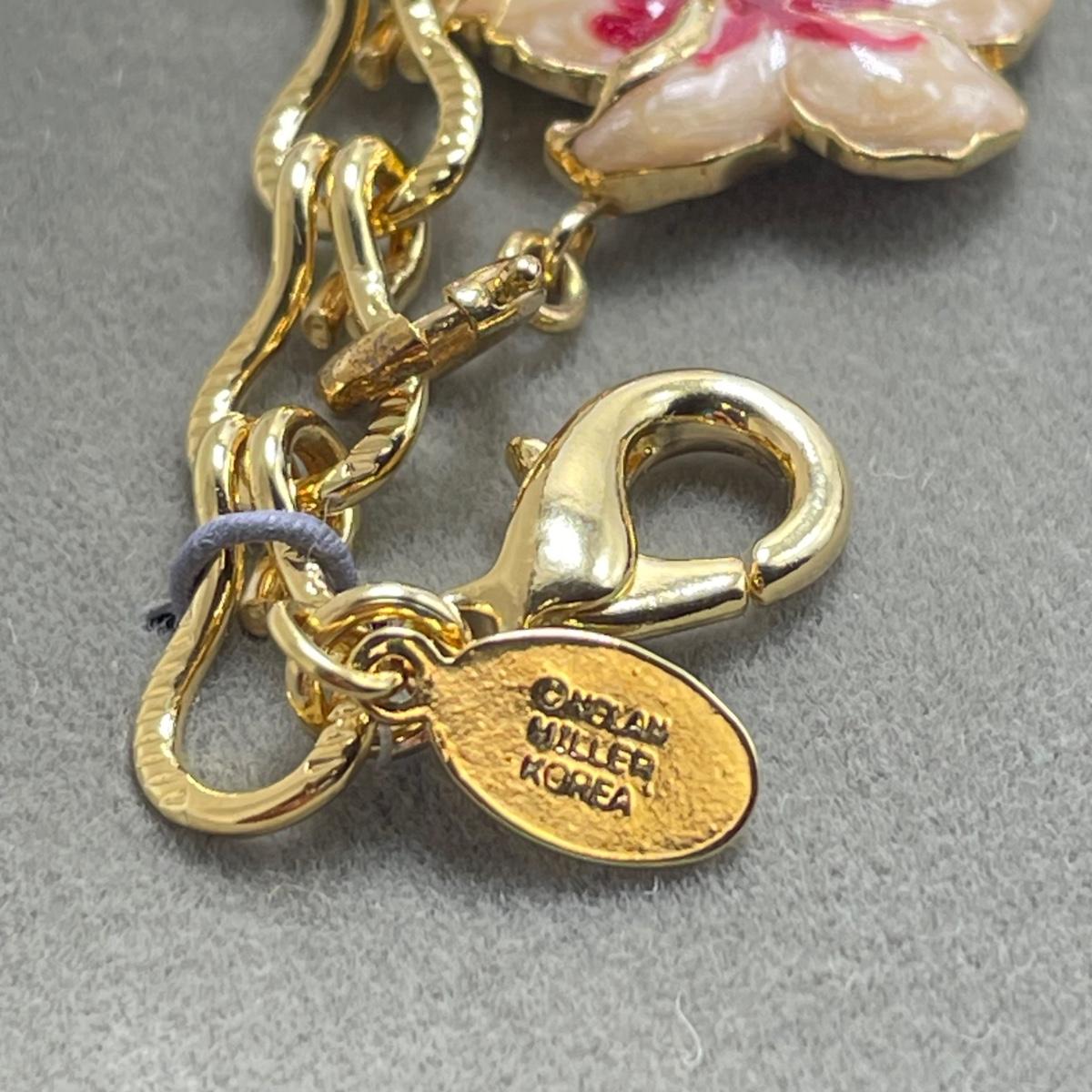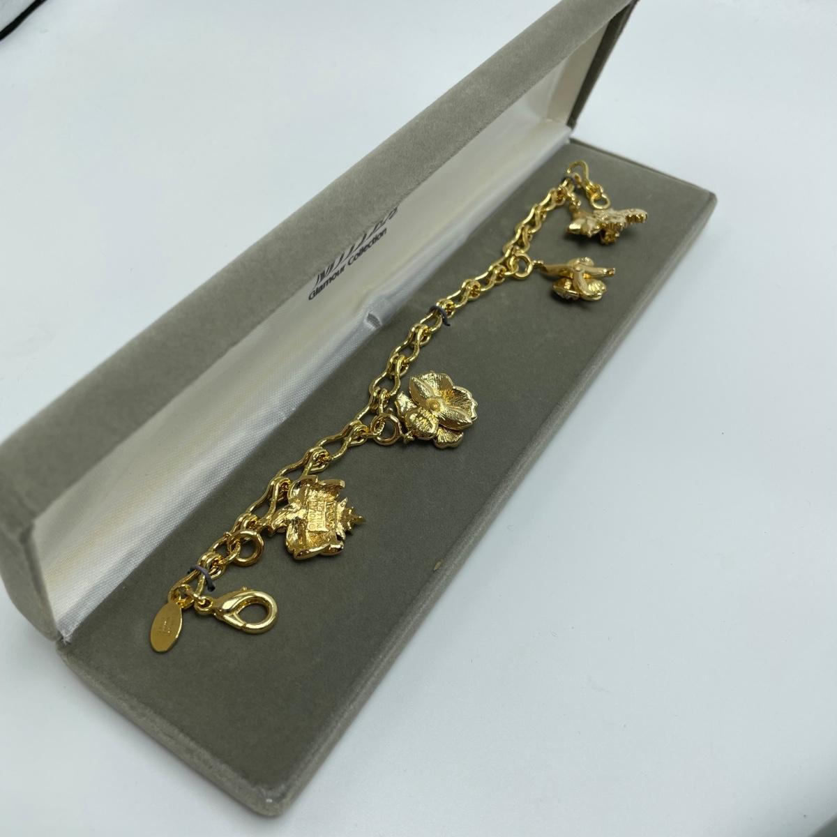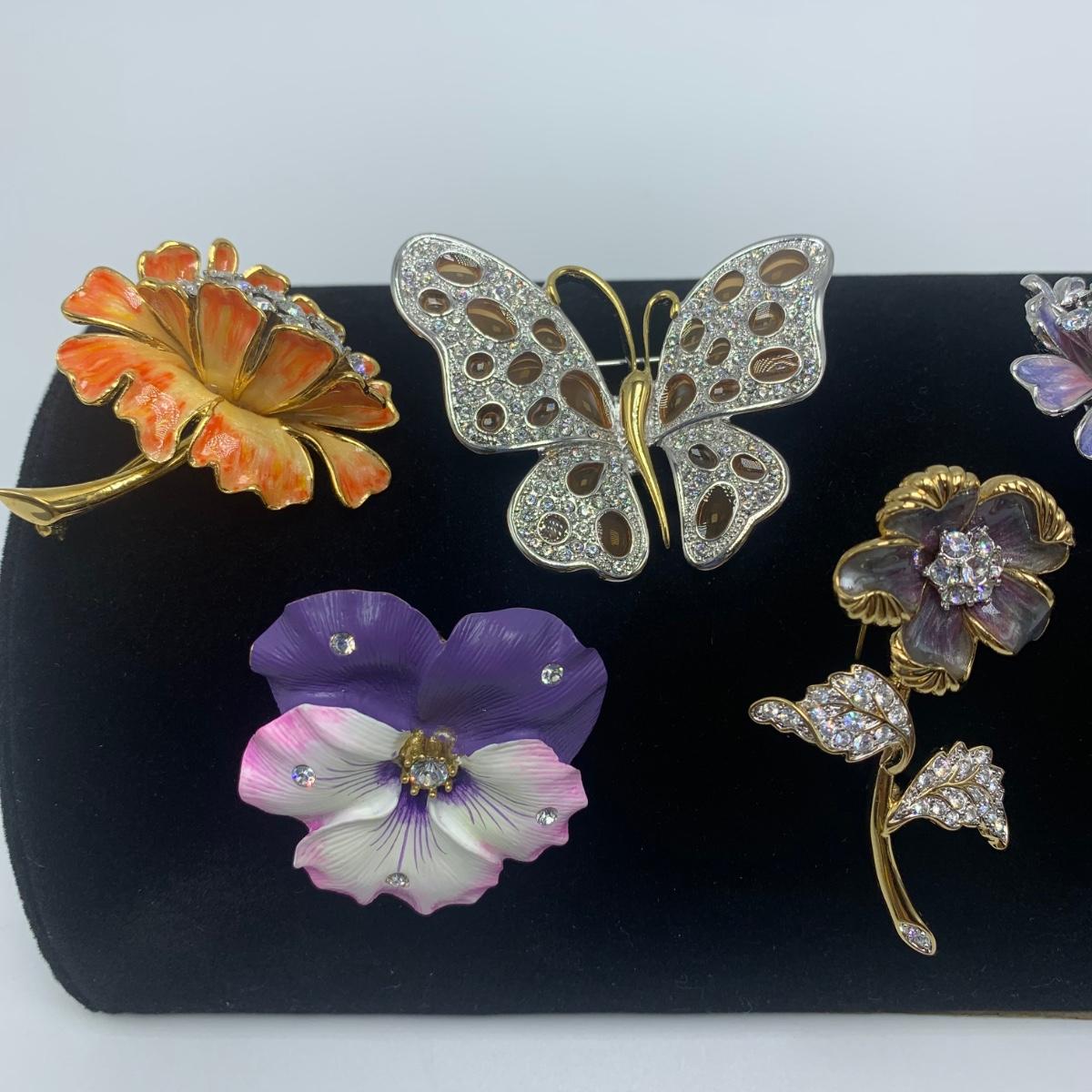 Unique selection of Nolan Miller pins and jewelry. Lot includes stamped 925 gold style chain with single pink pearl pendant and matching size nine ring, Soho pansy pin, two Nolan Miller flower pins, Nolan Miller Cathedral Butterfly pin, Nolan Miller jeweled blue bird pin in box, Nolan Miller pink stone bangle bracelet, Nolan Miller Pearl and jeweled bead necklace, stamped 14K 7.75” Nolan Miller charm bracelet with nine charms (the "c" charm is the only charm with a 14K marking and all charms are removable), Nolan Miller jeweled butterfly in box, two Nolan Miller Buttercup flower pins, and 7.5” Nolan Miller Orchid charm bracelet with four removeable charms. Please see photos for more details and markings. All sales are final. No returns or refunds. Please bid accordingly.