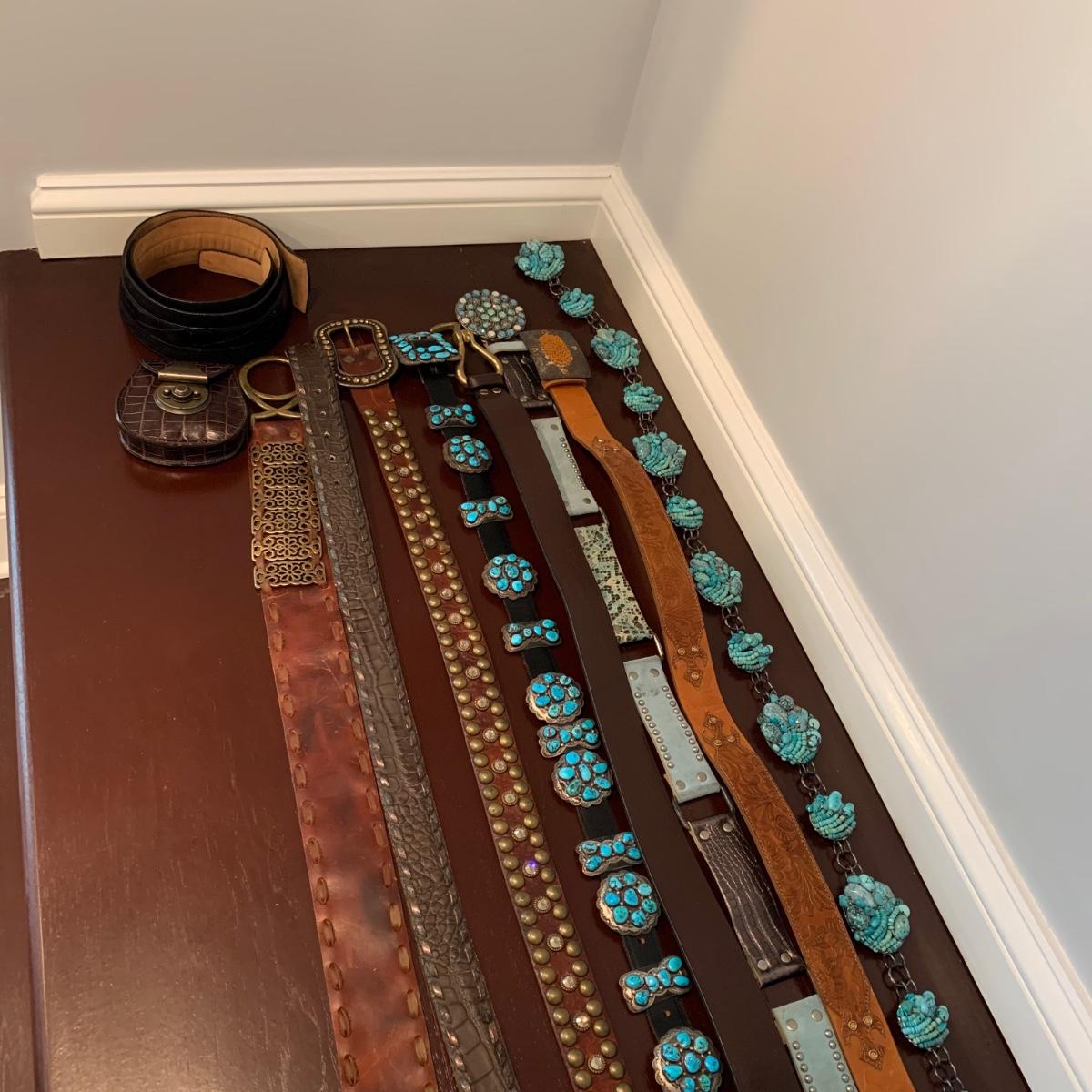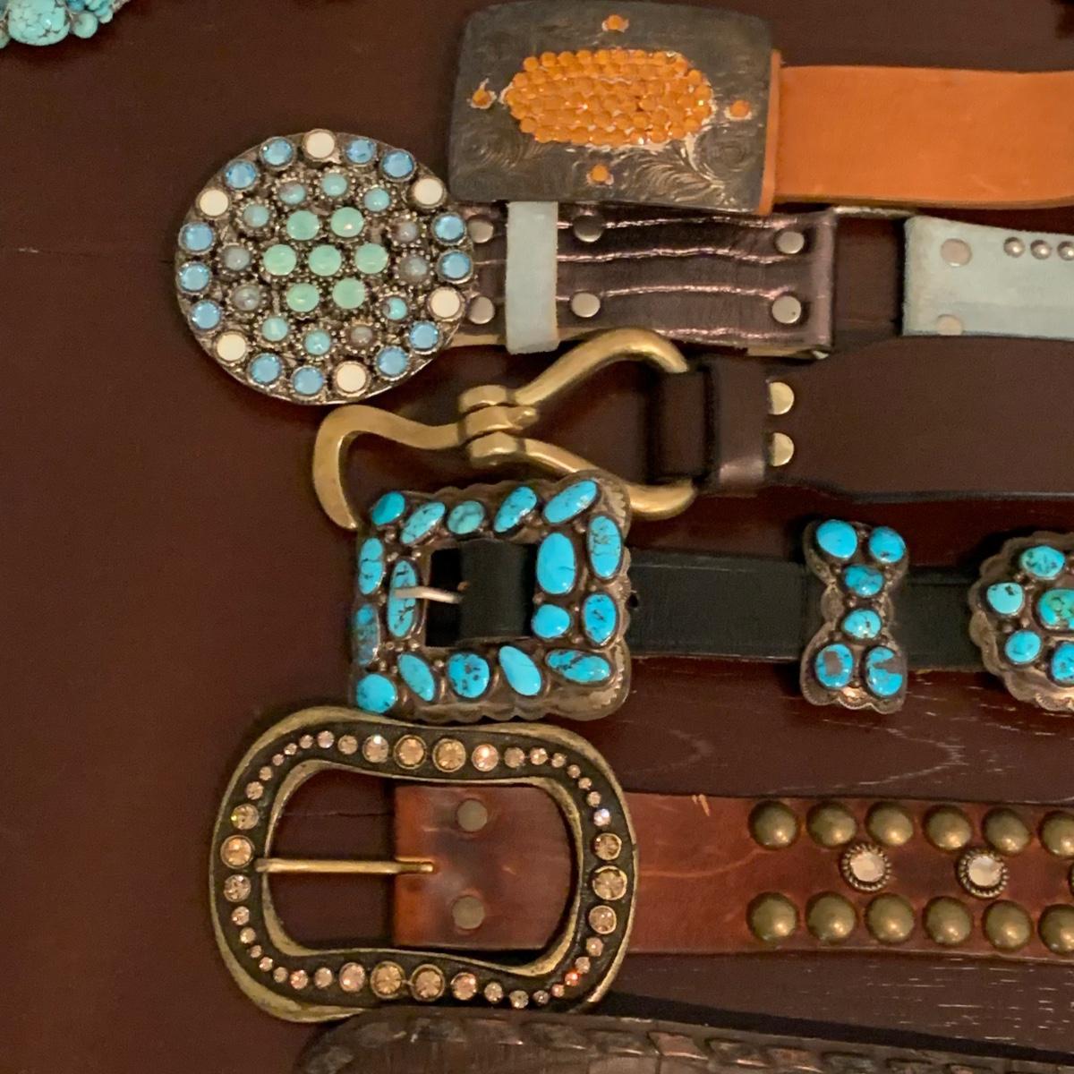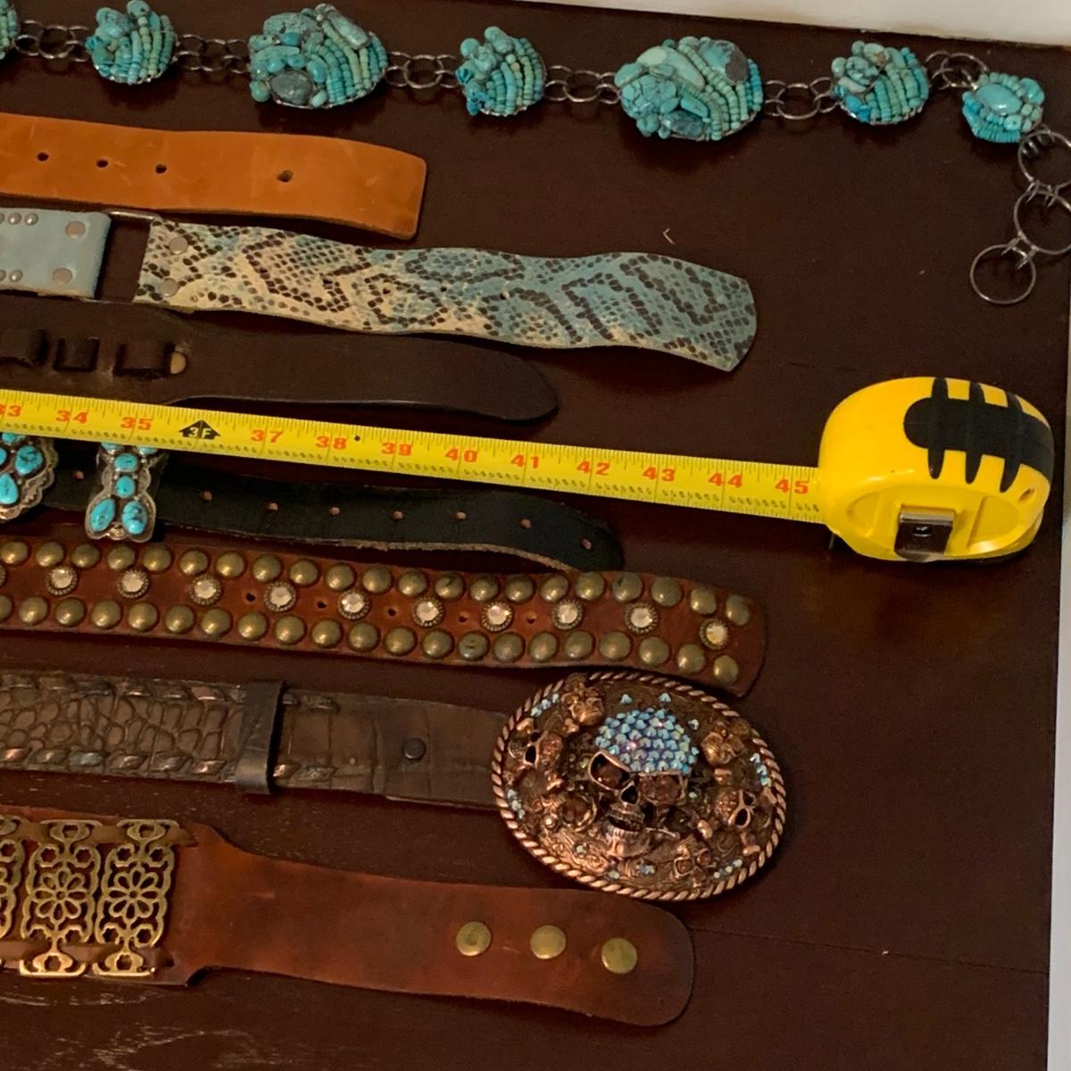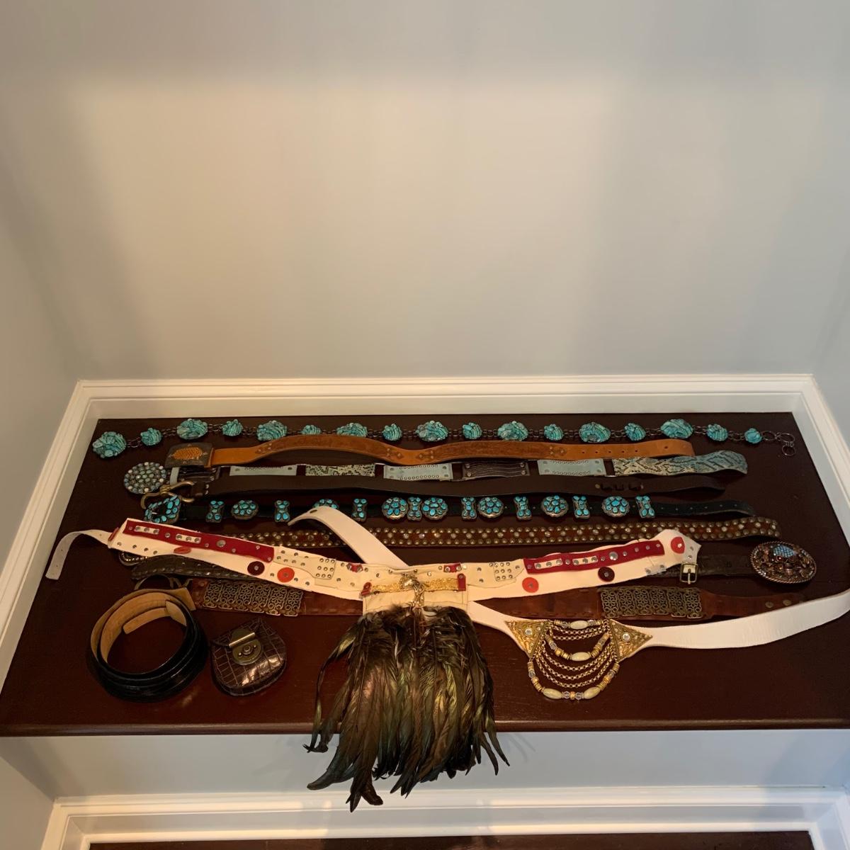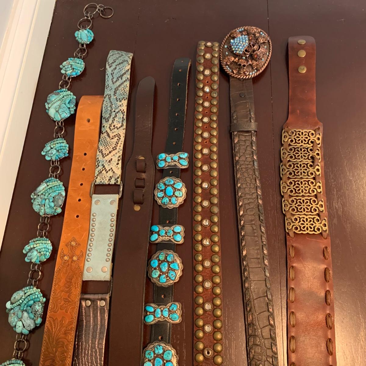 A very unique collection of very ornate women’s belts. 11 total belts are included, as well as a small hip pouch. All of the belts are leather (or have a leather feel) except the turquoise belt that is metal-based. You’ll notice one very unique belt with long feathers. Others have different sparkly rhinestones, metal adornments, and turquoise-colored stones. The belt with the leather base and turquoise stones is marked “Sterling”. The belts range in length from approximately 39” to 44”.