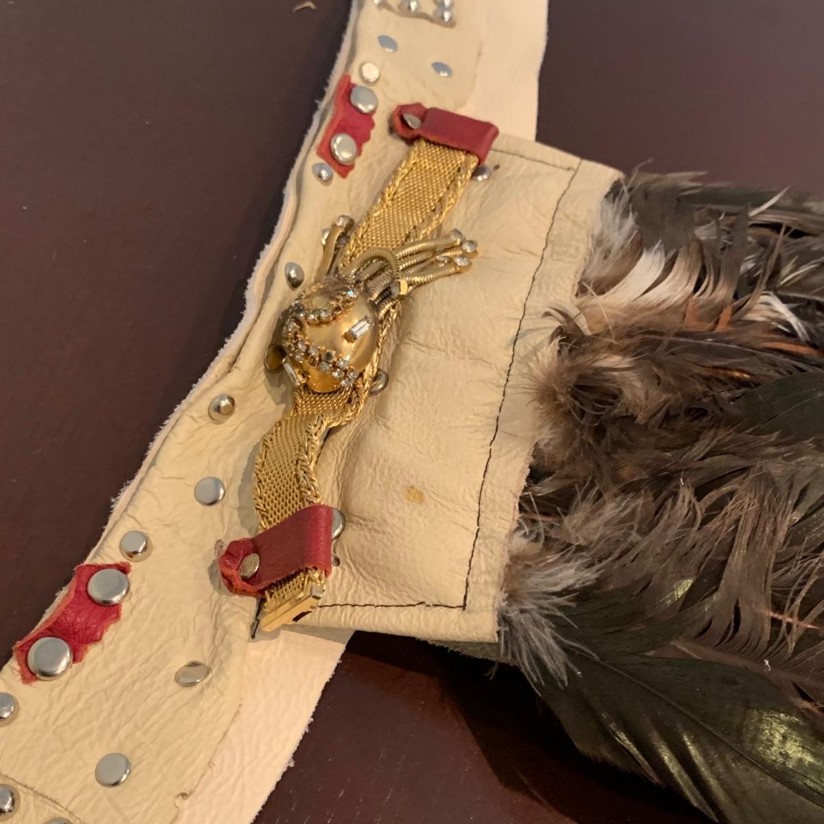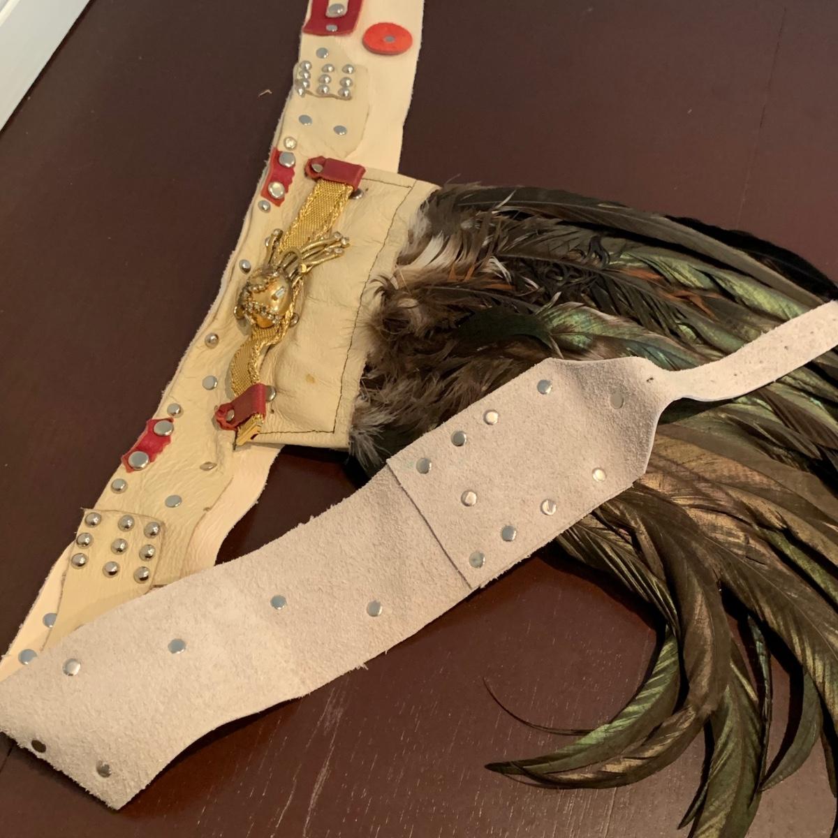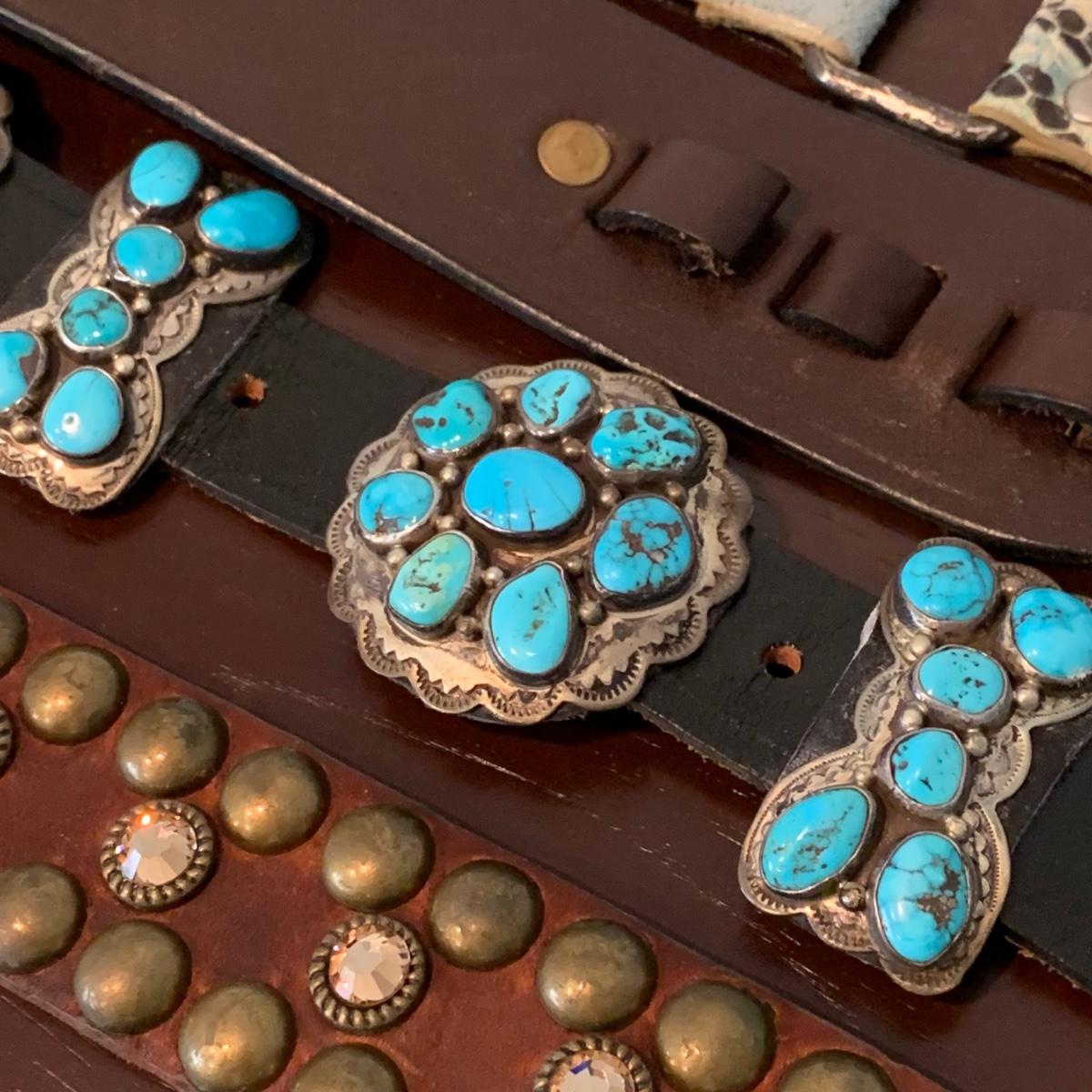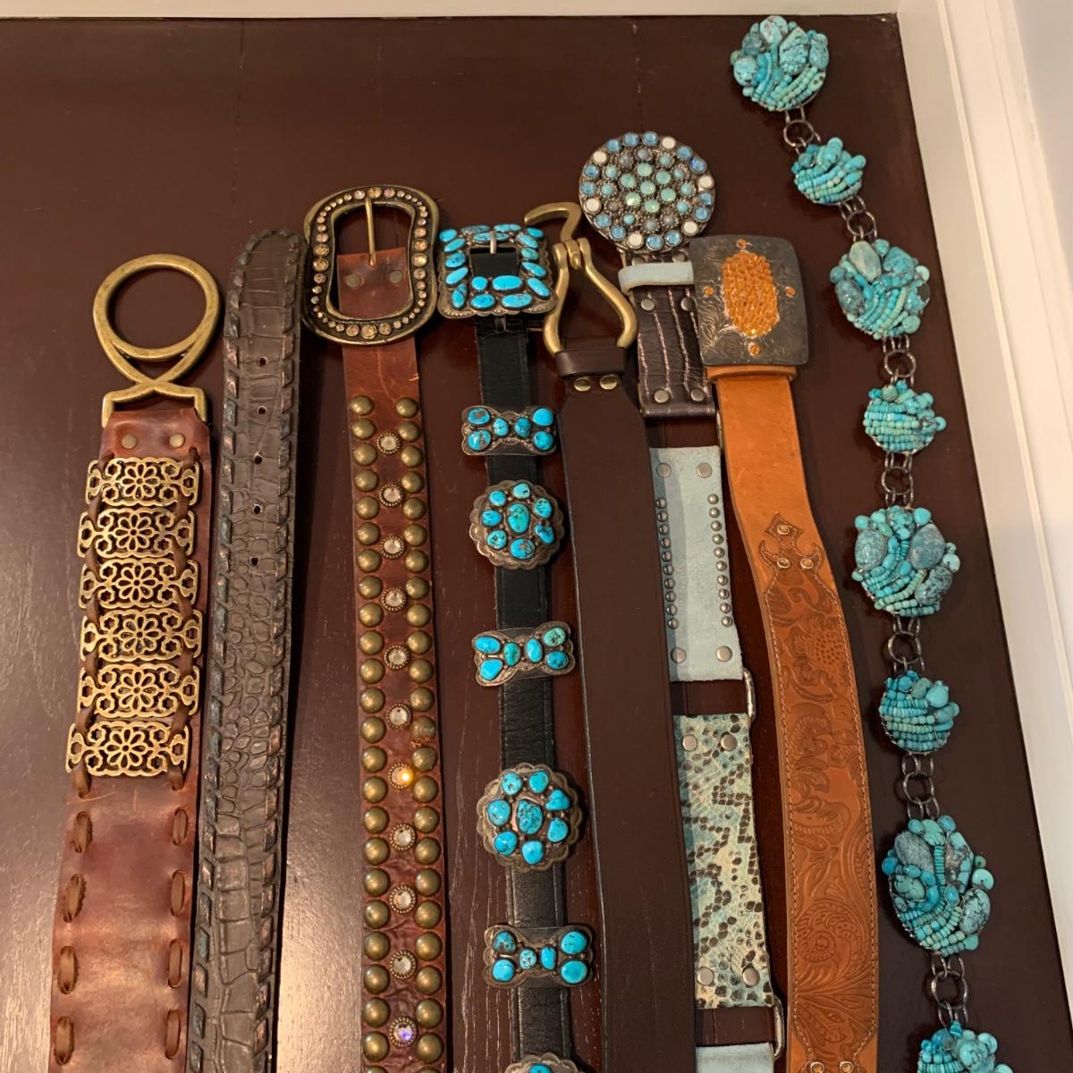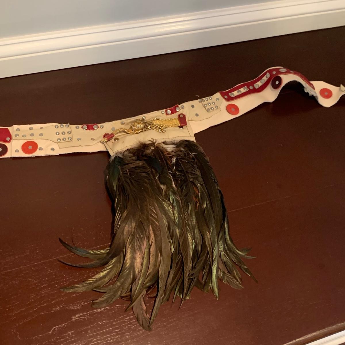 A very unique collection of very ornate women’s belts. 11 total belts are included, as well as a small hip pouch. All of the belts are leather (or have a leather feel) except the turquoise belt that is metal-based. You’ll notice one very unique belt with long feathers. Others have different sparkly rhinestones, metal adornments, and turquoise-colored stones. The belt with the leather base and turquoise stones is marked “Sterling”. The belts range in length from approximately 39” to 44”.