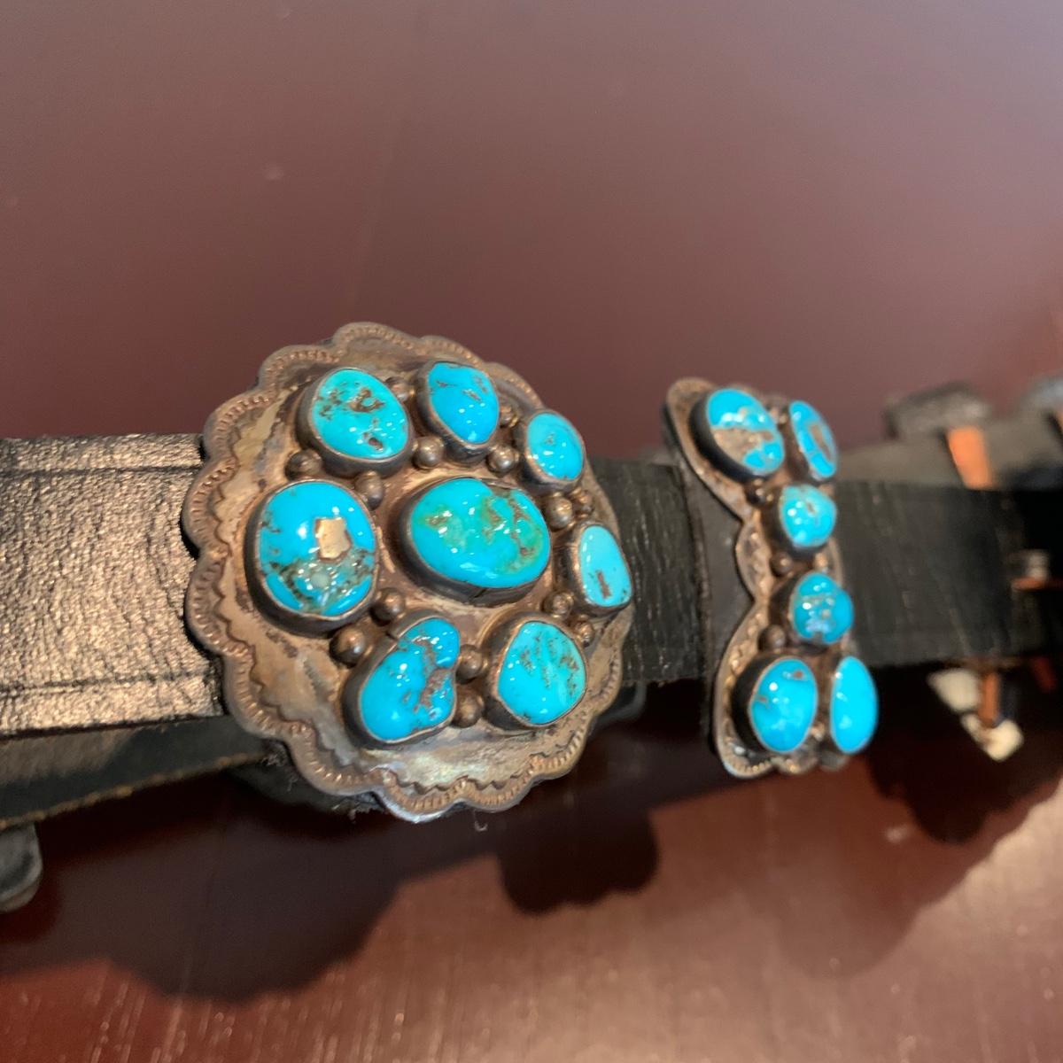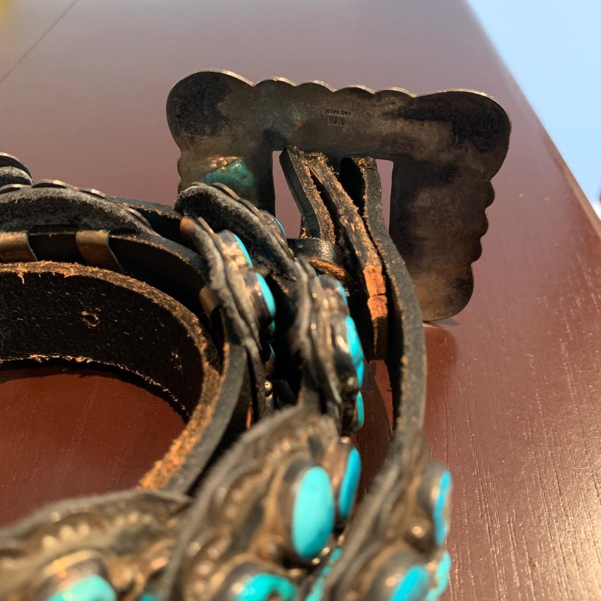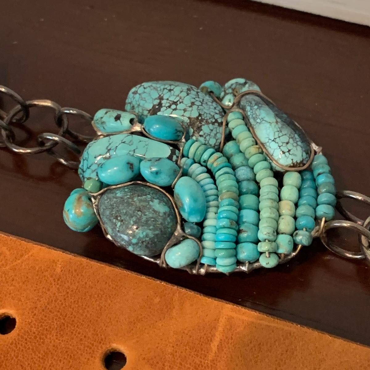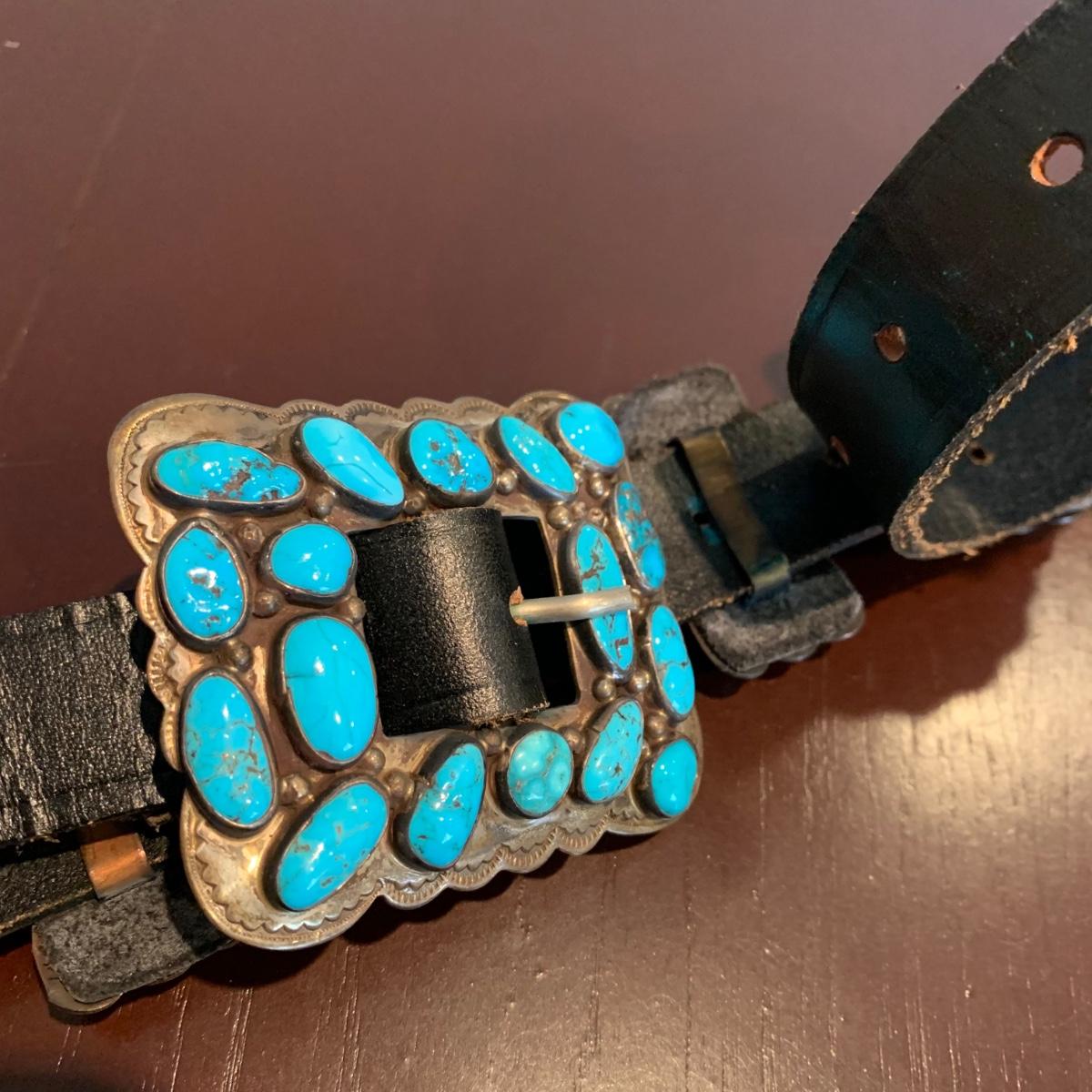 A very unique collection of very ornate women’s belts. 11 total belts are included, as well as a small hip pouch. All of the belts are leather (or have a leather feel) except the turquoise belt that is metal-based. You’ll notice one very unique belt with long feathers. Others have different sparkly rhinestones, metal adornments, and turquoise-colored stones. The belt with the leather base and turquoise stones is marked “Sterling”. The belts range in length from approximately 39” to 44”.