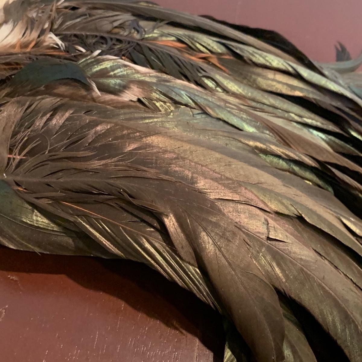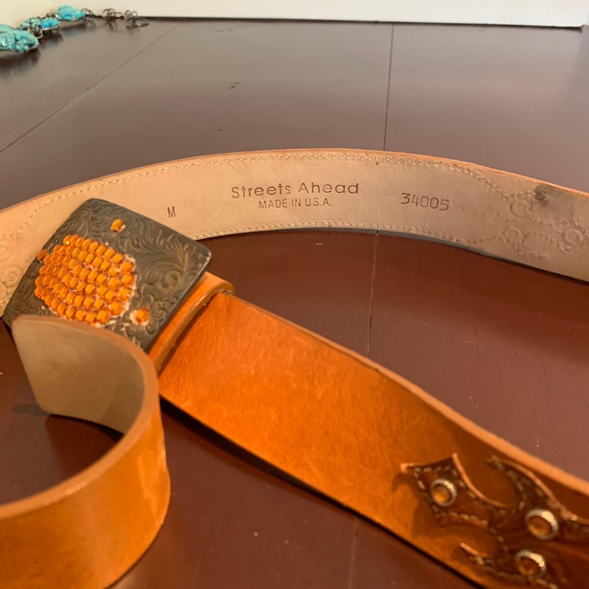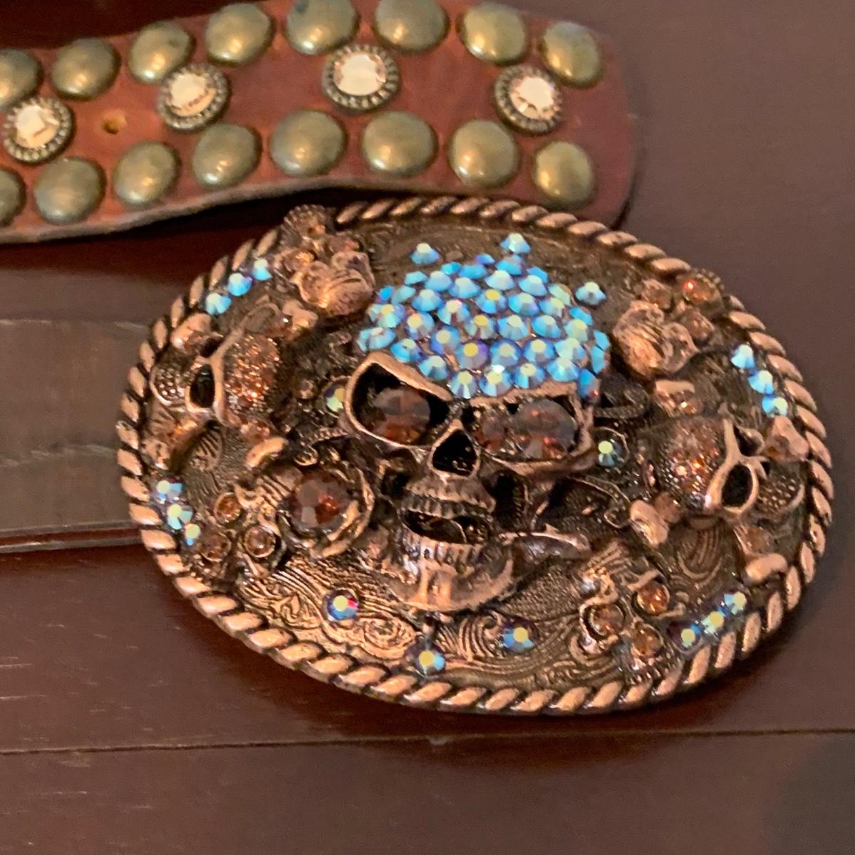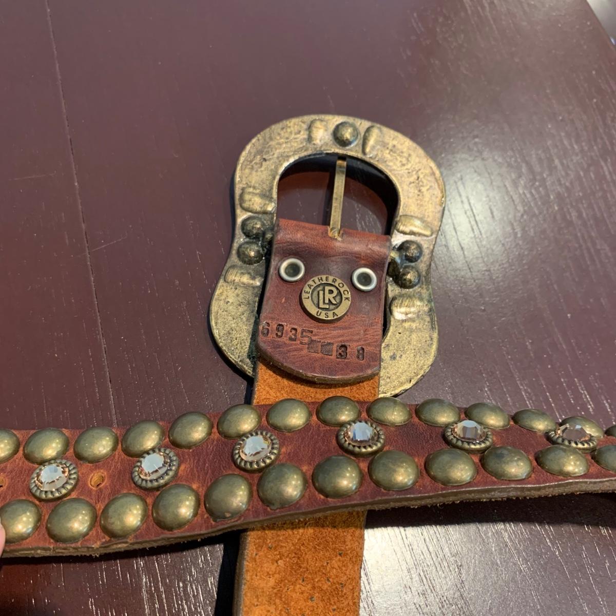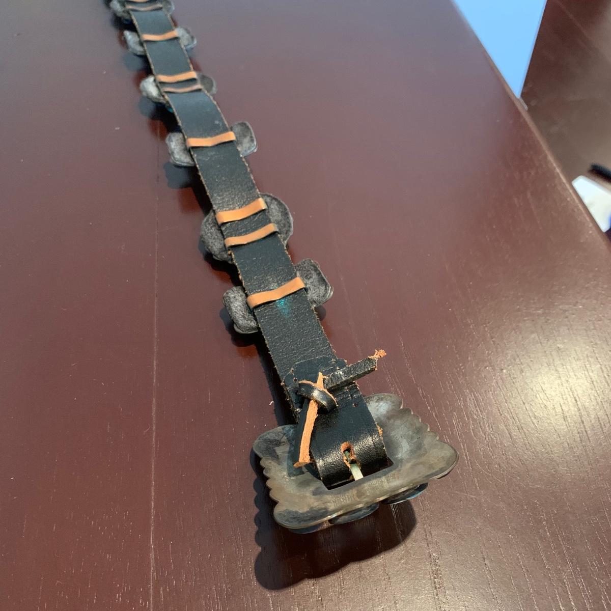 A very unique collection of very ornate women’s belts. 11 total belts are included, as well as a small hip pouch. All of the belts are leather (or have a leather feel) except the turquoise belt that is metal-based. You’ll notice one very unique belt with long feathers. Others have different sparkly rhinestones, metal adornments, and turquoise-colored stones. The belt with the leather base and turquoise stones is marked “Sterling”. The belts range in length from approximately 39” to 44”.