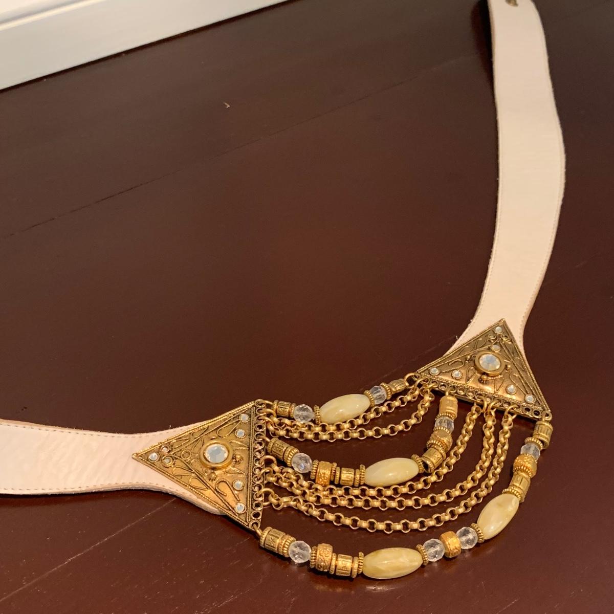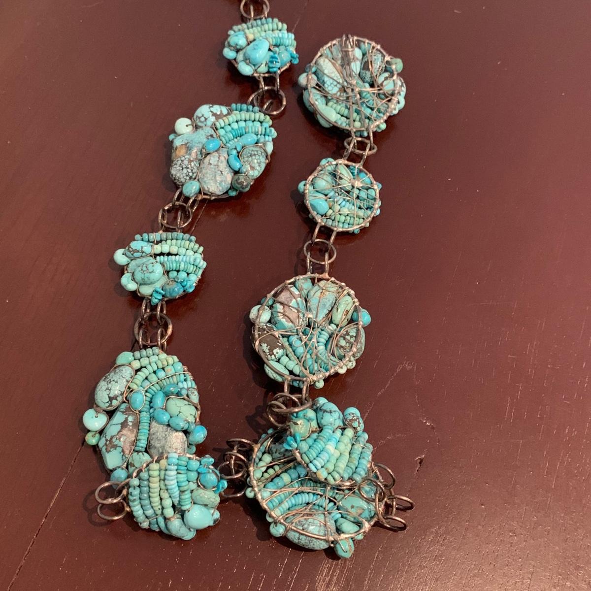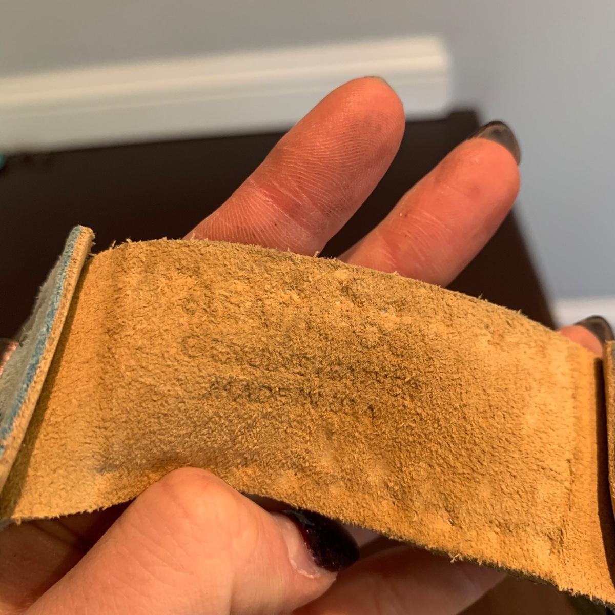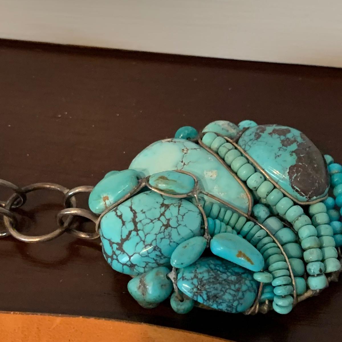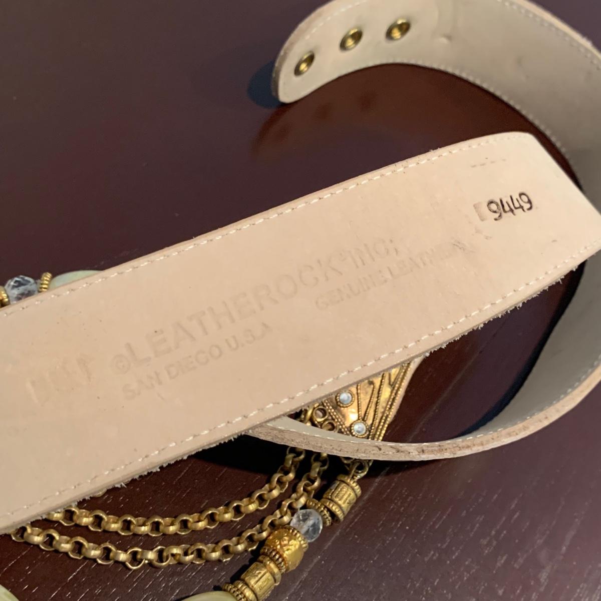 A very unique collection of very ornate women’s belts. 11 total belts are included, as well as a small hip pouch. All of the belts are leather (or have a leather feel) except the turquoise belt that is metal-based. You’ll notice one very unique belt with long feathers. Others have different sparkly rhinestones, metal adornments, and turquoise-colored stones. The belt with the leather base and turquoise stones is marked “Sterling”. The belts range in length from approximately 39” to 44”.