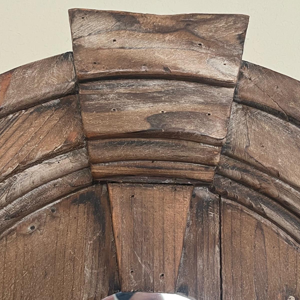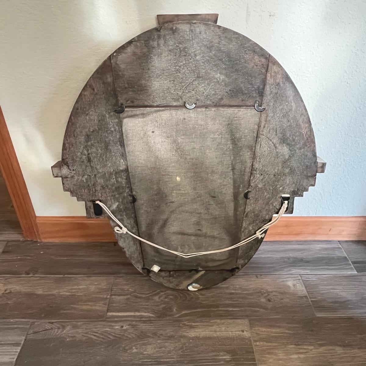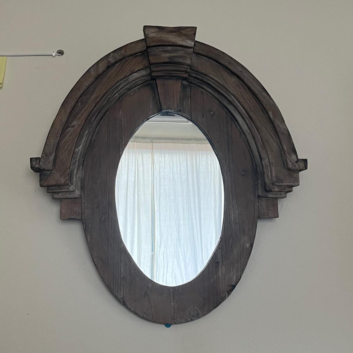 This unique Mansard oval wooden mirror has pieces of wood layered together in an arched frame. It is in good condition. Mirror measures 28” x 29.5” x 3”