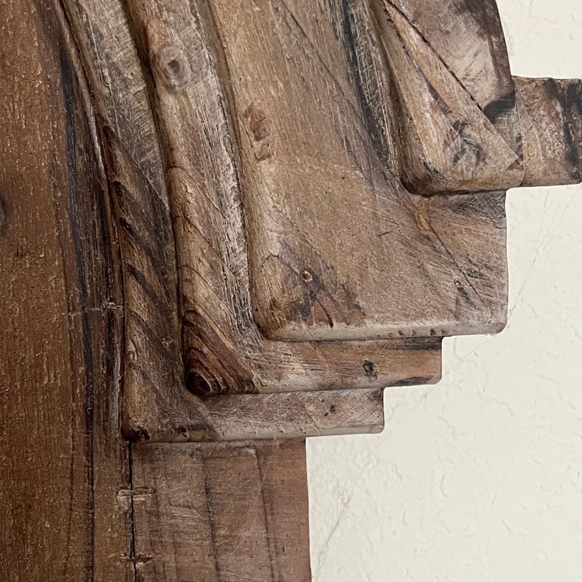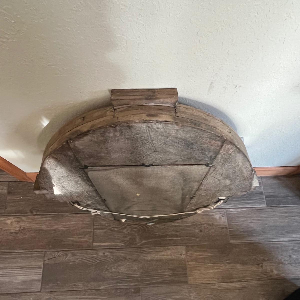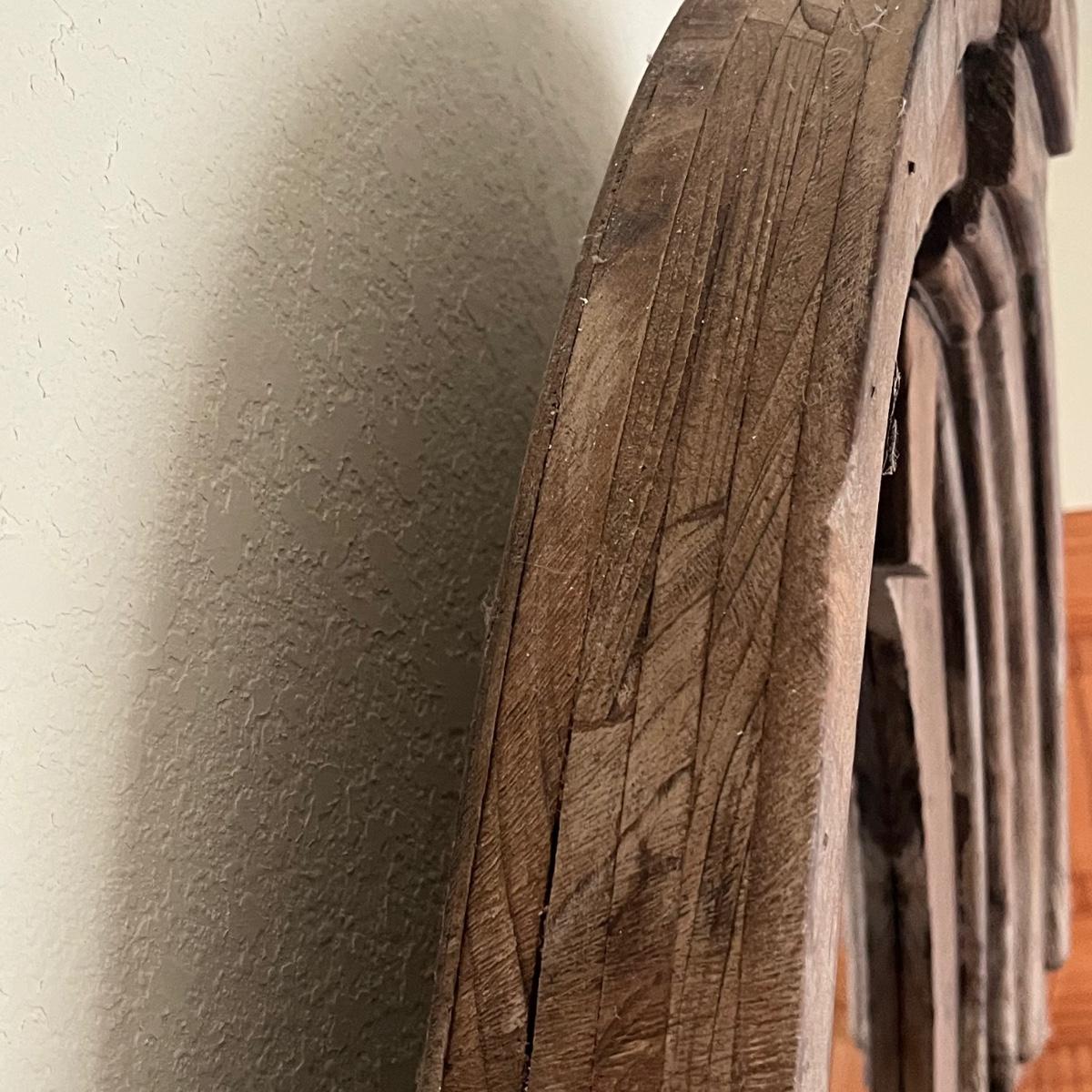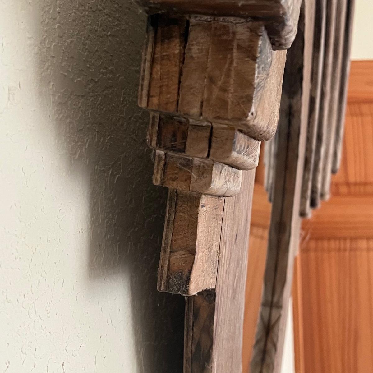 This unique Mansard oval wooden mirror has pieces of wood layered together in an arched frame. It is in good condition. Mirror measures 28” x 29.5” x 3”