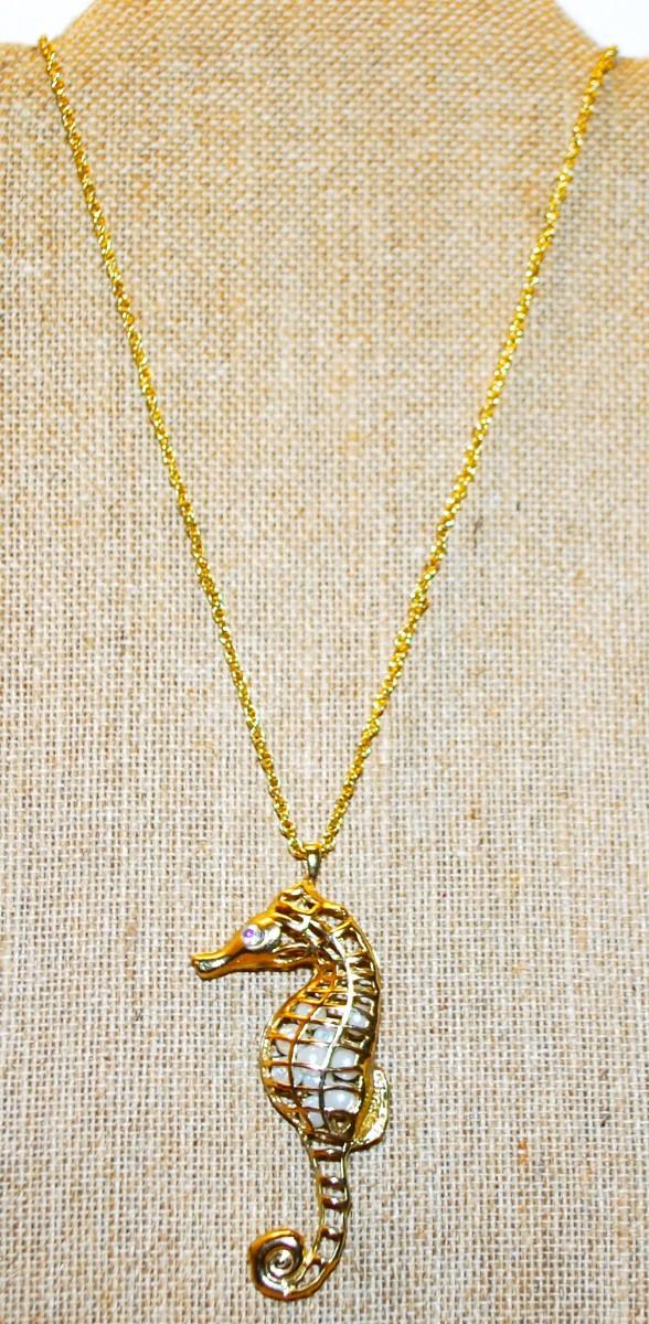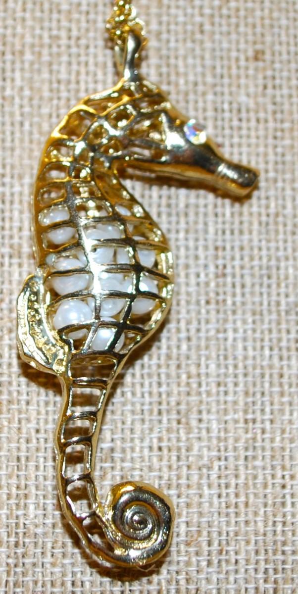 Unique "Pearls in the Belly Seahorse" PENDANT (3¾" x 1¼") on a Gold Tone Necklace Chain 22" L