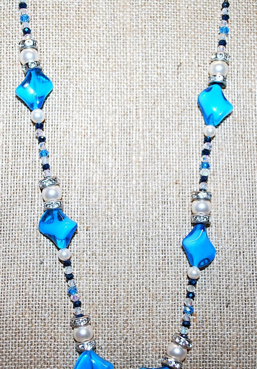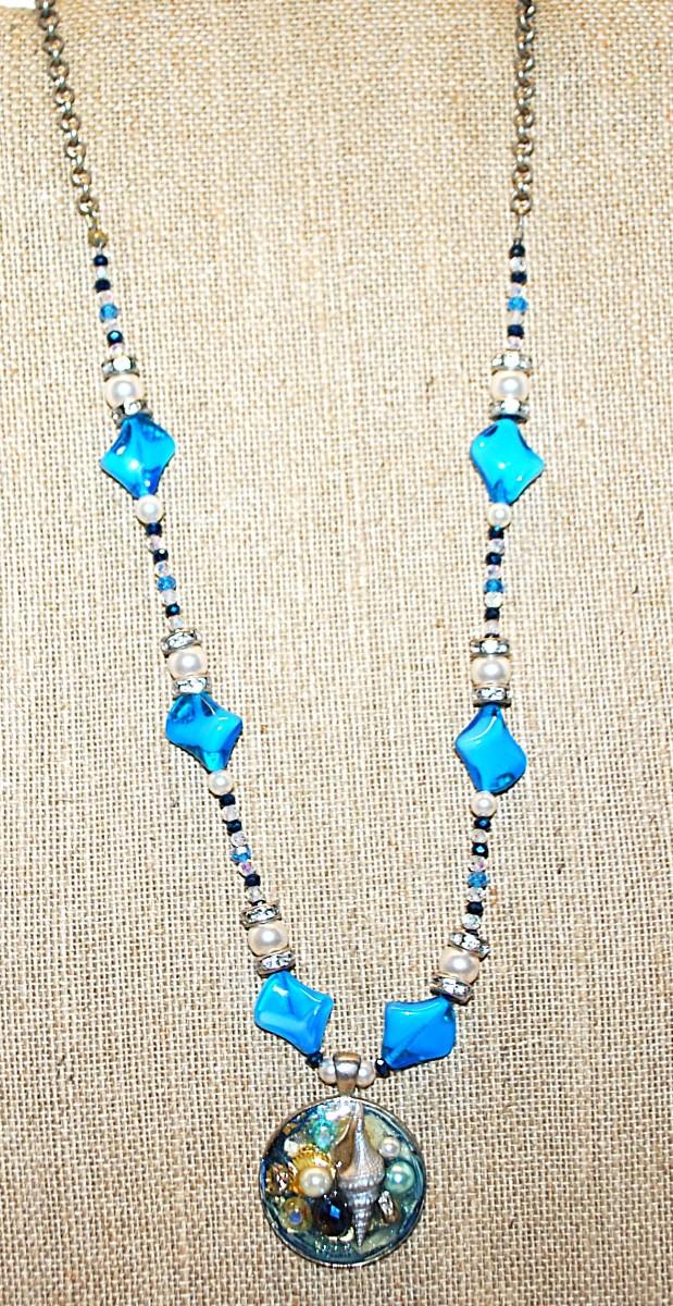 Unique "PEARLS & SEASHELLS" PENDANT (1¼" Diam.) NECKLACE with Blue Acrylic Beads Accents on a Silver Tone Chain & Decorated Toggle Clasp 24" L
