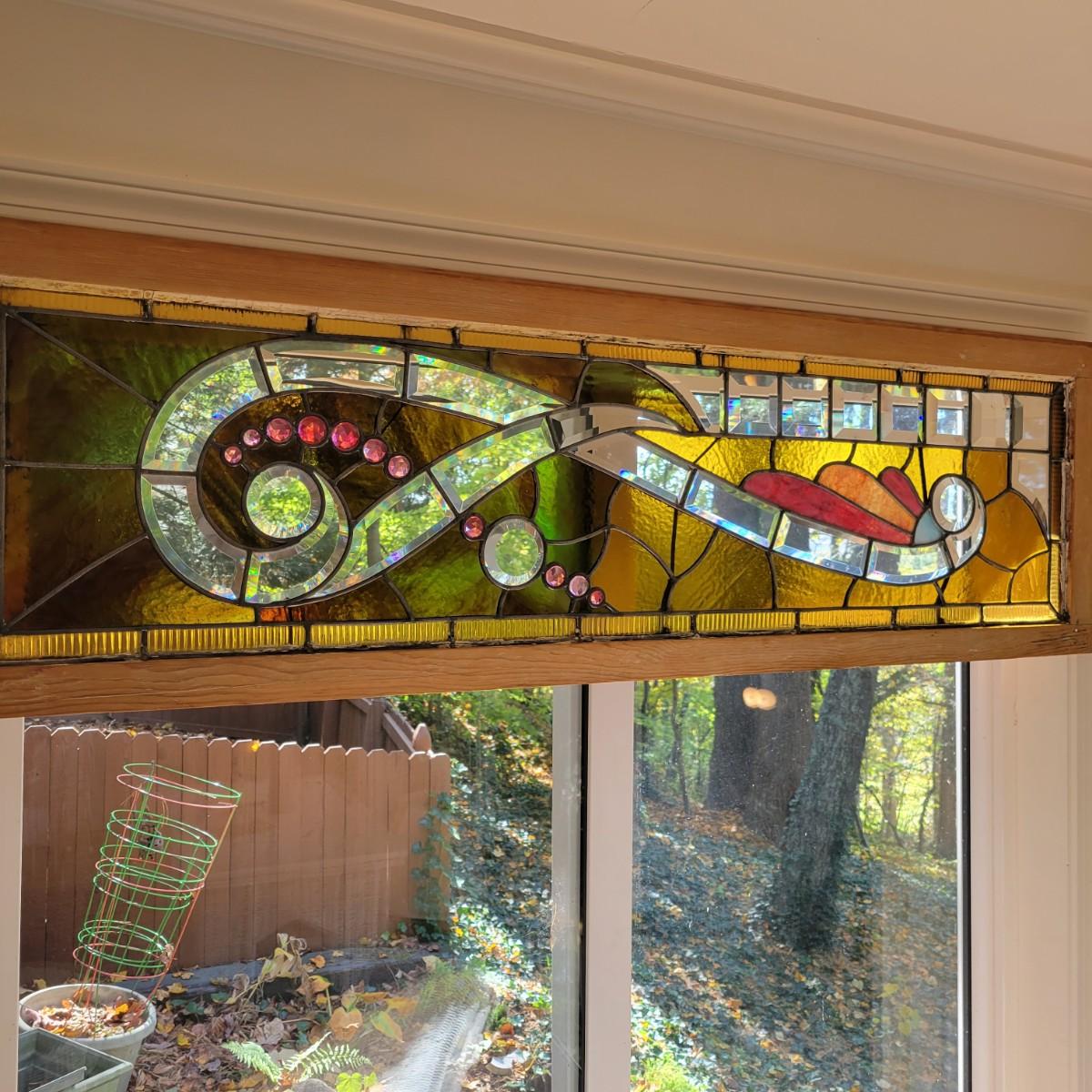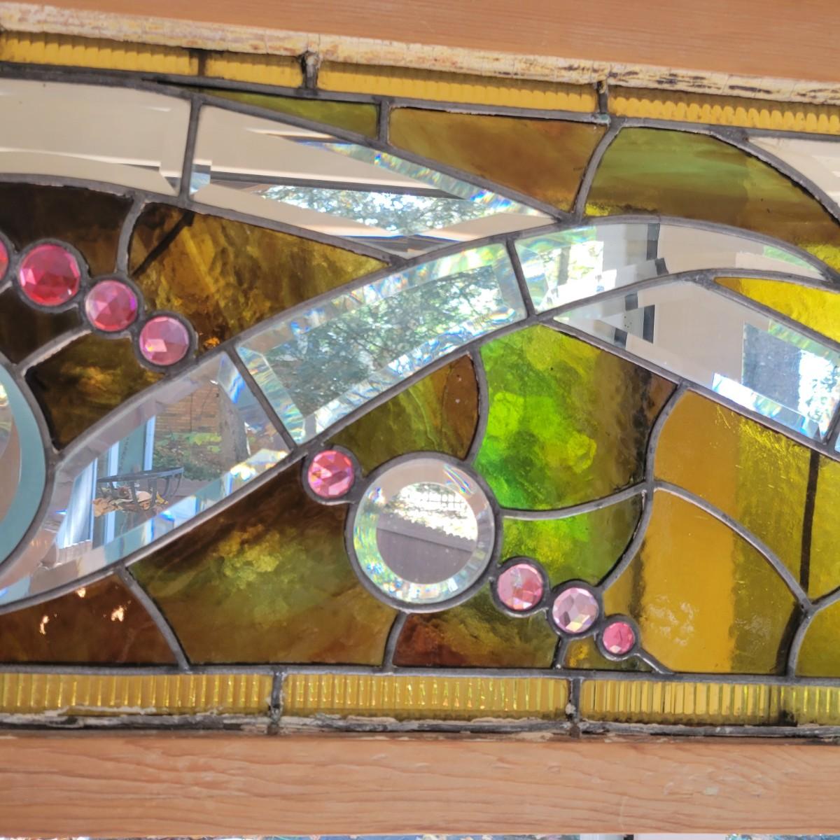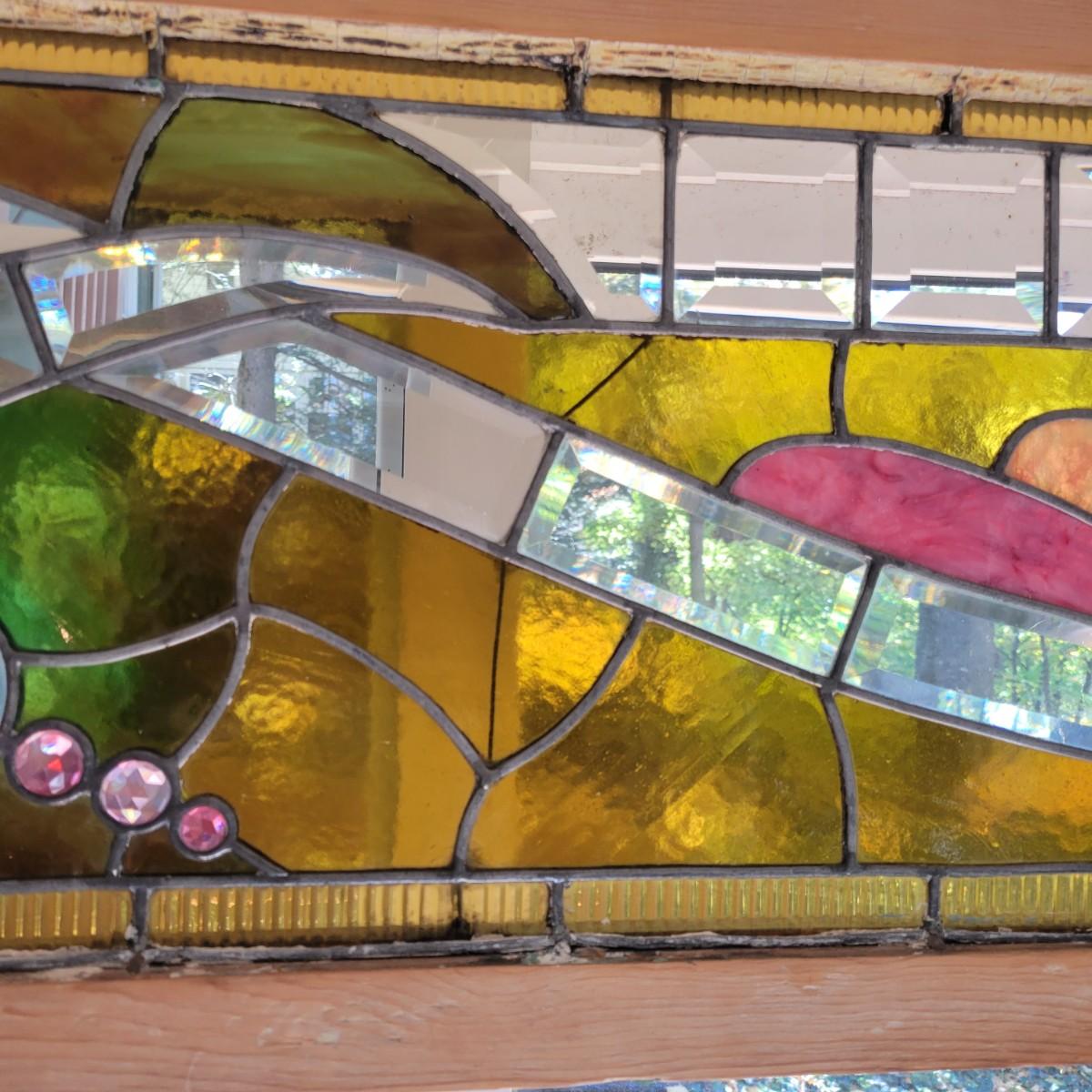 A unique piece of stained glass in good condition. This piece is in a raw wood block frame for support and features greens, golds and pink glass pieces. This piece measures approximately 58.5" x 17.5" x 2". Winning bidder will need to remove this piece from its current location. Eight philips head screws will need to be removed and they are in a tight location. Local pickup only