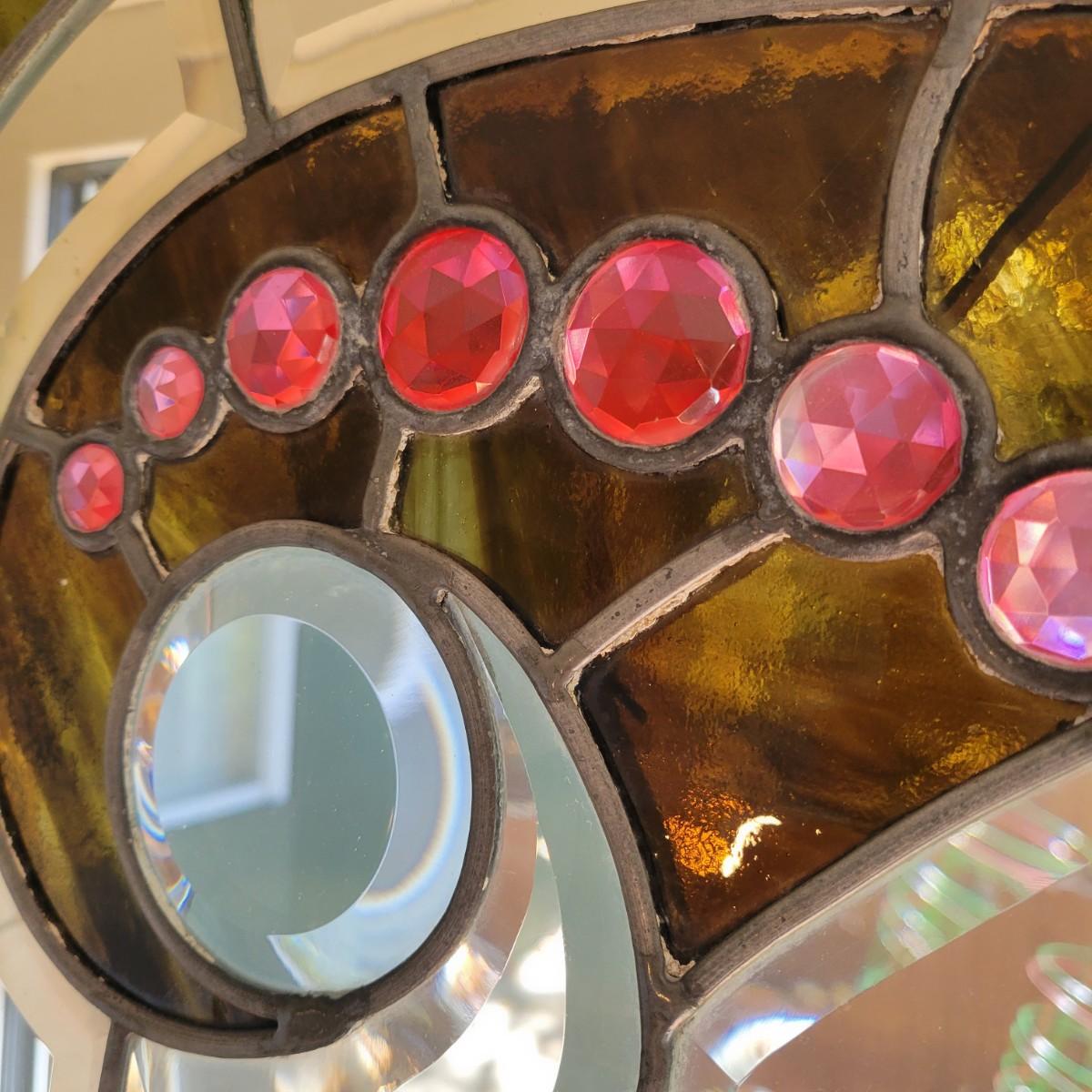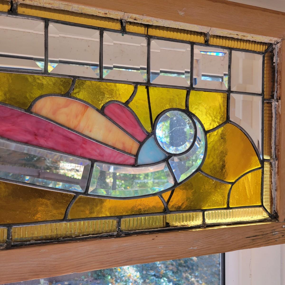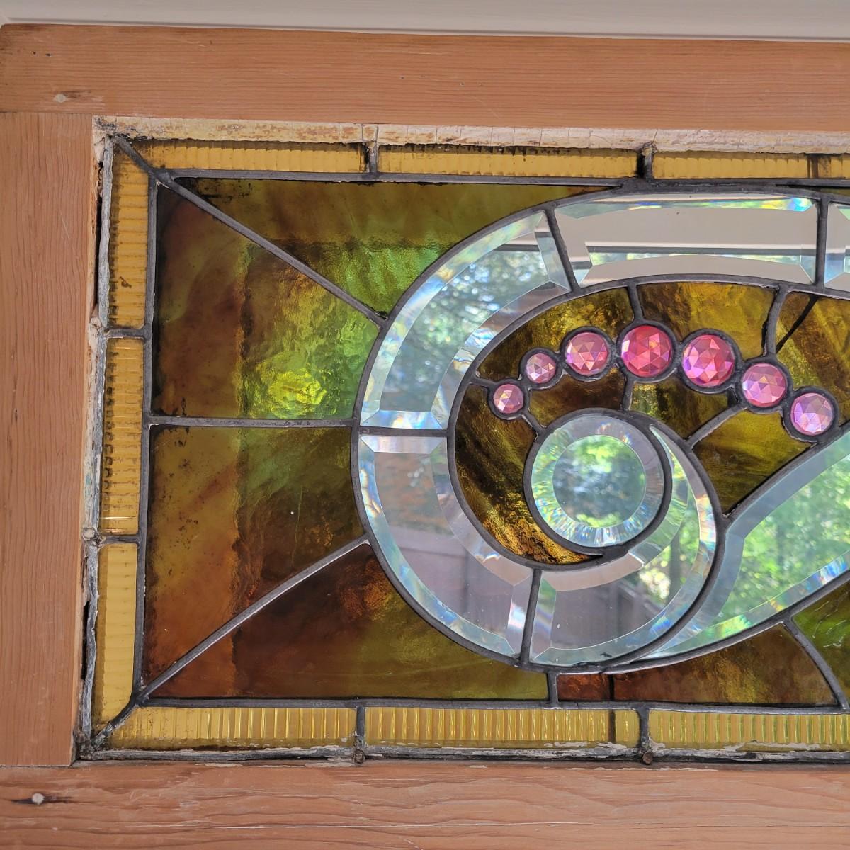 A unique piece of stained glass in good condition. This piece is in a raw wood block frame for support and features greens, golds and pink glass pieces. This piece measures approximately 58.5" x 17.5" x 2". Winning bidder will need to remove this piece from its current location. Eight philips head screws will need to be removed and they are in a tight location. Local pickup only