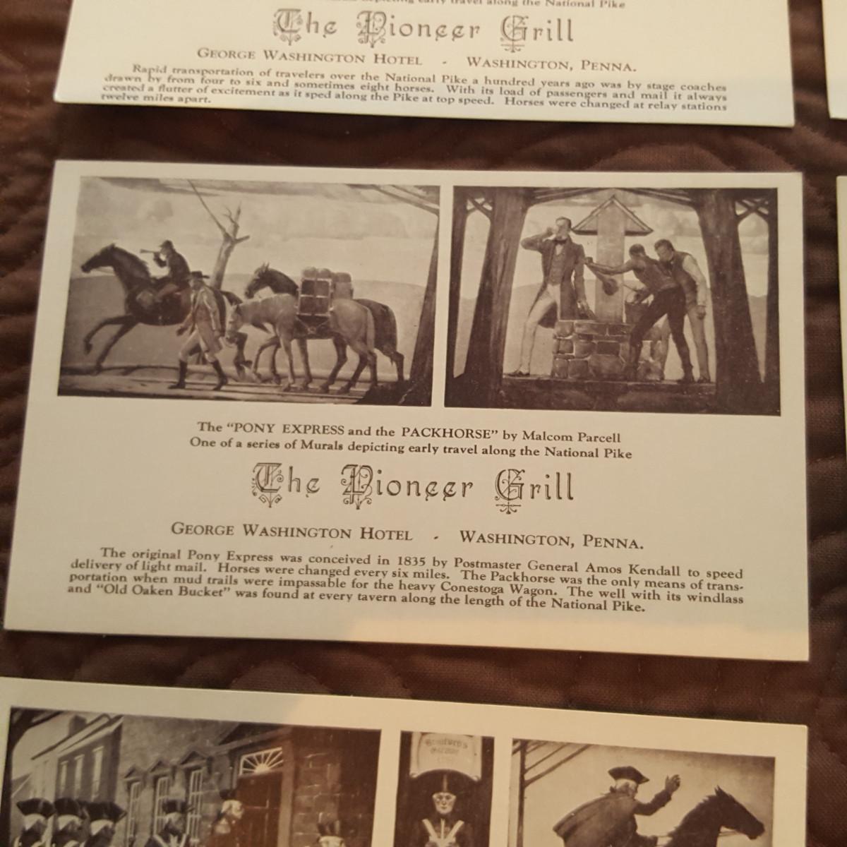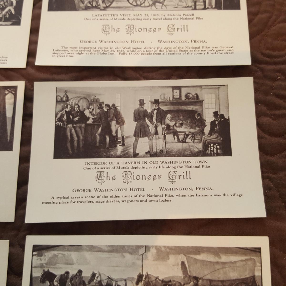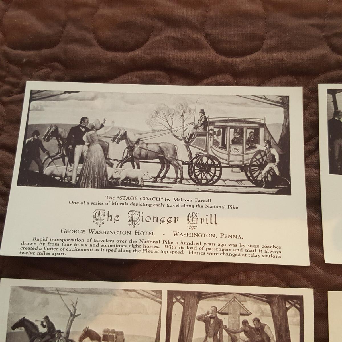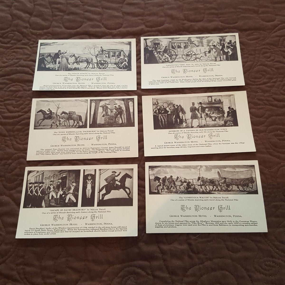 This auction lot is for a grouping of Pioneer Grill Mural Postcards. The collection includes views of the 6 interior murals from the famed George Washington Hotel in Washington, PA. Malcolm Parcell created 6 murals for the Pioneer room. The Conestoga Wagon, Pony Express, Pack Horse, Stage Coach, Lafayette visits Washington, and Bradford's Escape . The murals can still be viewed and the hotel is being restored. A nice vintage grouping.