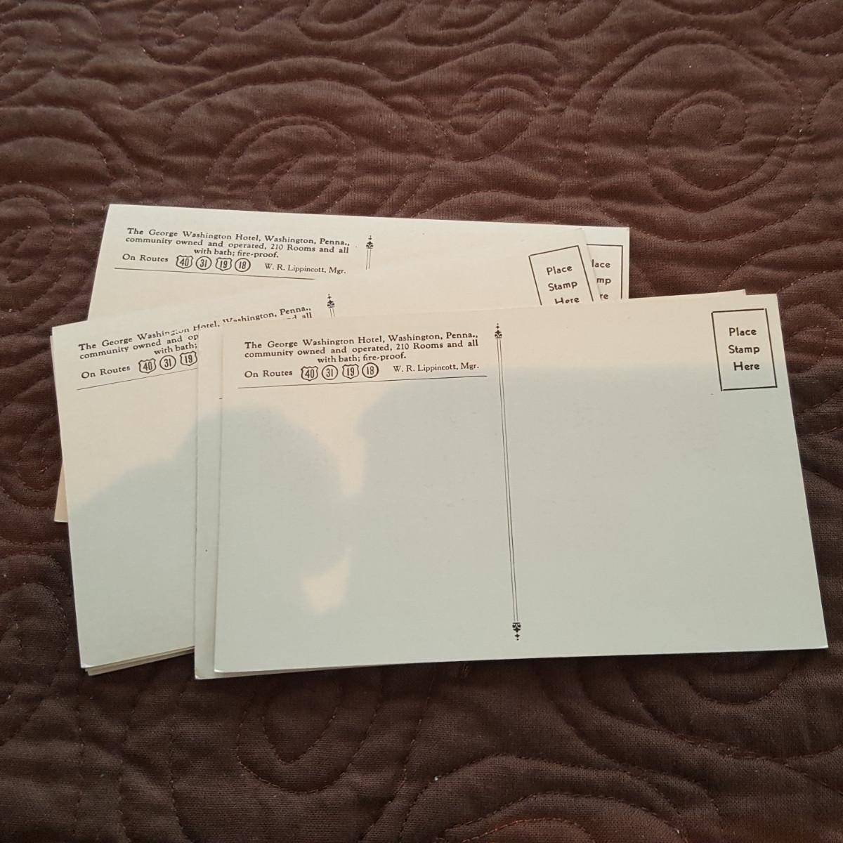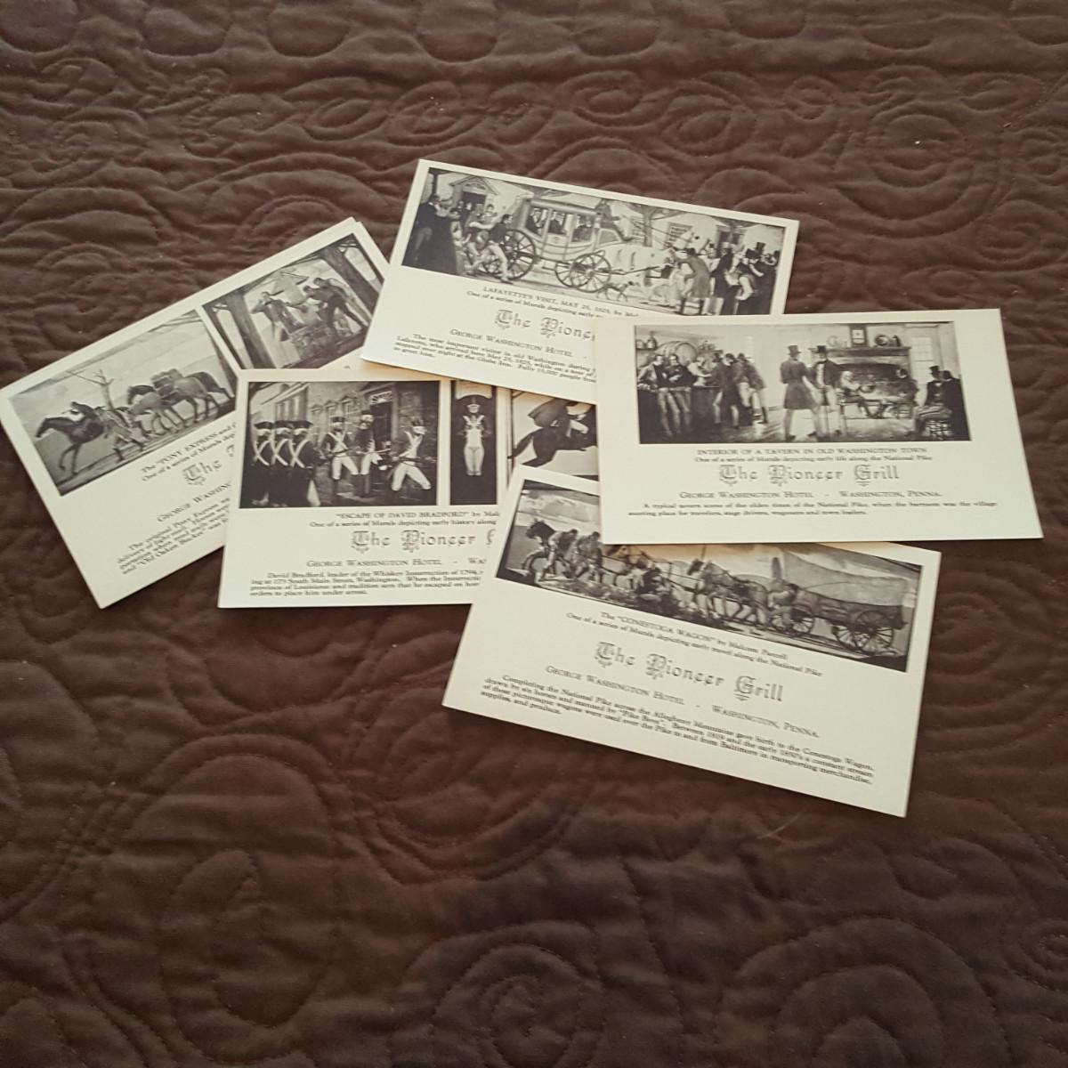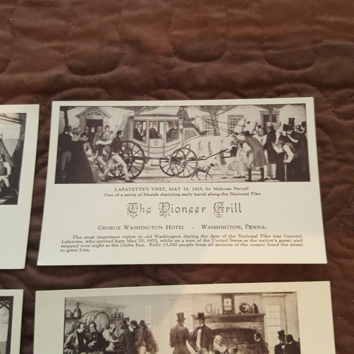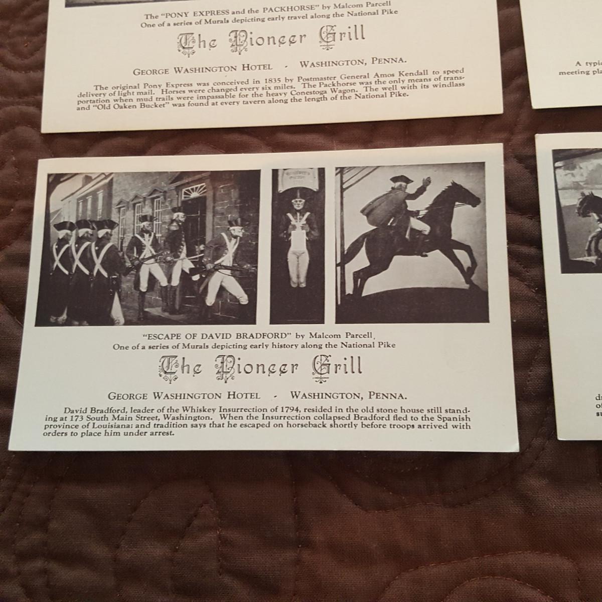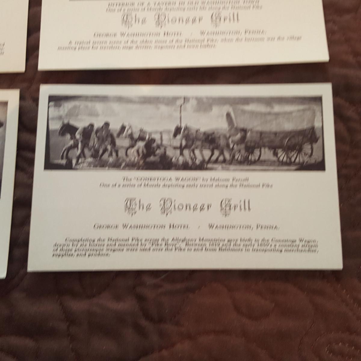 This auction lot is for a grouping of Pioneer Grill Mural Postcards. The collection includes views of the 6 interior murals from the famed George Washington Hotel in Washington, PA. Malcolm Parcell created 6 murals for the Pioneer room. The Conestoga Wagon, Pony Express, Pack Horse, Stage Coach, Lafayette visits Washington, and Bradford's Escape . The murals can still be viewed and the hotel is being restored. A nice vintage grouping.