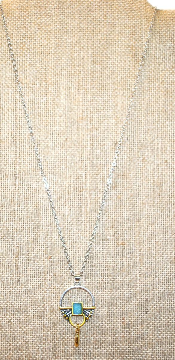 Unique Polymer Blue/Green Square Set in a Graphic Designed PENDANT (¾" Diameter) on a Silver Tone Necklace Chain 18" L