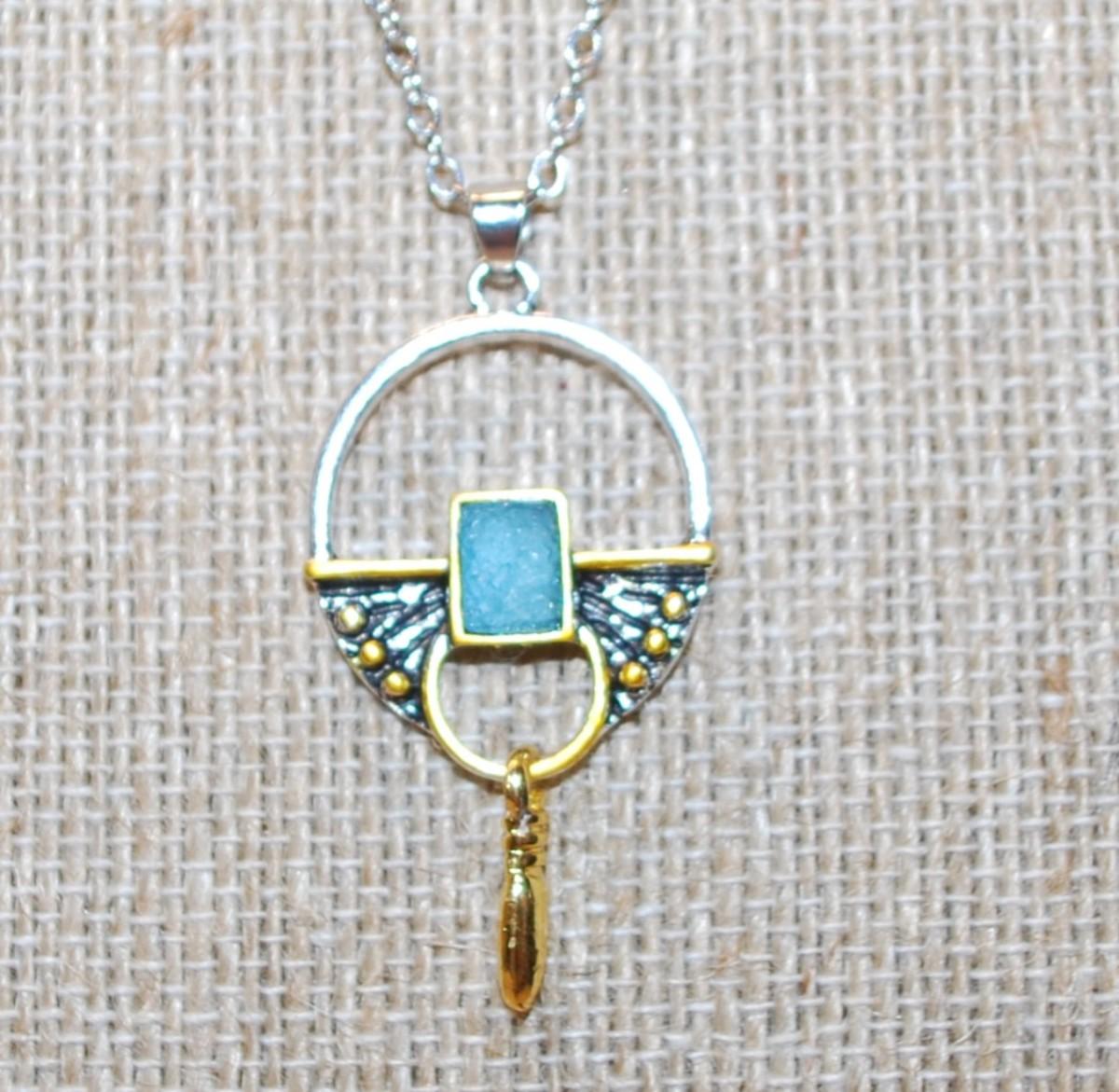Unique Polymer Blue/Green Square Set in a Graphic Designed PENDANT (¾" Diameter) on a Silver Tone Necklace Chain 18" L