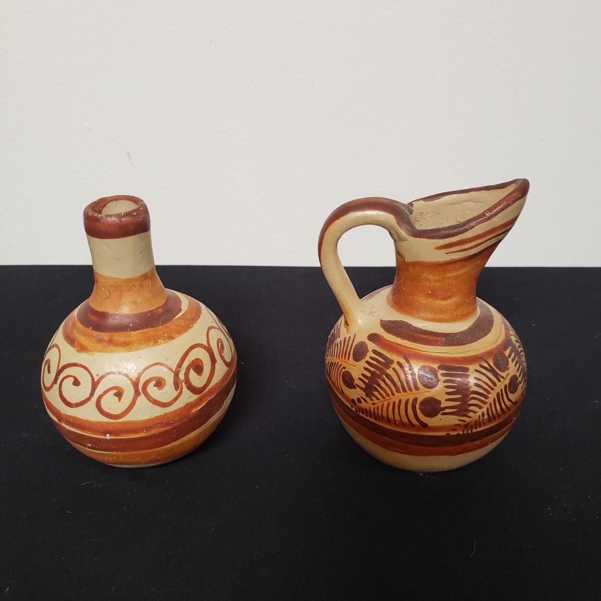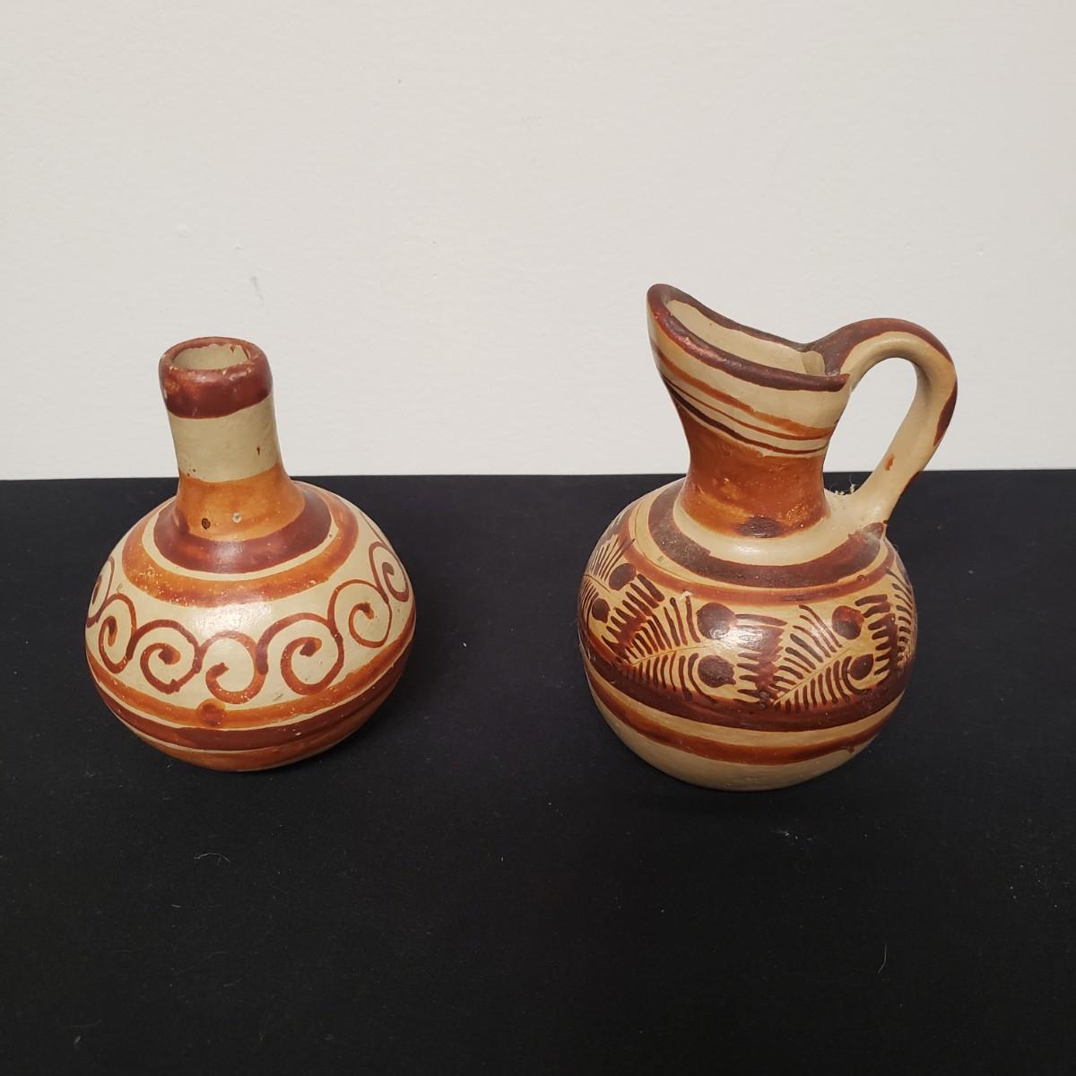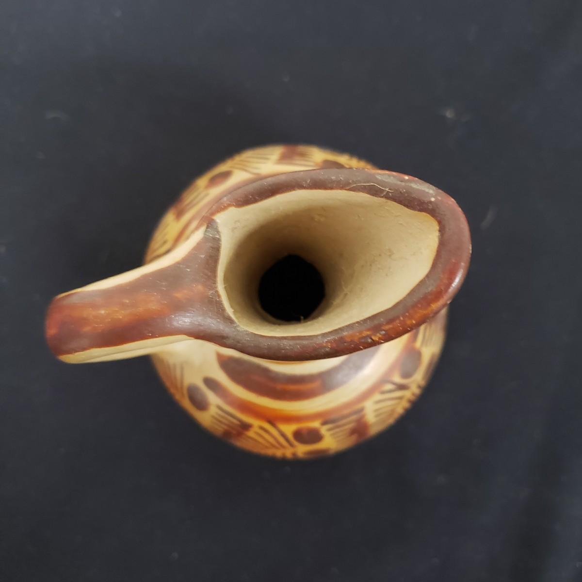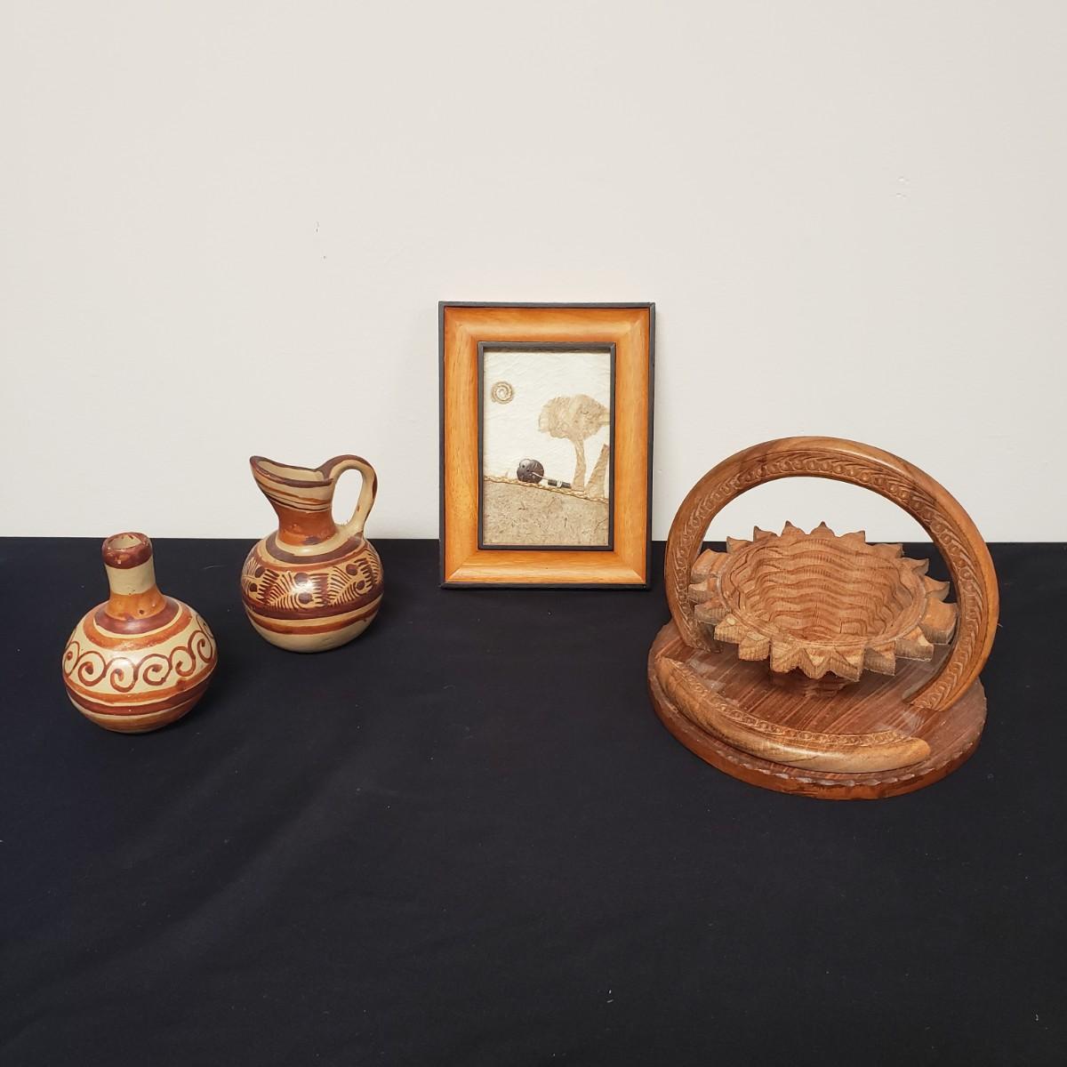 This lot contains 4 pieces of unique art. The pottery pitcher (4"x5") and vase (3"x5") have a southwest flare to them. A wooden frame features an outdoor scene made from homemade paper (6"x1"x8"). Finally a very unique wooden bowl with a carved handle that can collapse flat (8"x7"). All pieces appear to be in good condition.