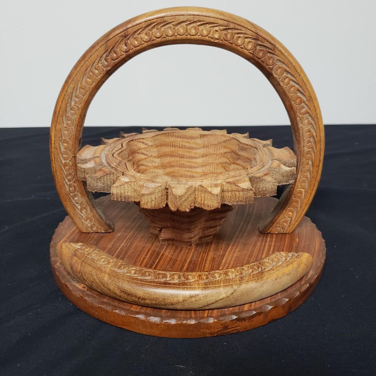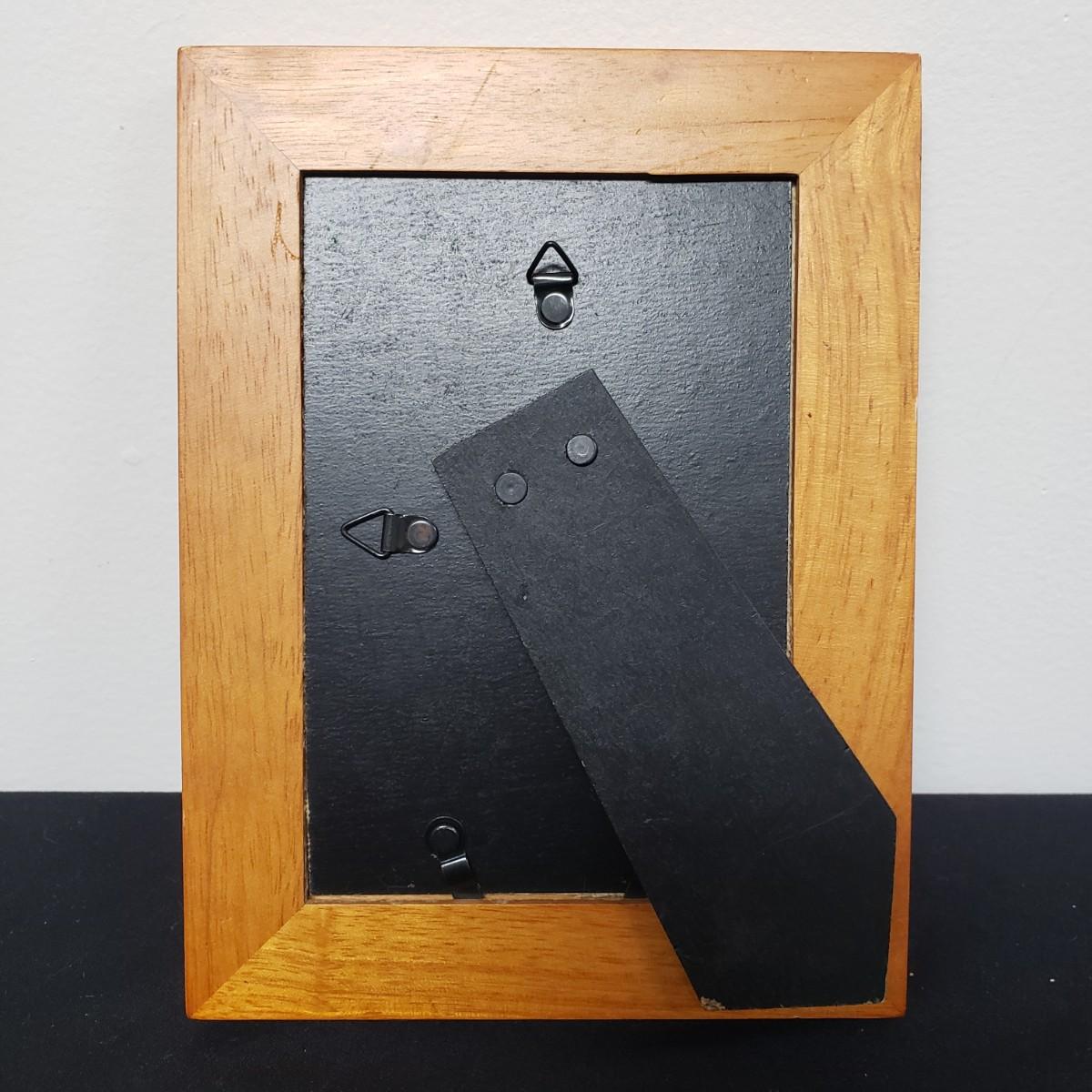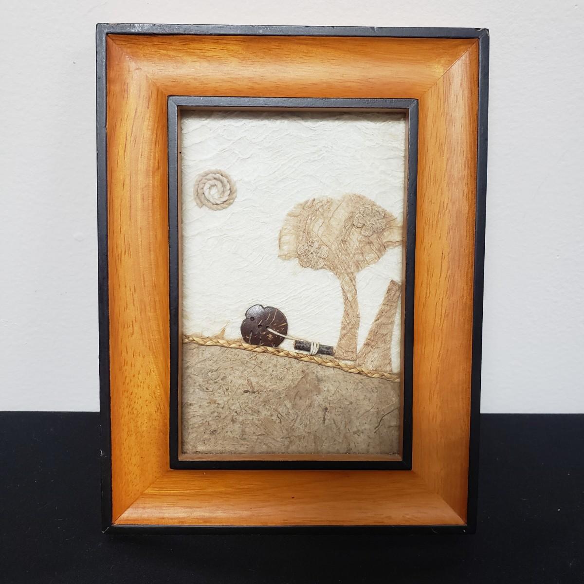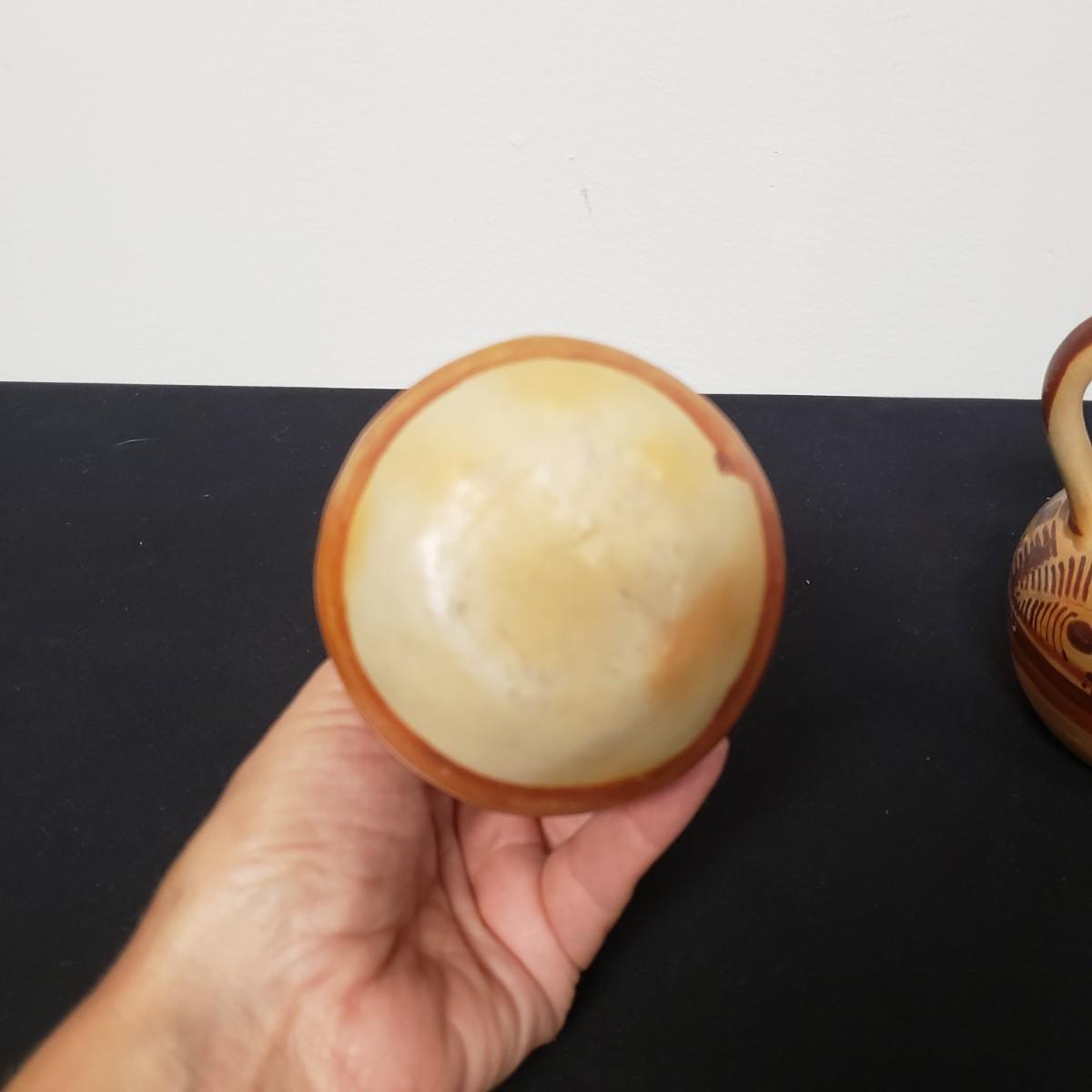 This lot contains 4 pieces of unique art. The pottery pitcher (4"x5") and vase (3"x5") have a southwest flare to them. A wooden frame features an outdoor scene made from homemade paper (6"x1"x8"). Finally a very unique wooden bowl with a carved handle that can collapse flat (8"x7"). All pieces appear to be in good condition.