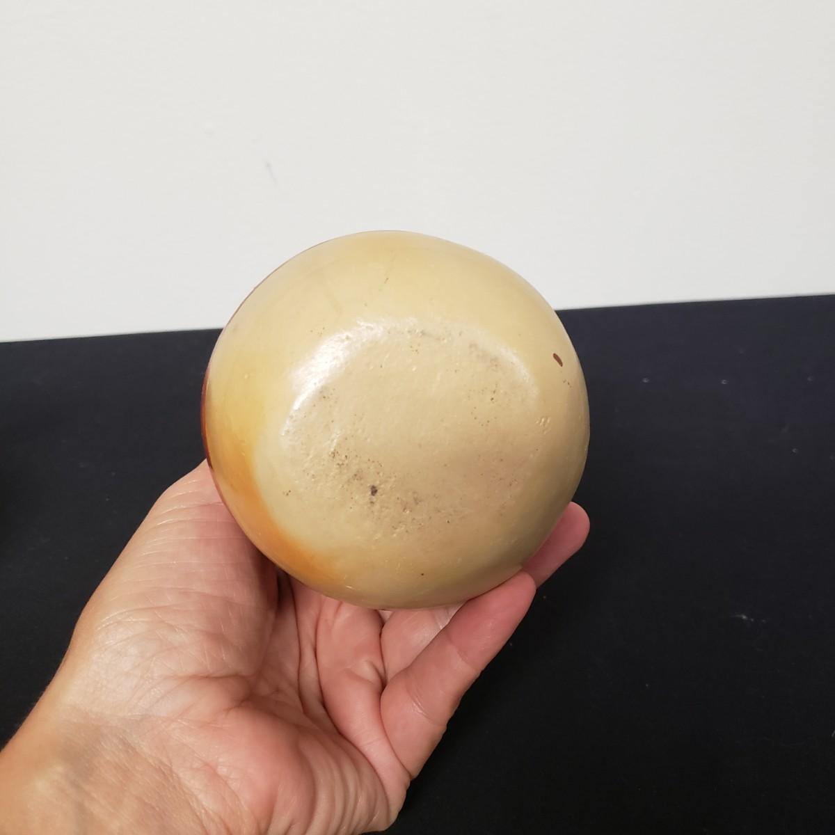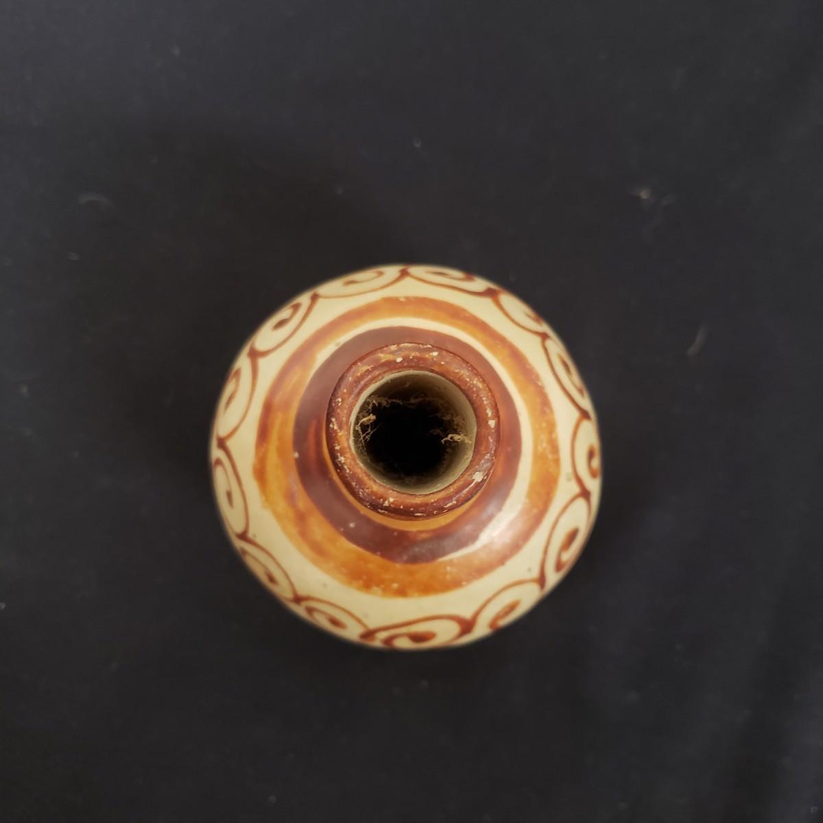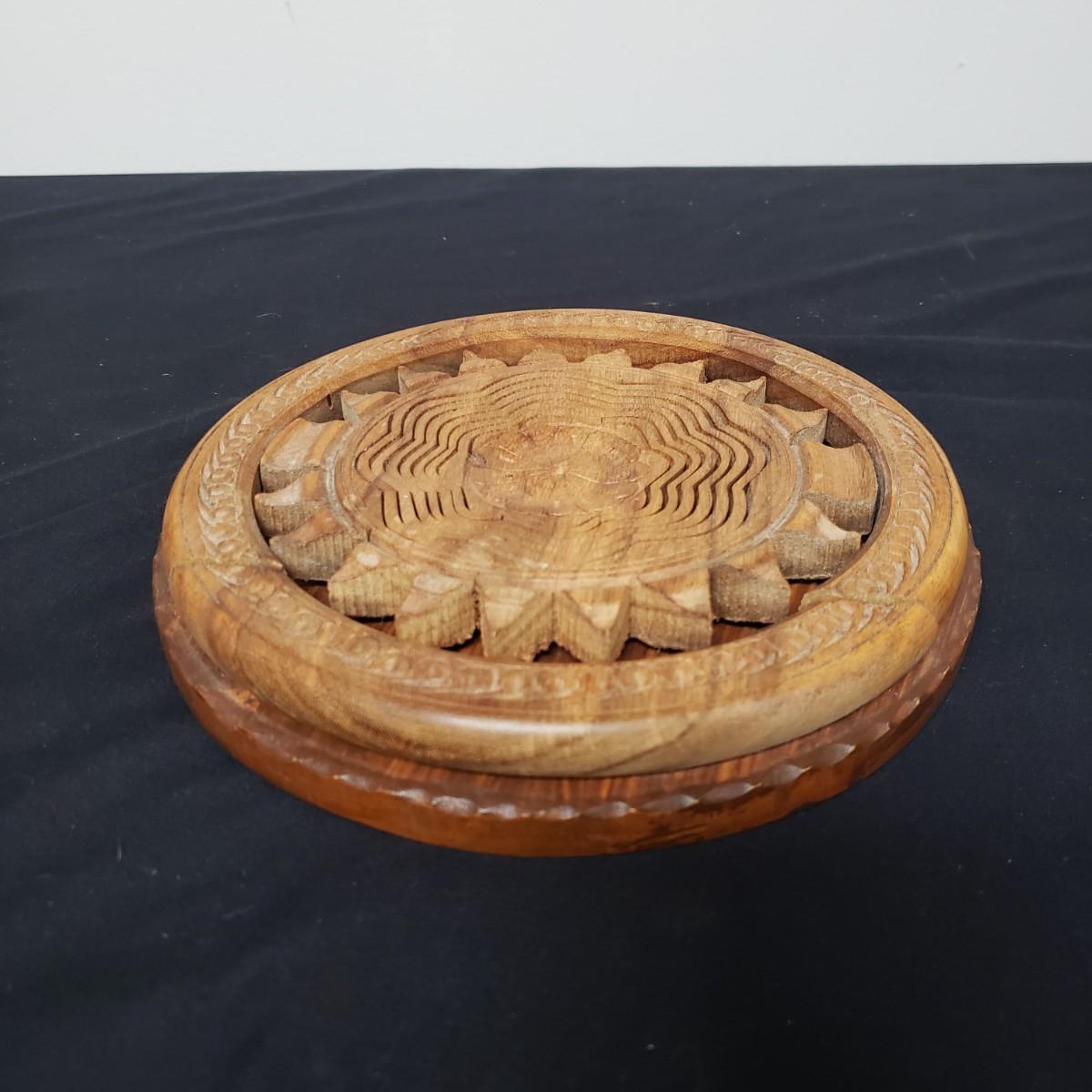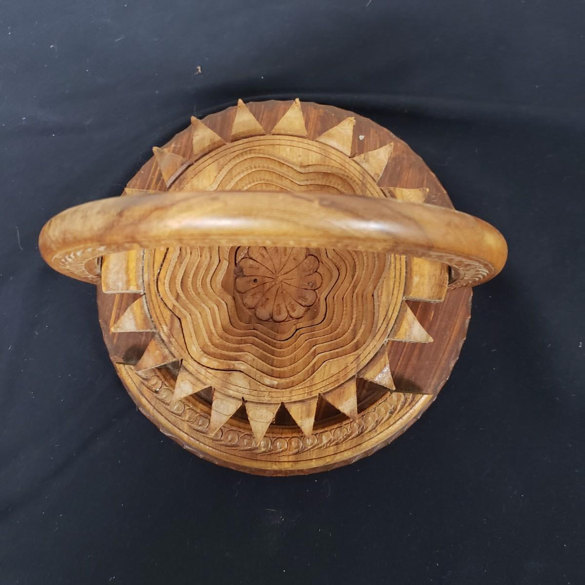 This lot contains 4 pieces of unique art. The pottery pitcher (4"x5") and vase (3"x5") have a southwest flare to them. A wooden frame features an outdoor scene made from homemade paper (6"x1"x8"). Finally a very unique wooden bowl with a carved handle that can collapse flat (8"x7"). All pieces appear to be in good condition.