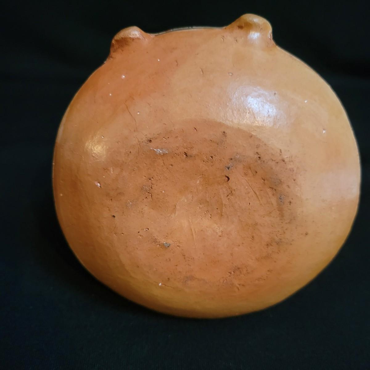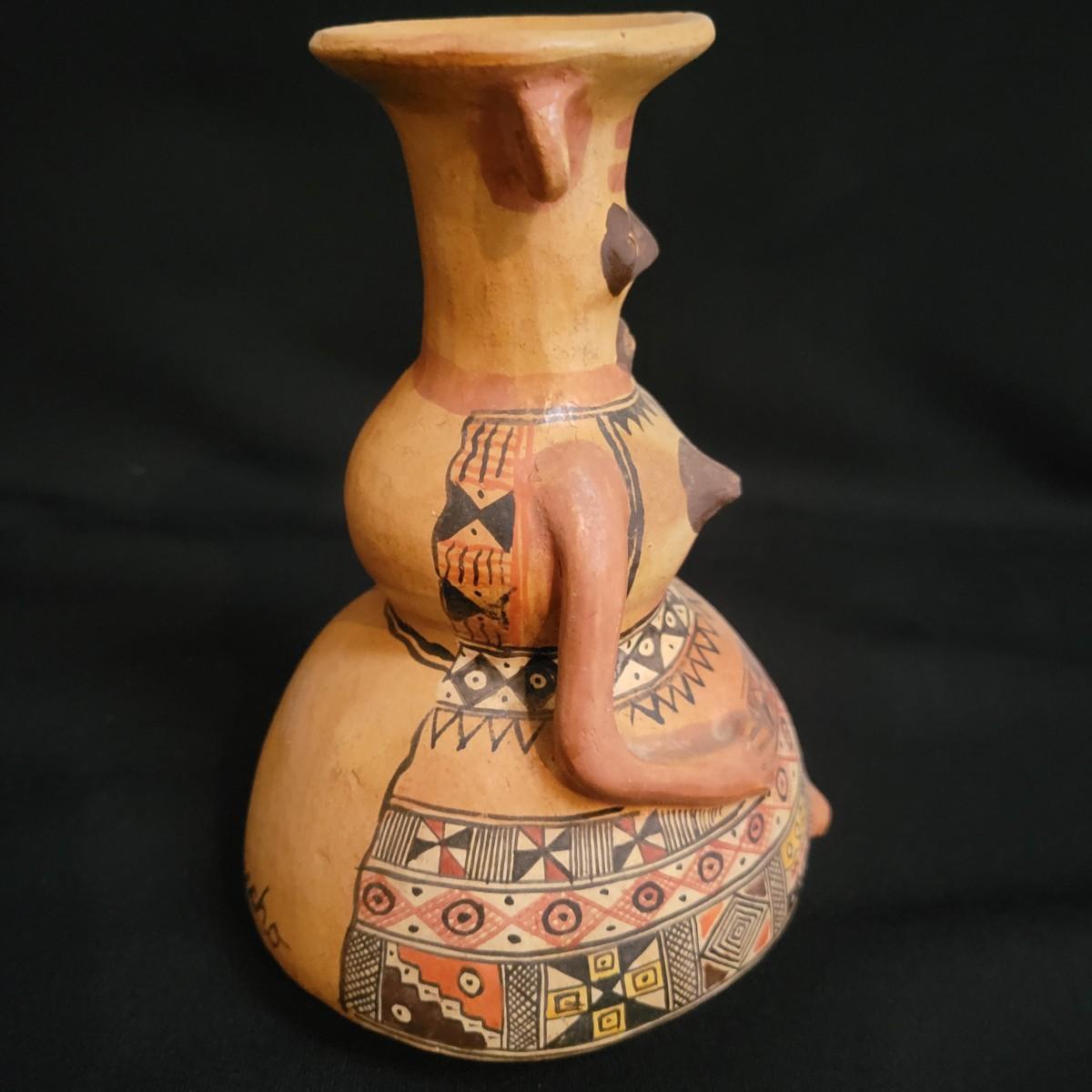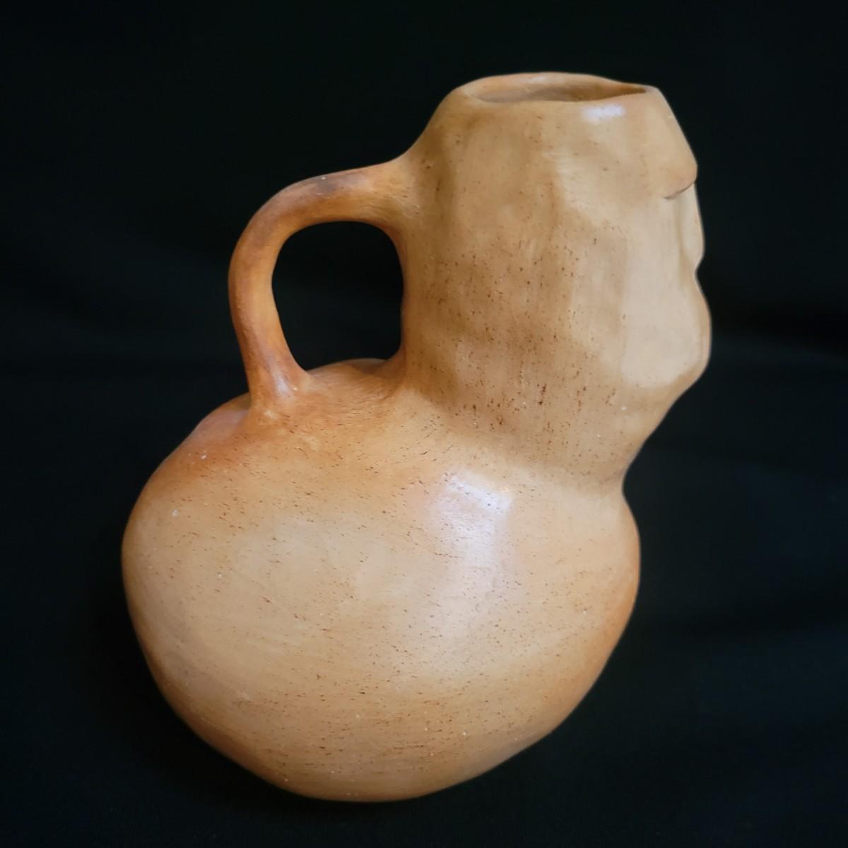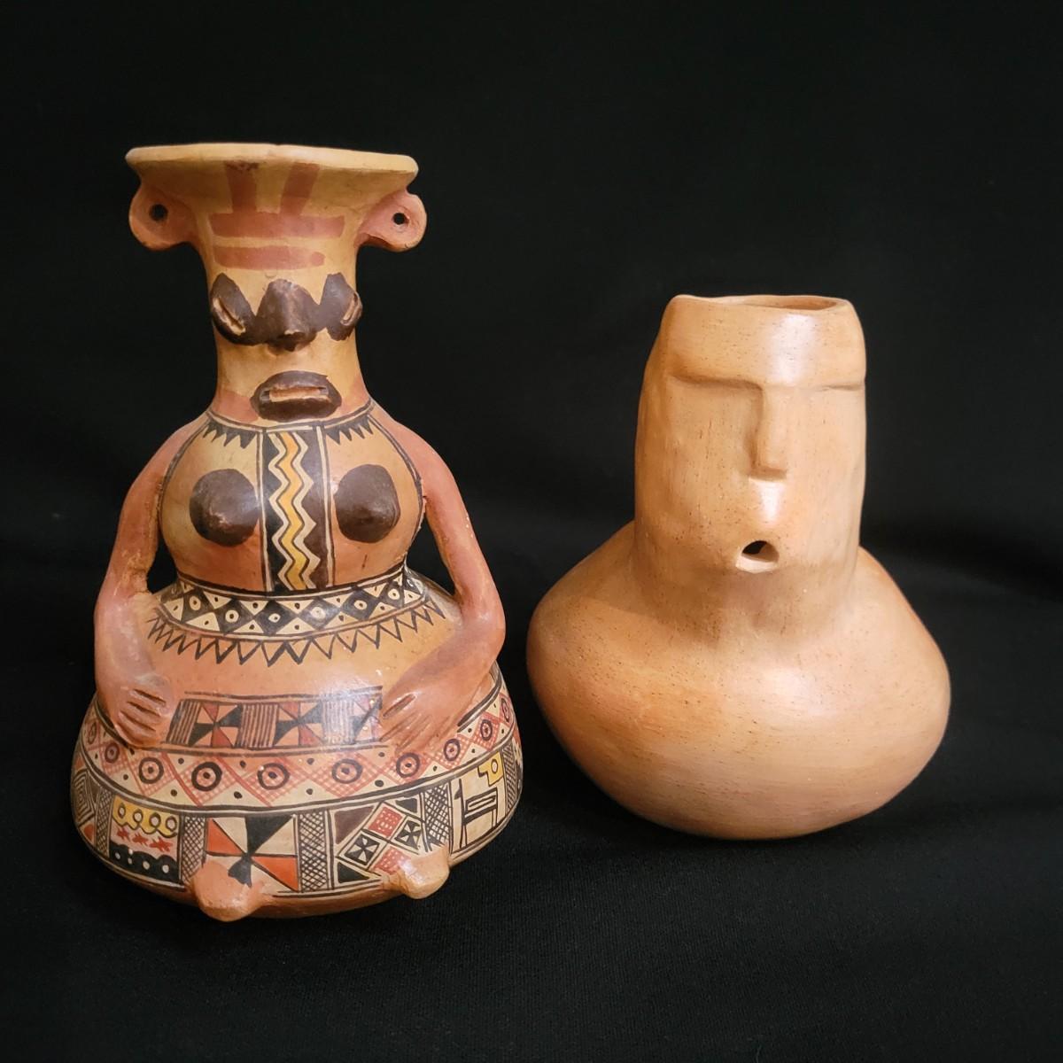 A pair of unique pottery pieces. One piece appears to be hand painted and is also signed. It measures approximately 4.5"D x 6.5"H. The other piece appears to be a small pitcher with a pour spout at the mouth. Shipping available
