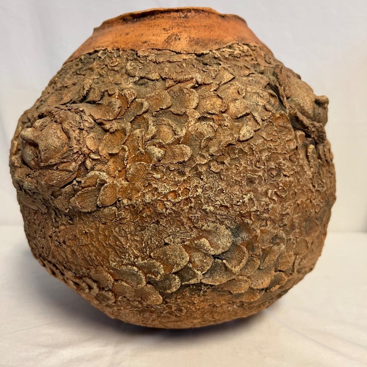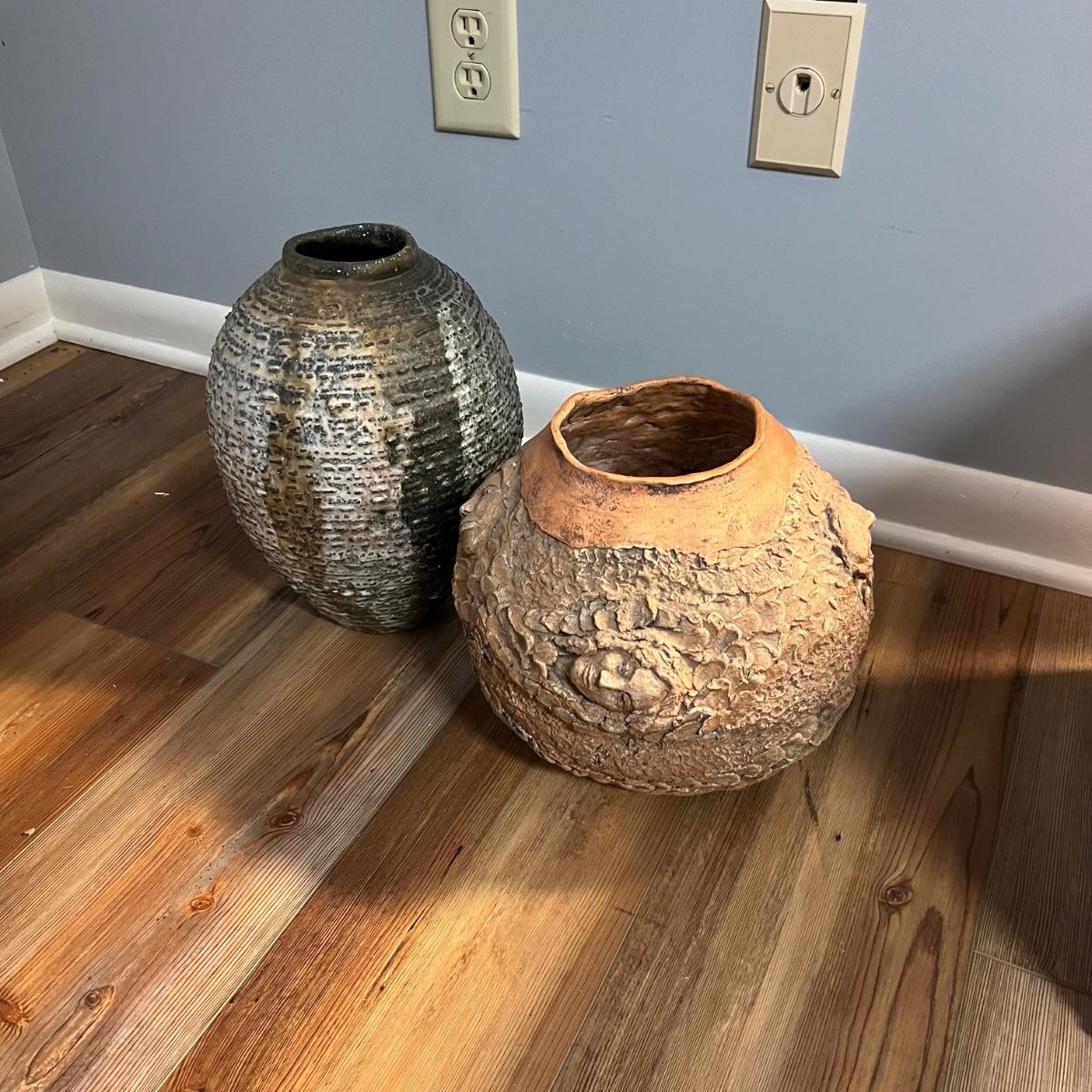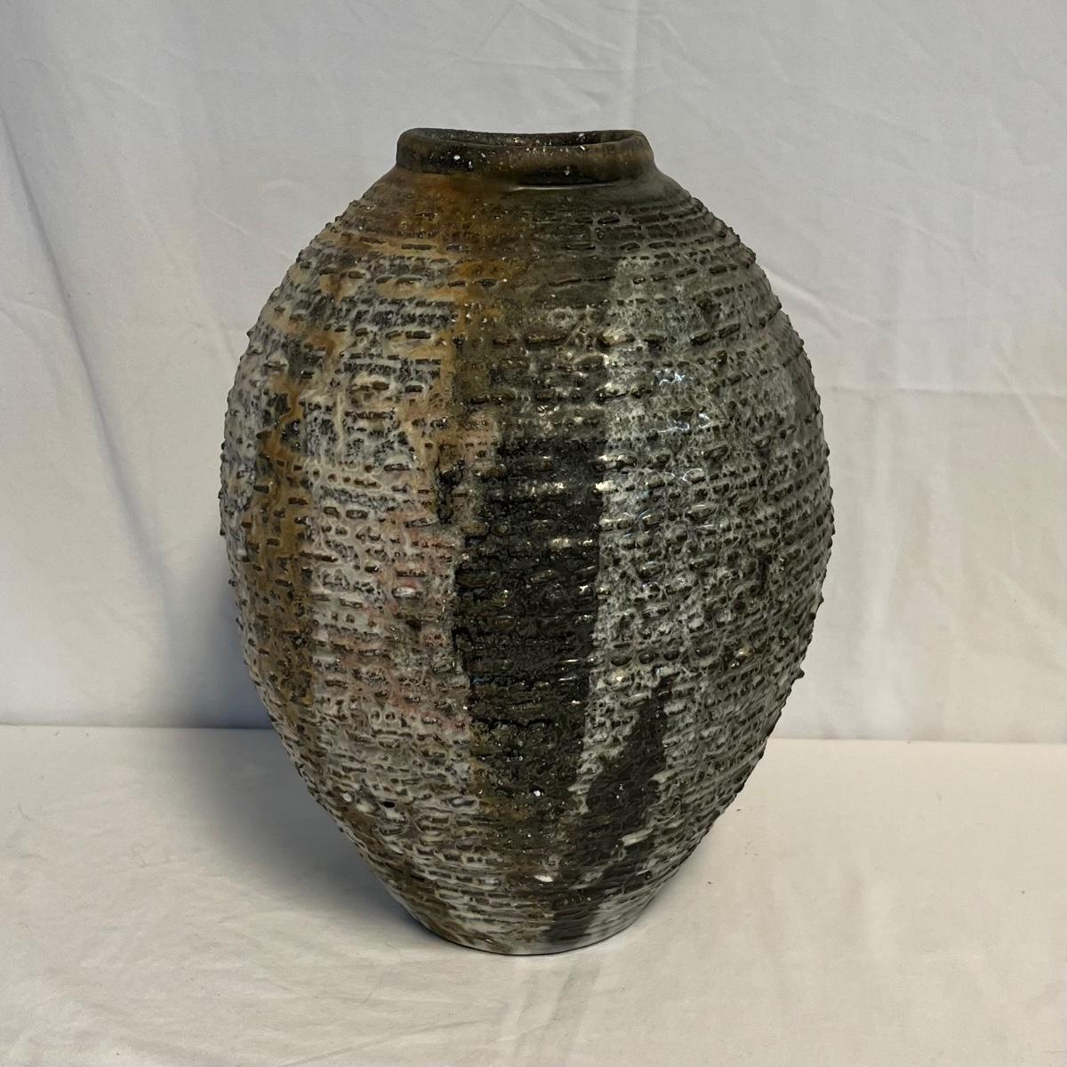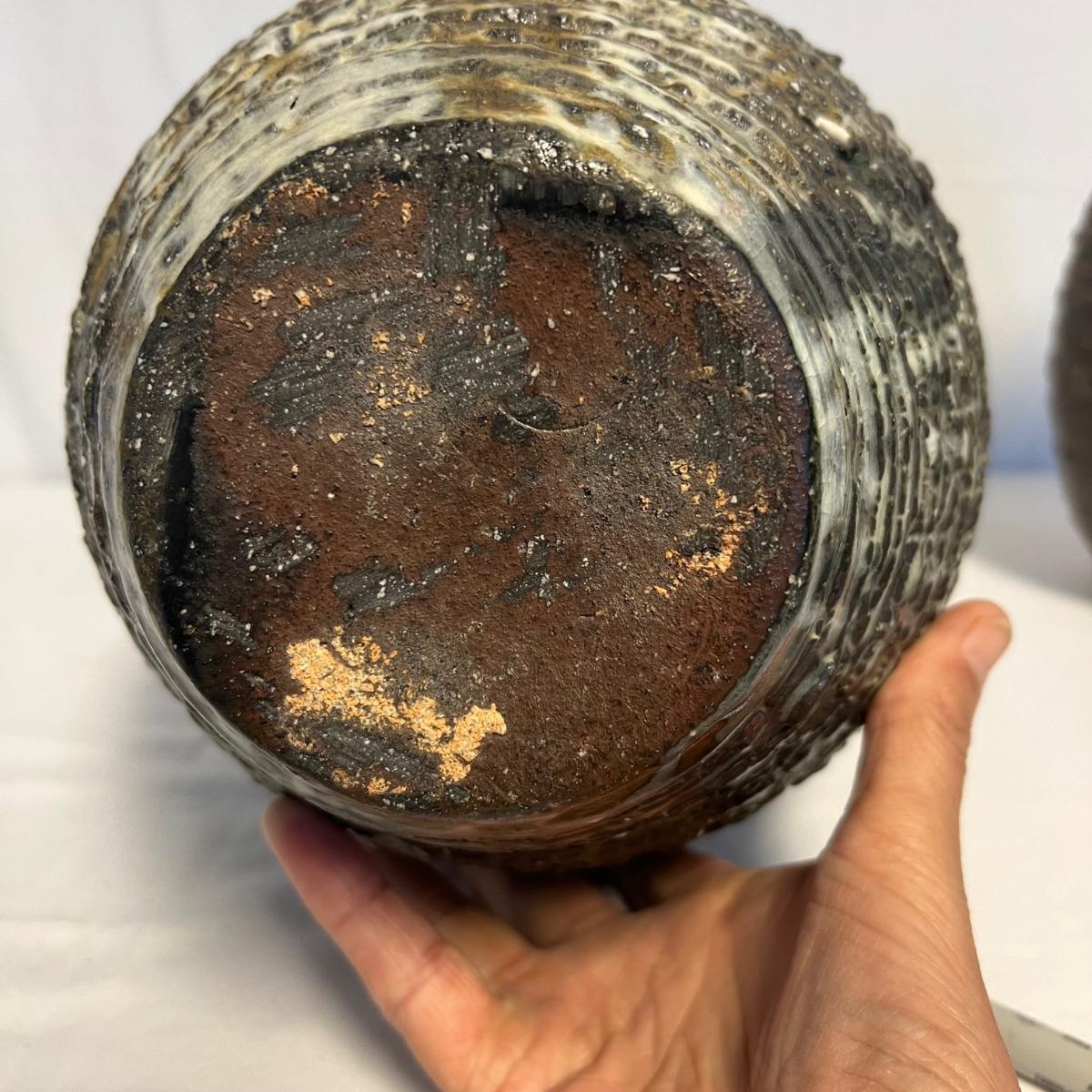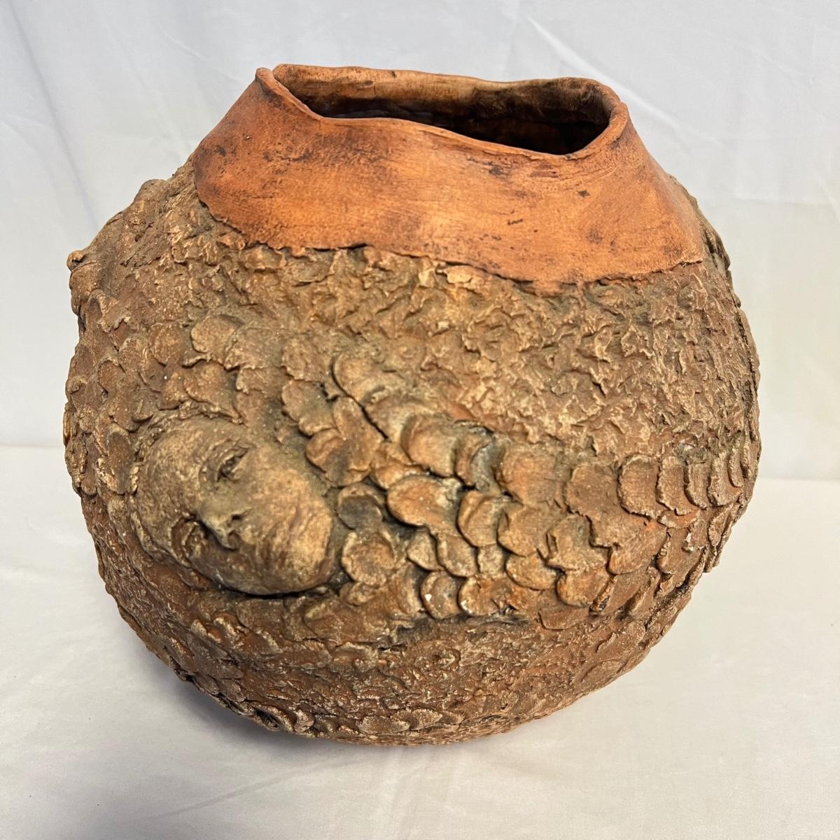 Two unique pottery vessels includes an unglazed piece that features sculpted faces. The taller piece is also textured with various matte colors in its glazes; it measures 9" D (widest point) x 13" H.