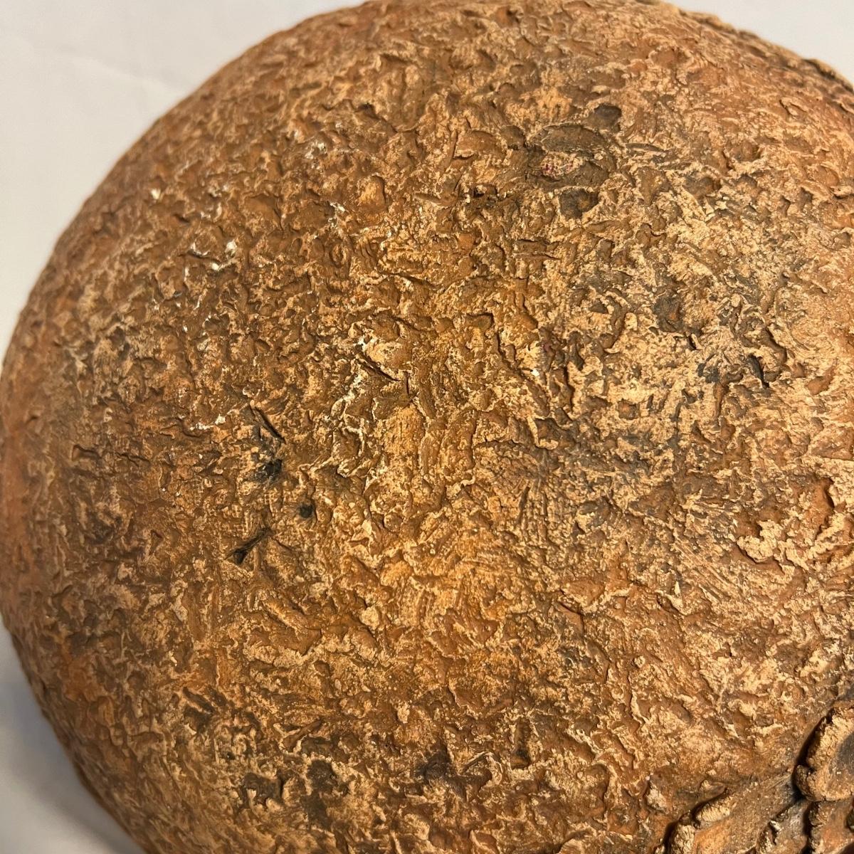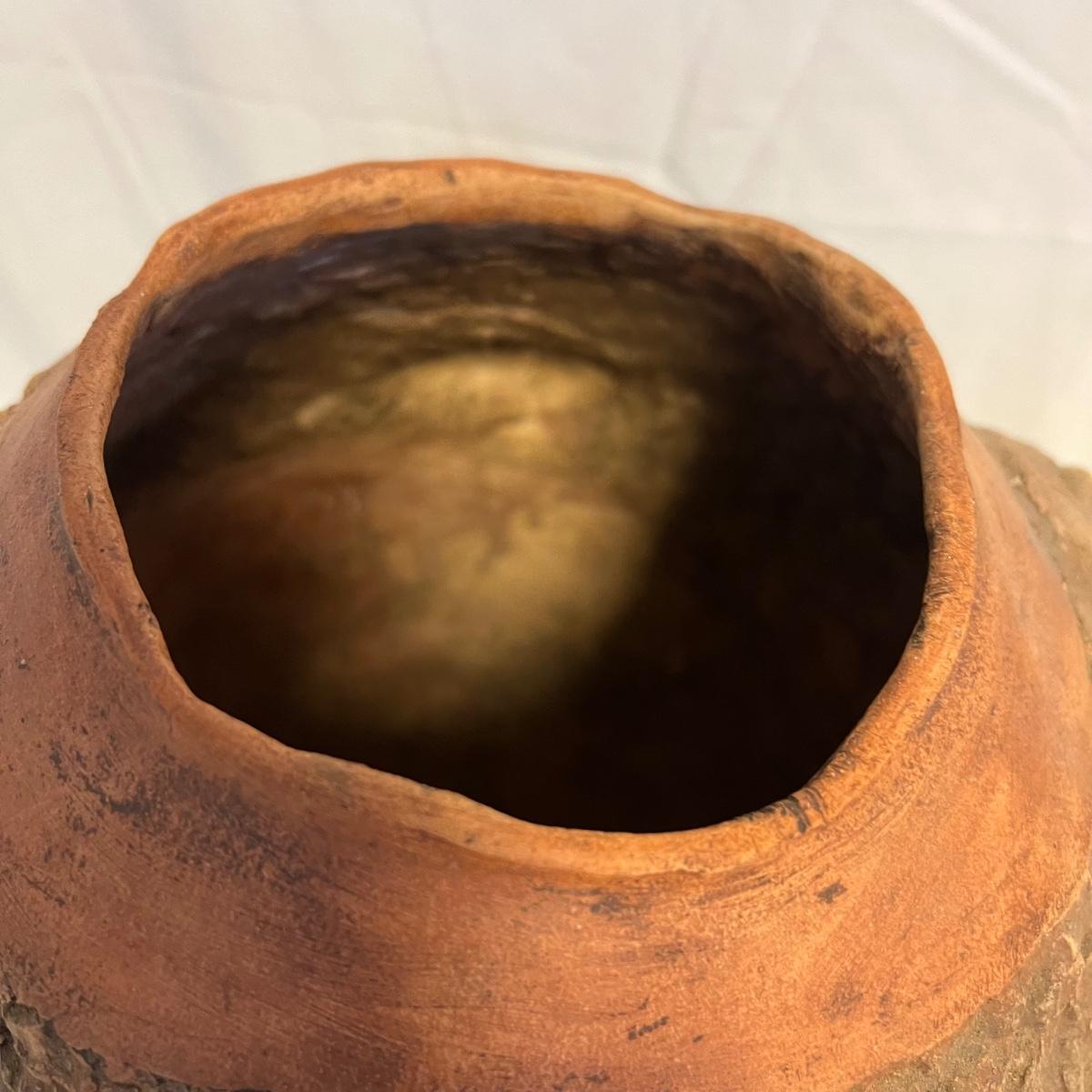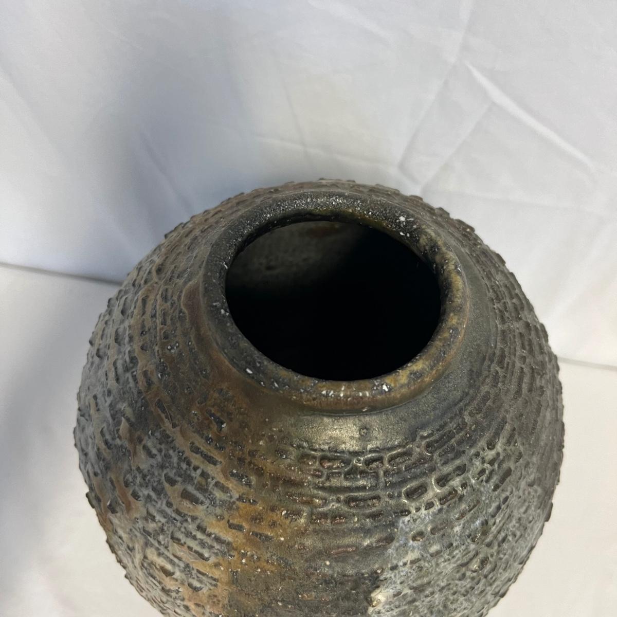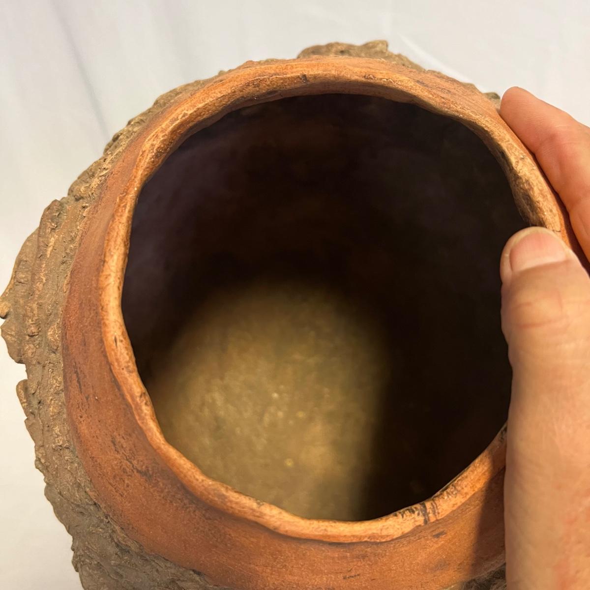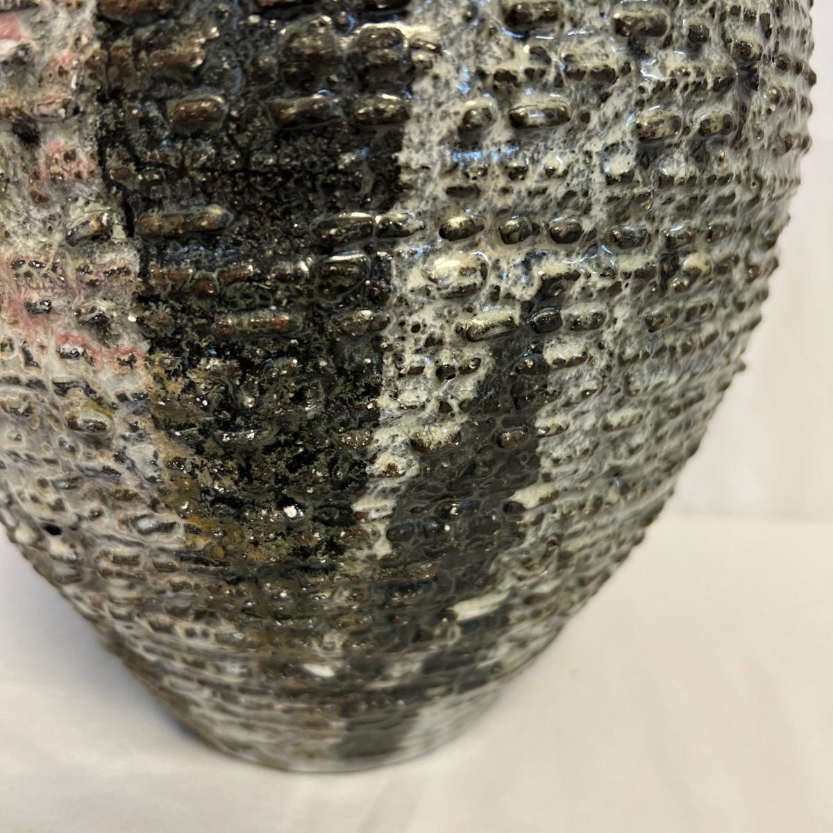 Two unique pottery vessels includes an unglazed piece that features sculpted faces. The taller piece is also textured with various matte colors in its glazes; it measures 9" D (widest point) x 13" H.