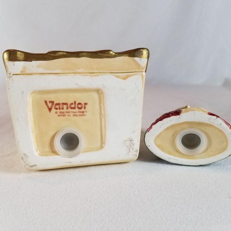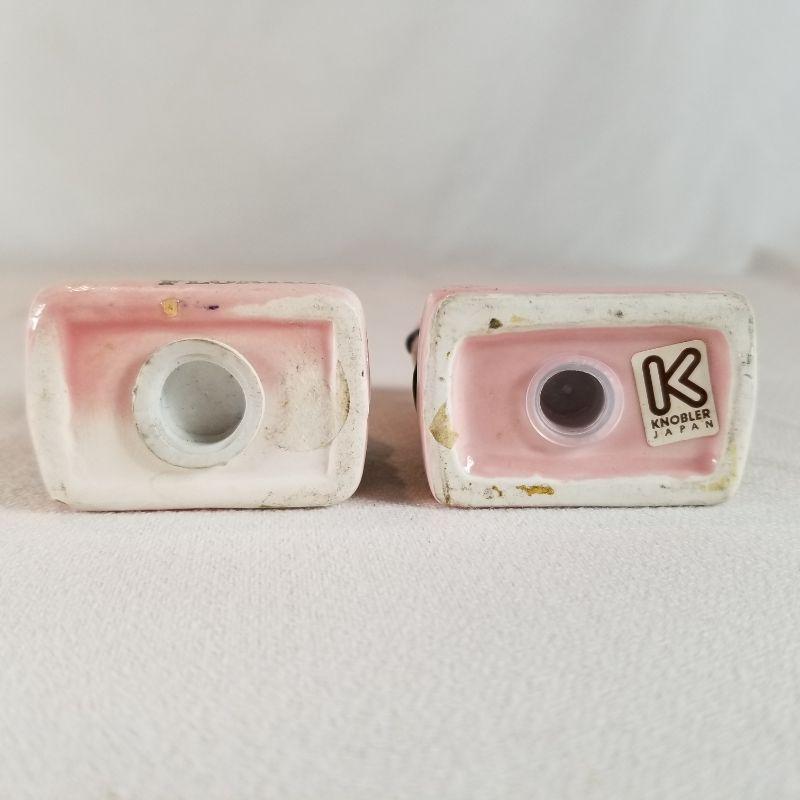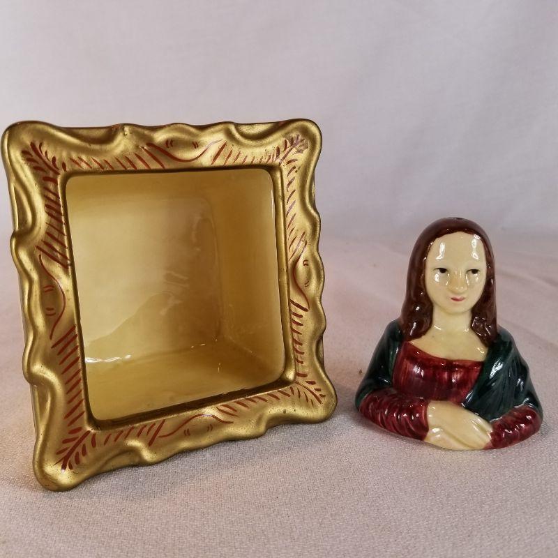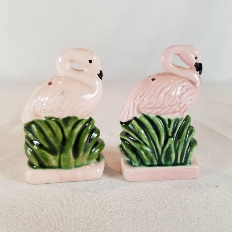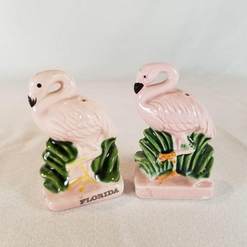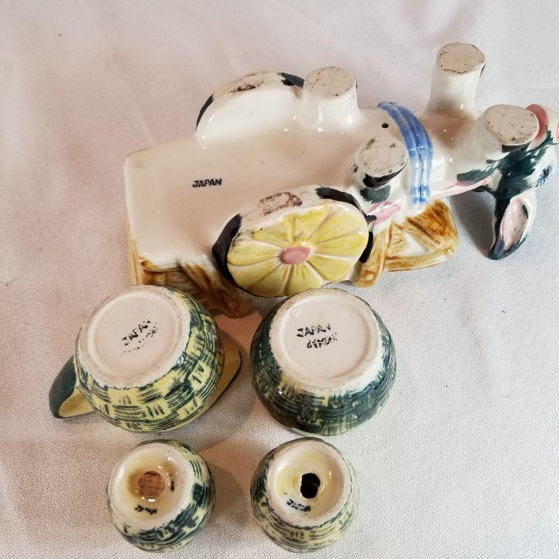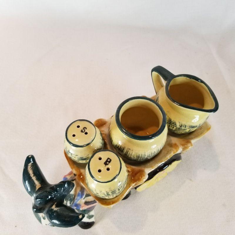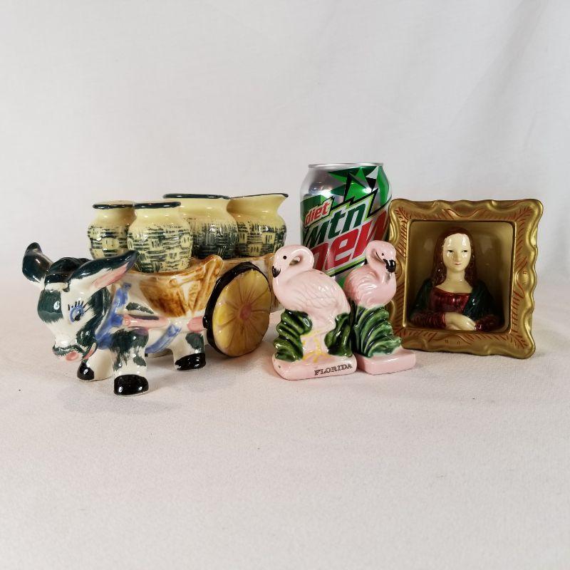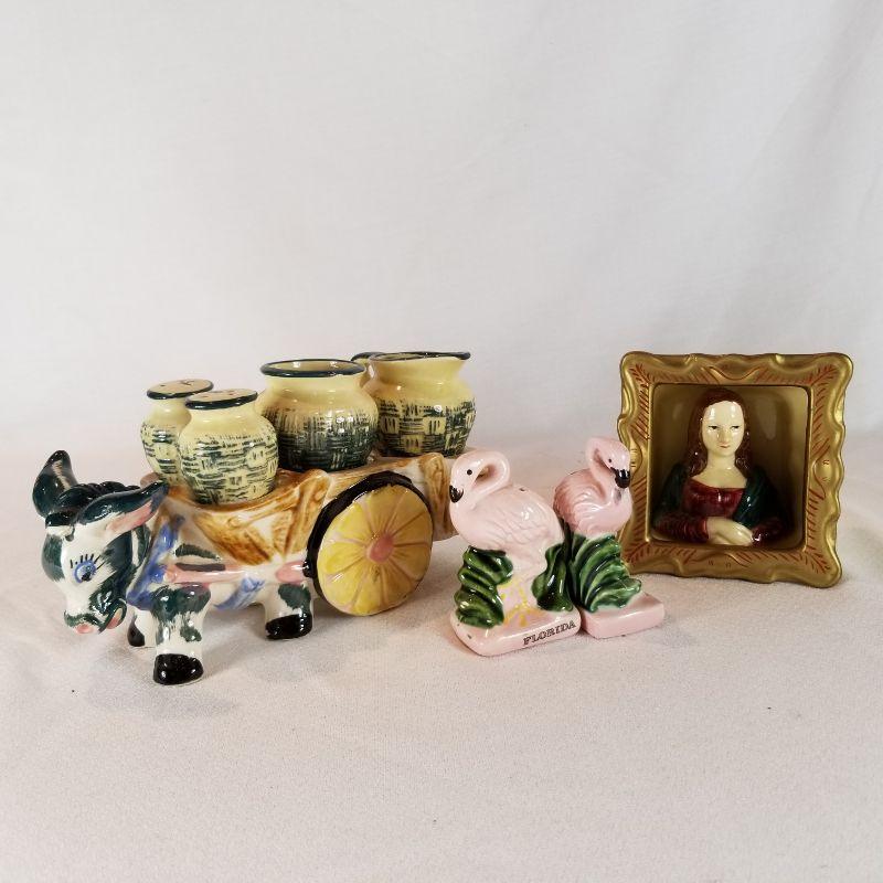 This fun collection includes a Donkey with cart carrying jugs of salt and pepper plus creamer and sugar pots. Marked Japan. One of the salt and pepper shakers is missing it's stopper, but easily replaced. A pair of Florida Flamingos salt and pepper shakers. One is marked Florida, Marked on bottom is Knobler Japan. and best of all is the Mona Lisa salt and pepper shaker set - So Unique. Marked Vandor on bottom, Made in Sri Lanka.