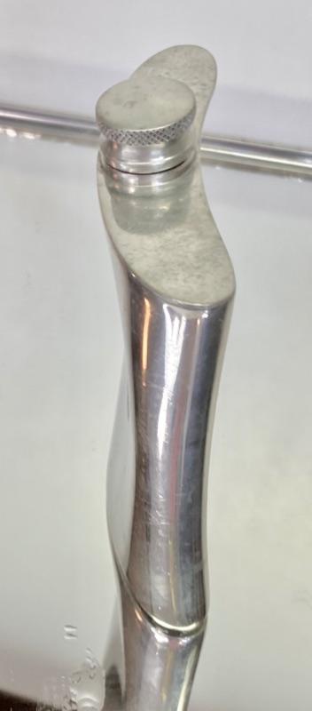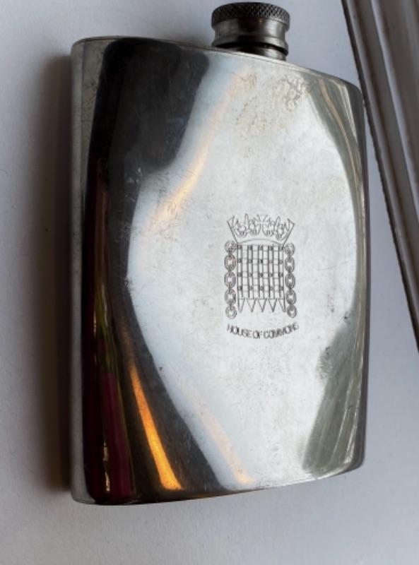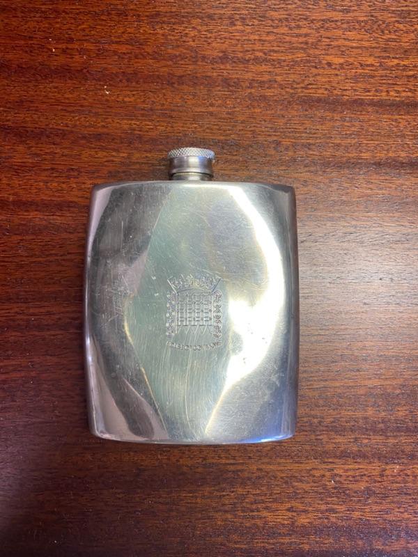 Traditional Vintage hip flask by Sheffield Rose English pewter. Rare engraving of The House of Commons Shield.