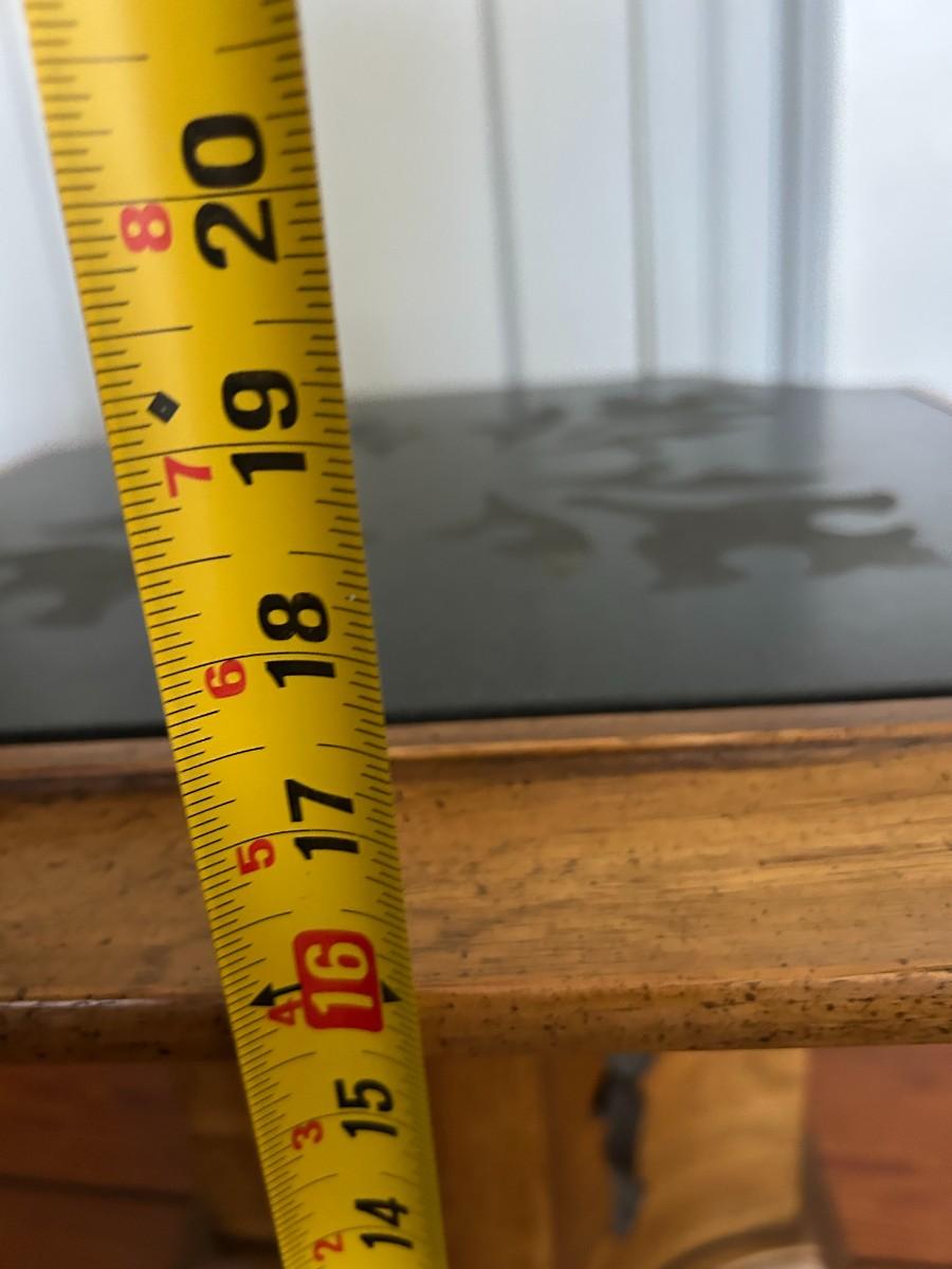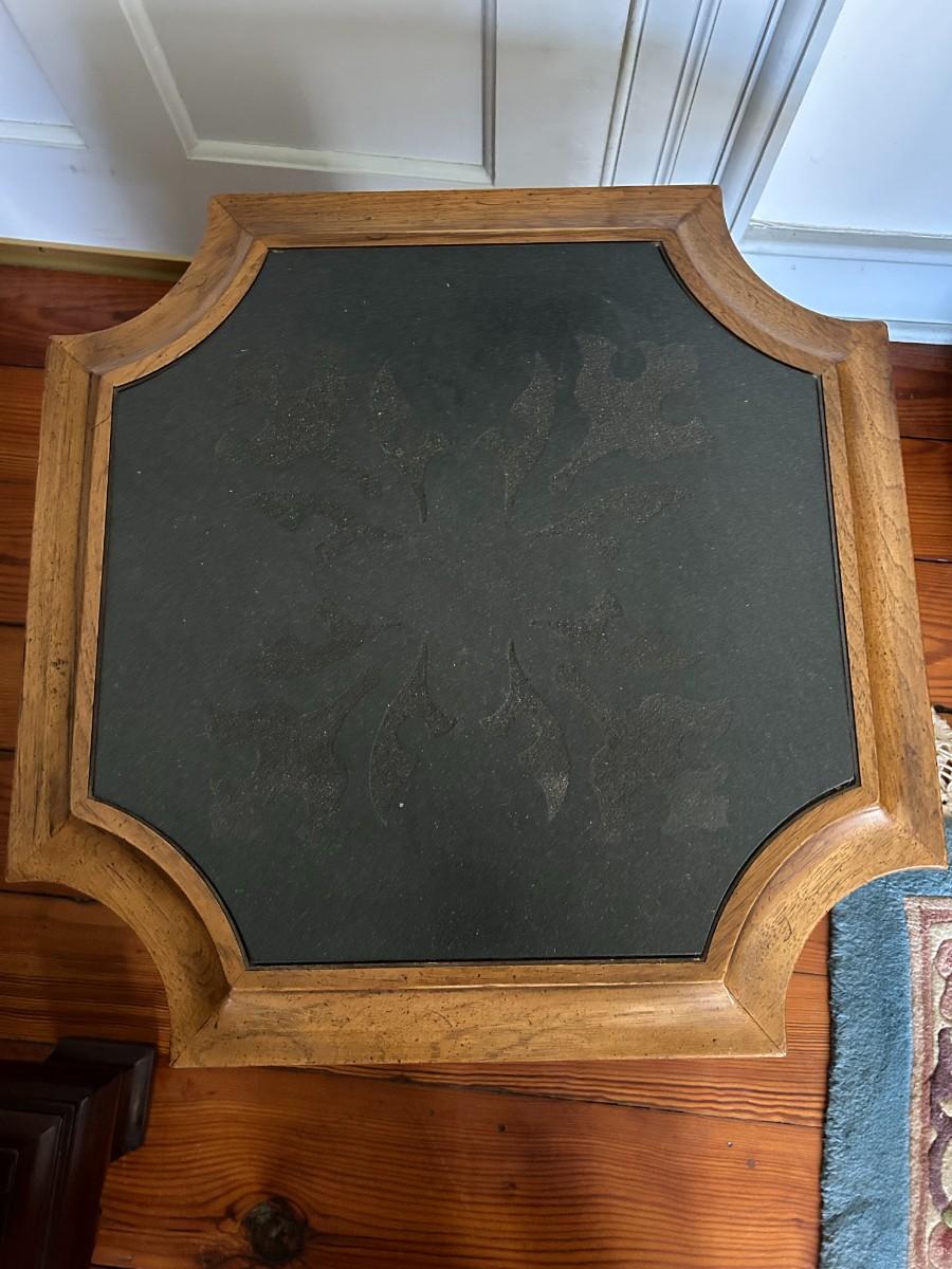 This square table with curved indentations on each side and a stone top has pattern cut out allowing you to see through the table's legs.