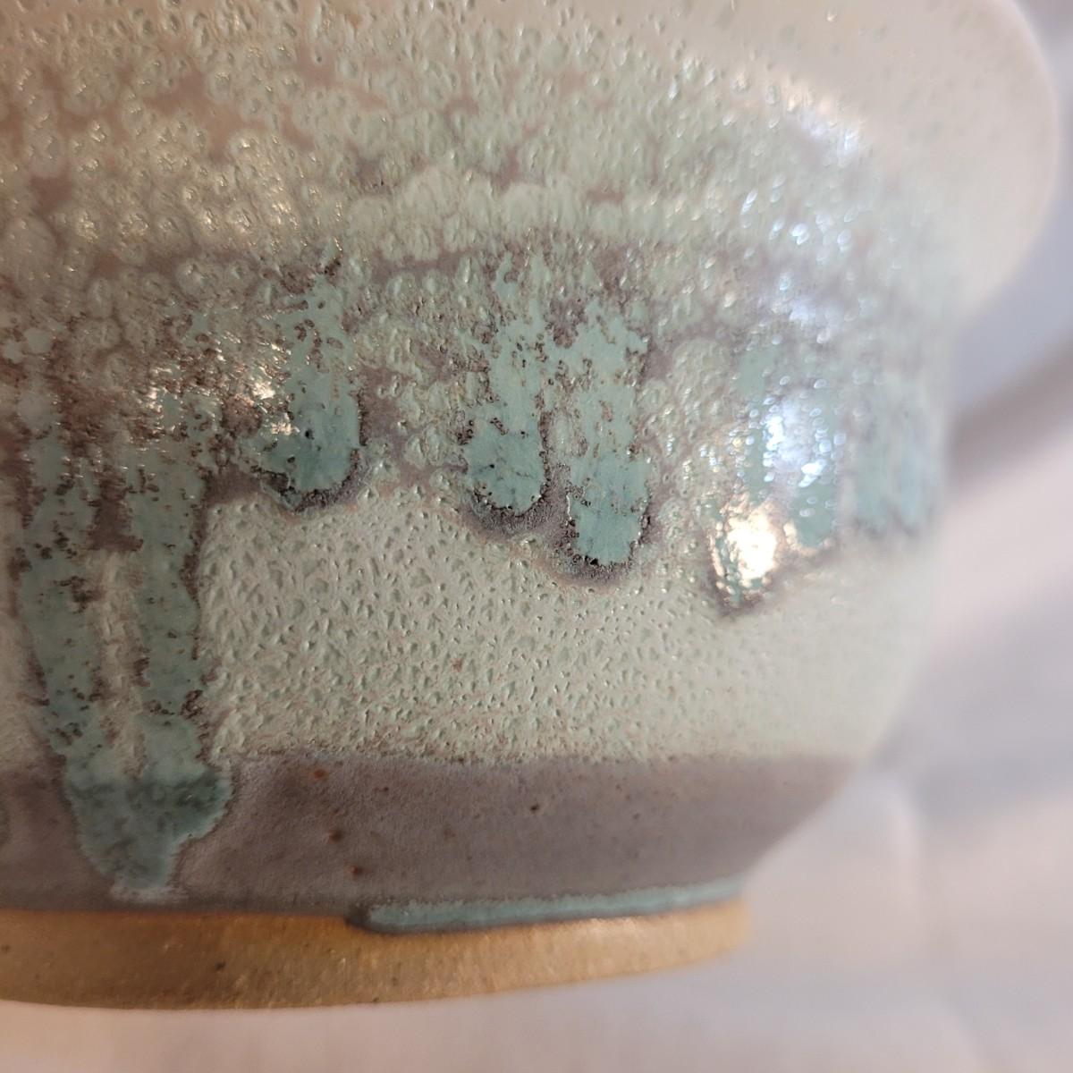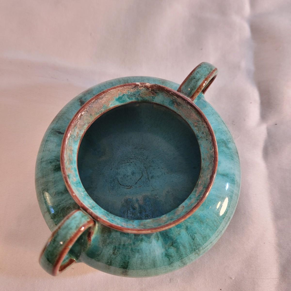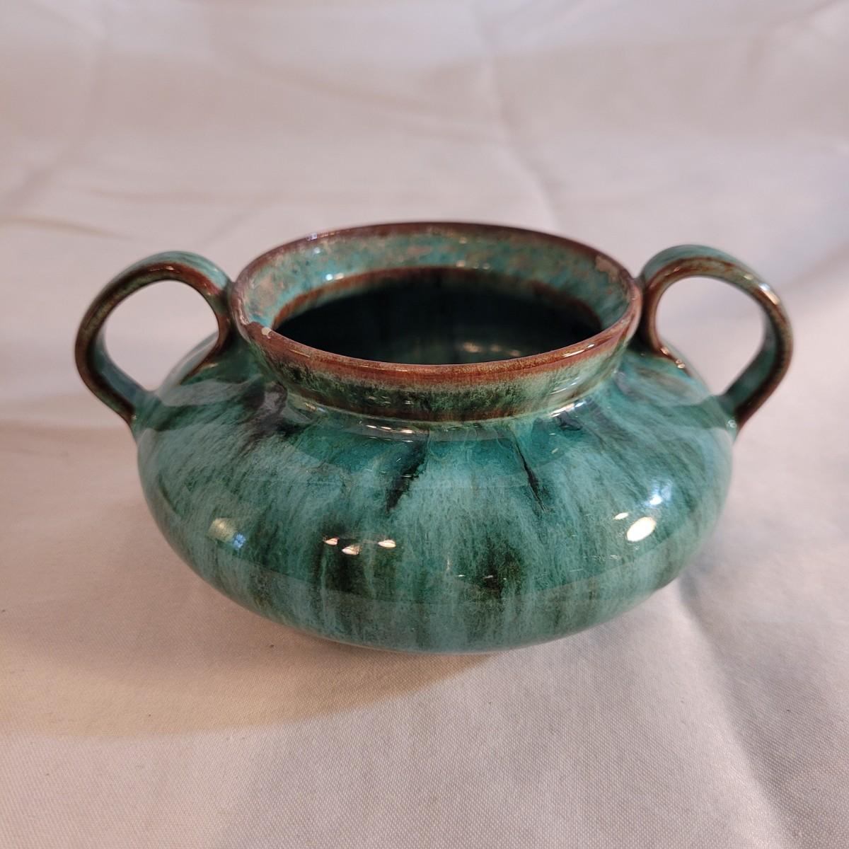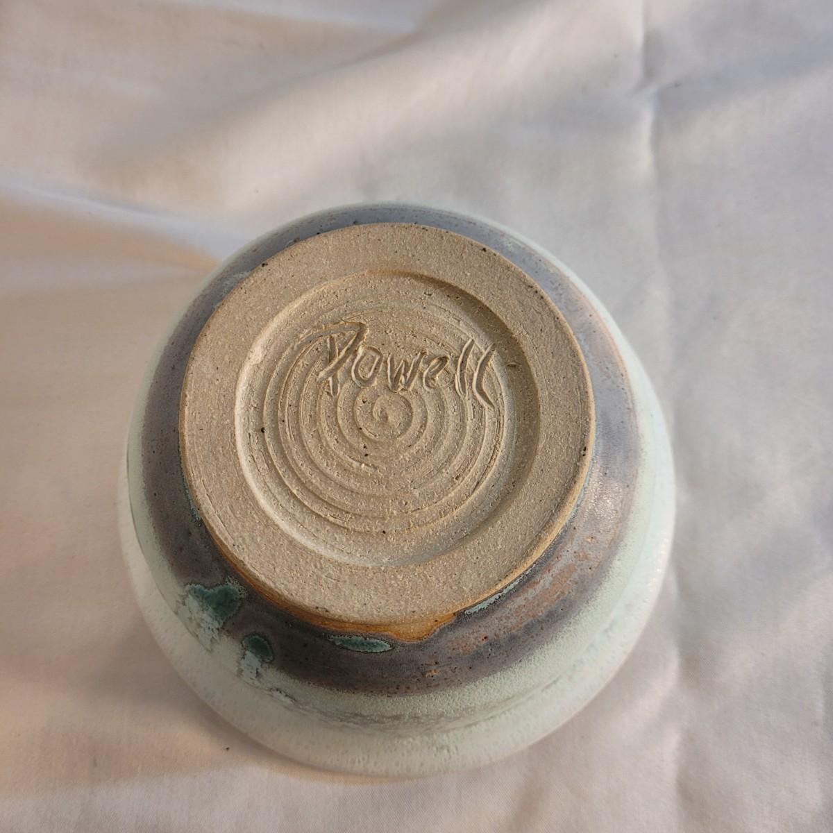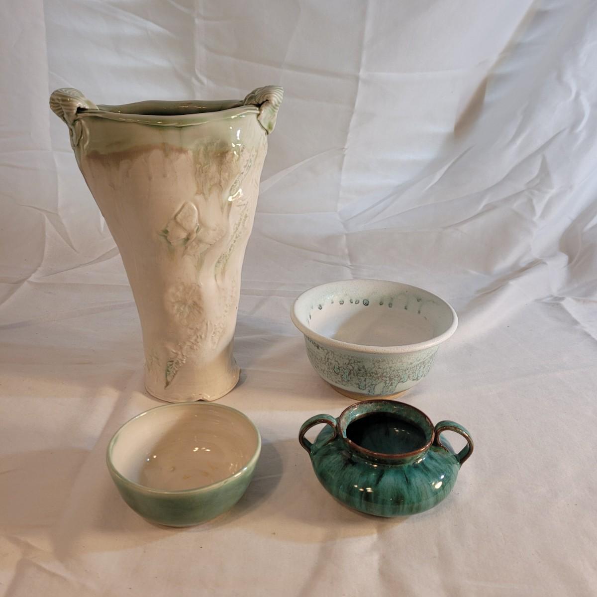 A lovely collection of unique pottery pieces in a many shades of blue. Large bowl is signed by "Powell," and small bowl made by Pisgah Forest Pottery. Some chipping on small vessel (see photos), other pieces in excellent condition. Vase measures approximately 8"W at opening x11"H. Shipping available.