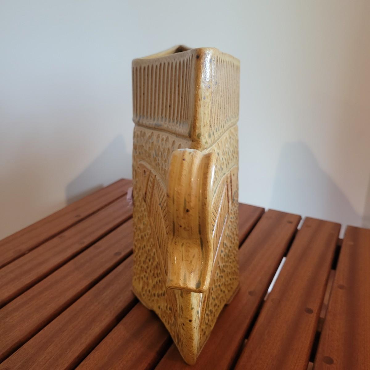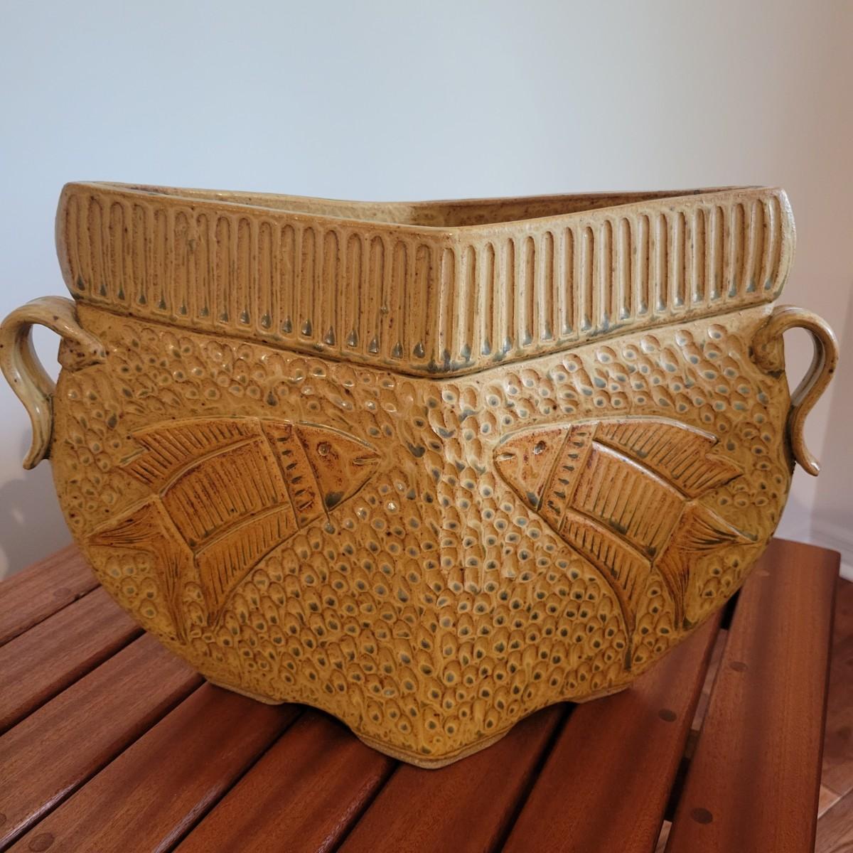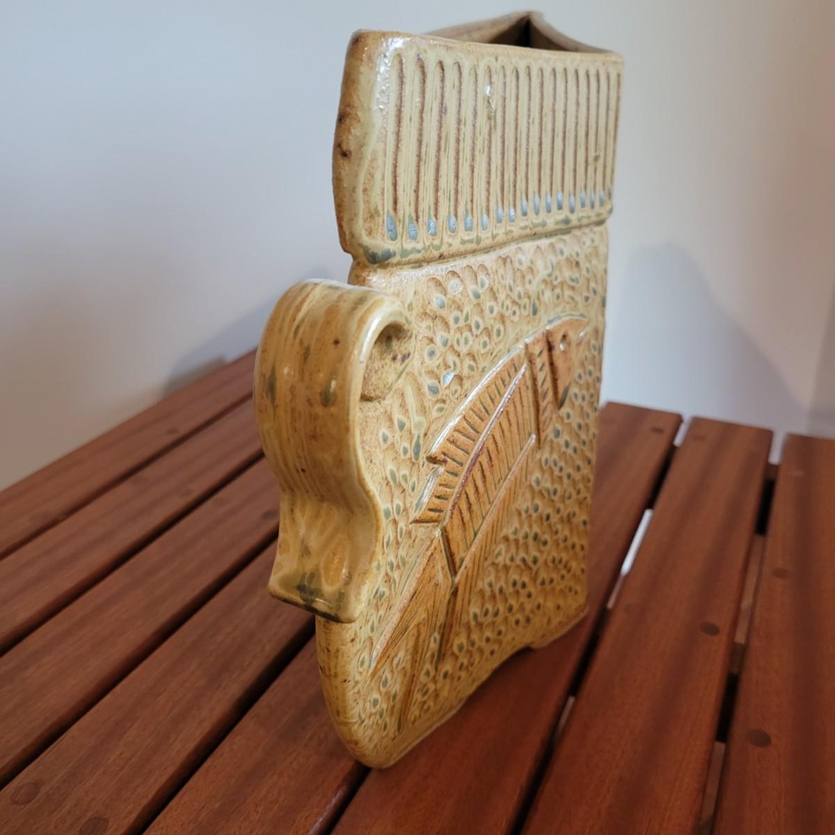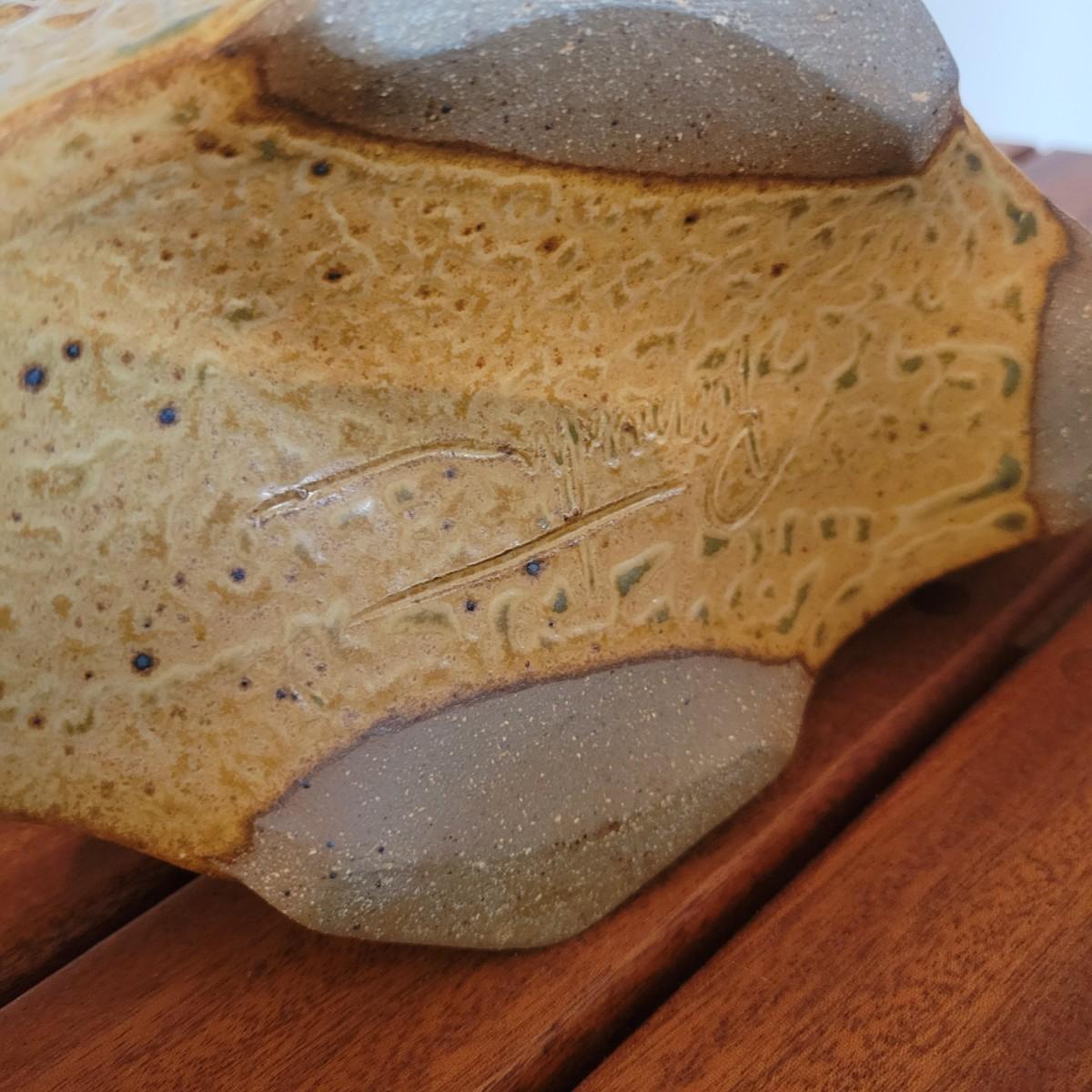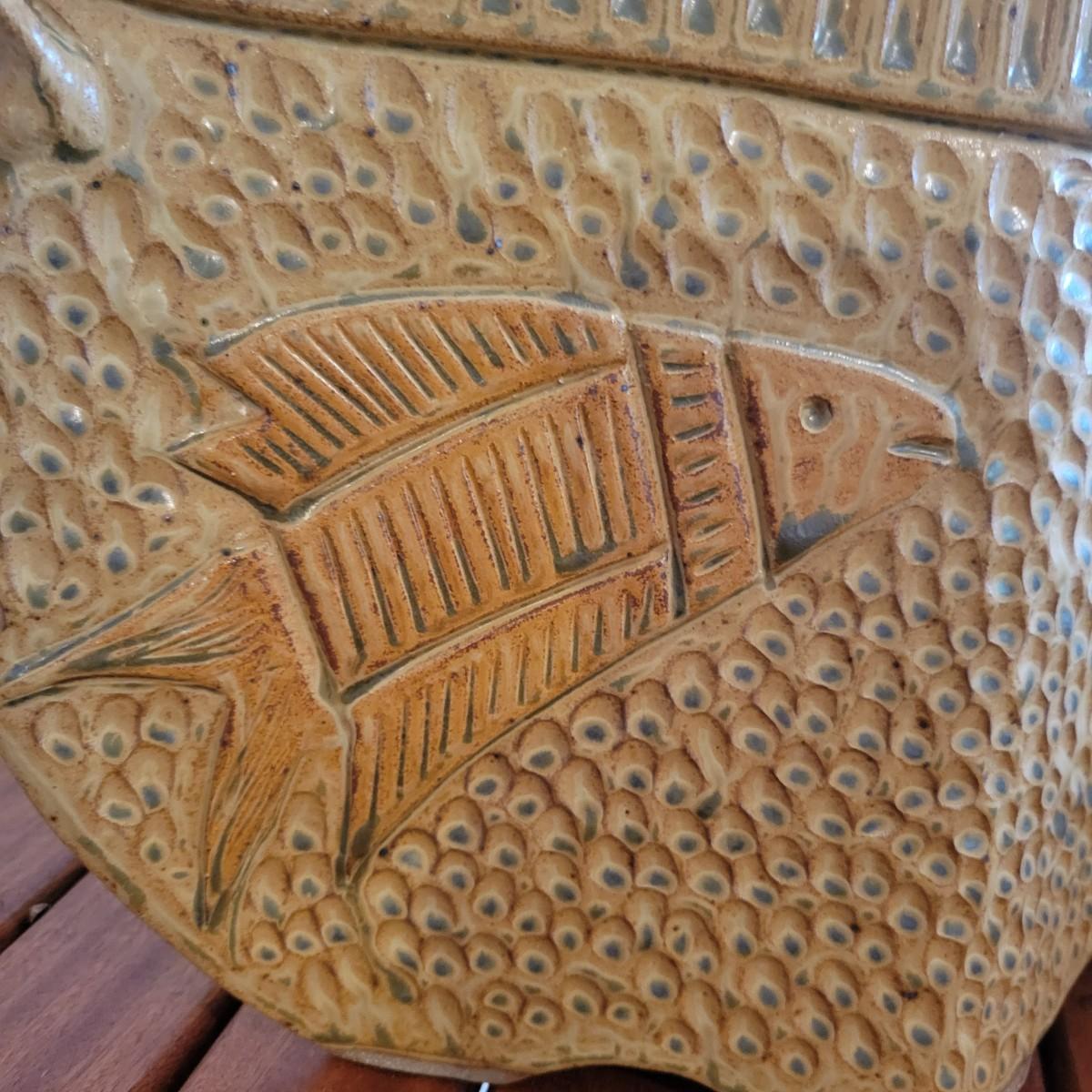 A unique vessel of handcrafted pottery by Jim & Shirl Parmentier Pottery. This piece features primitive styled fish on a textured background that is a sandy cream color with grey accents. It measures approximately 15.5" x 4.5" x 10.5". Shipping available. Shipping can be costly. We suggest contacting our preferred local shipping provider, Postage Express, with dimensions and getting an estimate before bidding: (828) 670-5501 or postageexpress@yahoo.com.