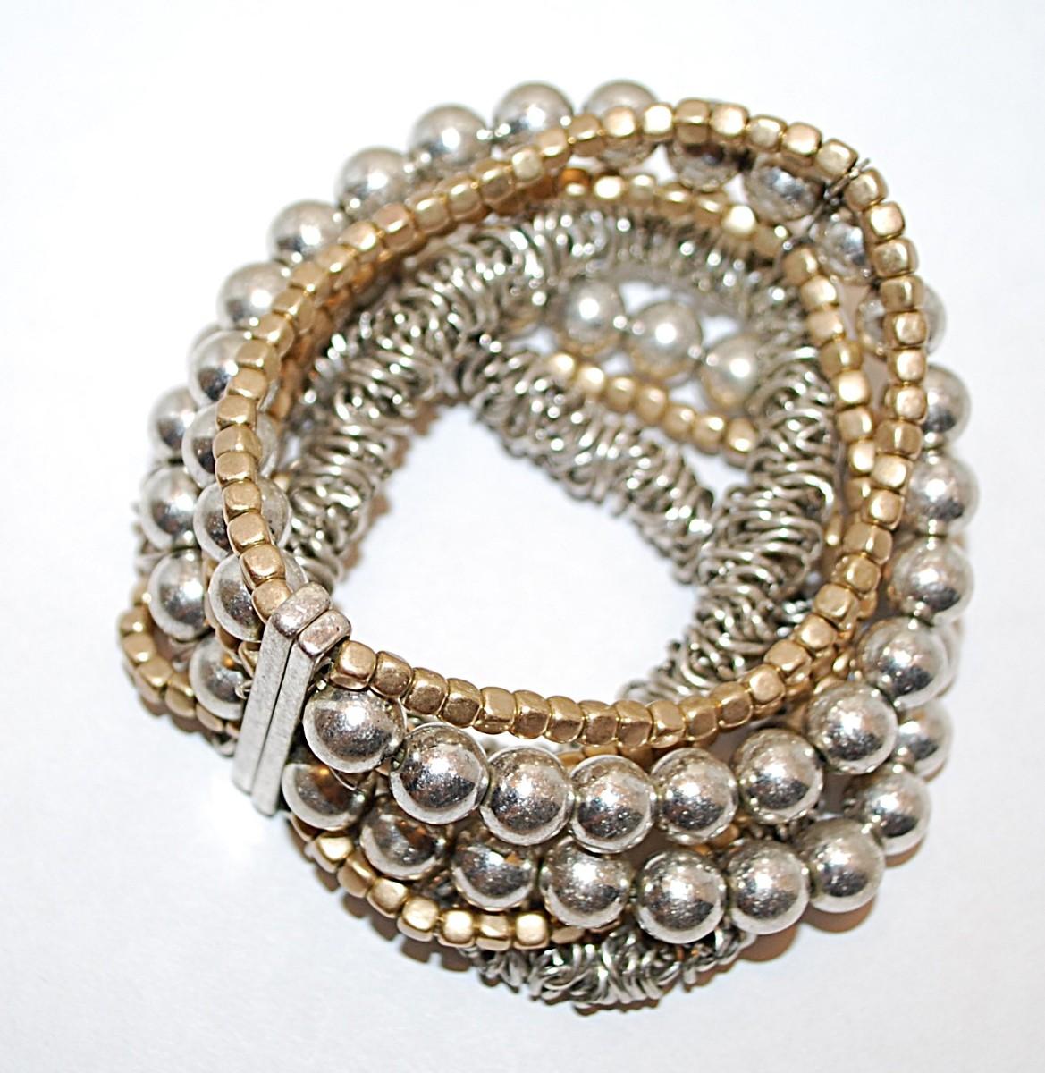 Unique Silver & Gold Tone BRACELET (2¾" Opening) with 7 Rows of Globes, Squares and Clustered Loop Designs & NO Clasp