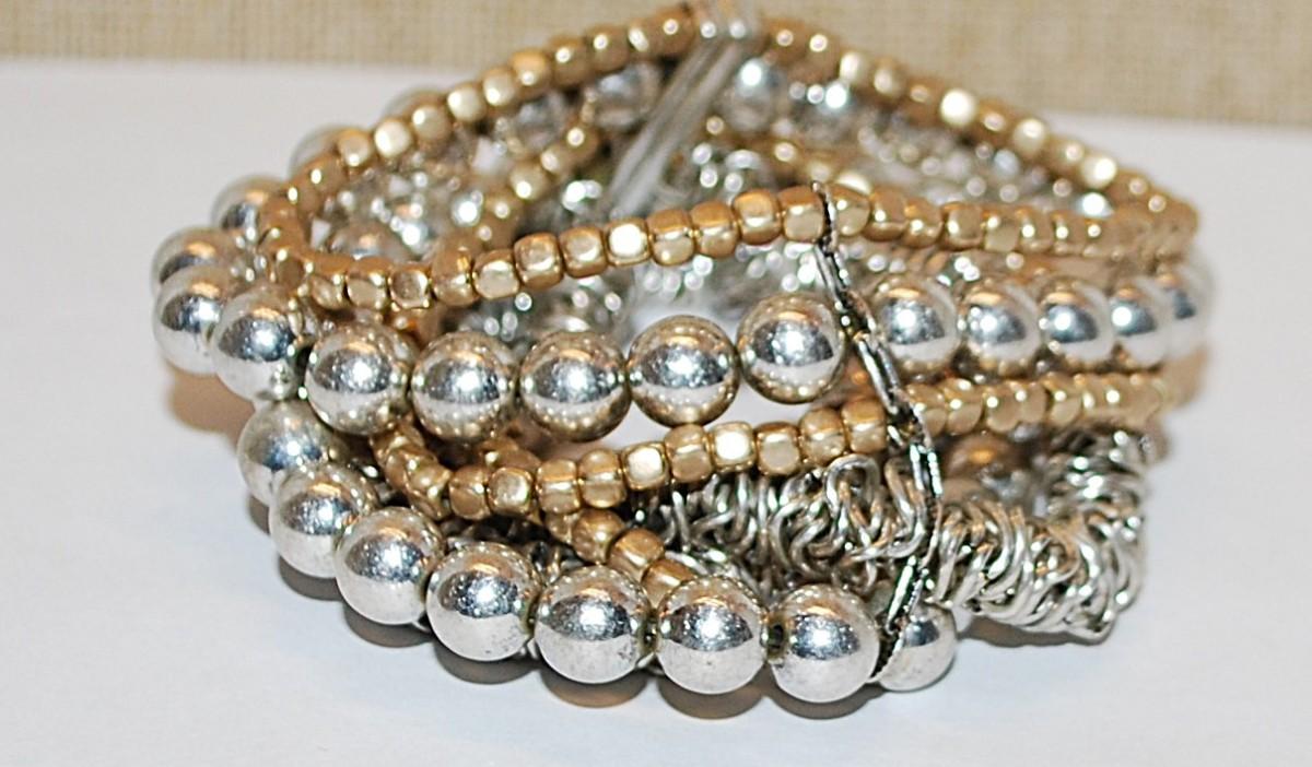 Unique Silver & Gold Tone BRACELET (2¾" Opening) with 7 Rows of Globes, Squares and Clustered Loop Designs & NO Clasp