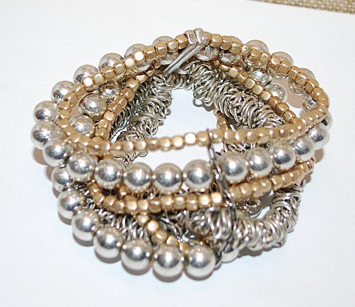 Unique Silver & Gold Tone BRACELET (2¾" Opening) with 7 Rows of Globes, Squares and Clustered Loop Designs & NO ClaspWE COMBINE SHIPPING --FOR THIS LOT ONLY IS $6.00 -- BUY 4 OR MORE LOTS AND SHIPPING IS FREE!!